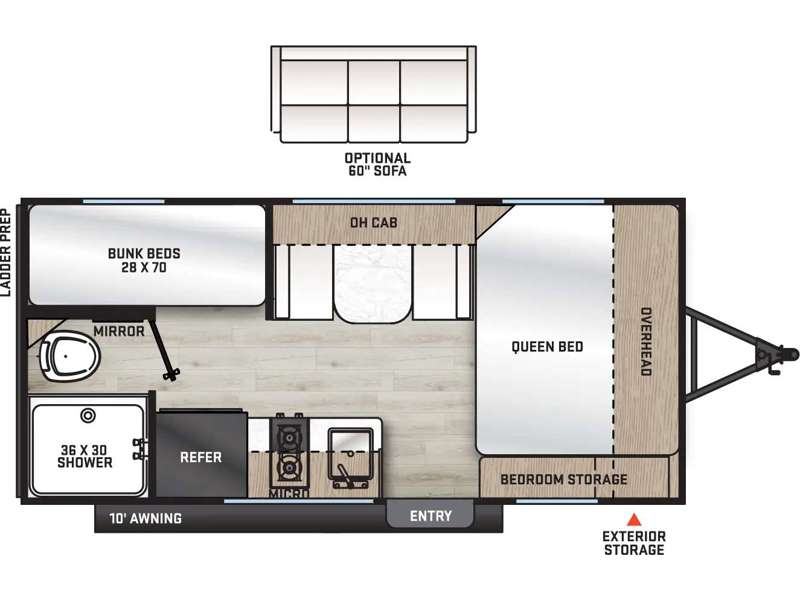 This travel trailers is perfect for a young family or smaller group. You can easily sleep four or more with the rear set of bunk beds and queen bed up front. There is also a 60" sofa for inside down-time, as well as complete kitchen and bath amenities so you can cook and stay clean while traveling. The rear corner bath features a toilet and 36" x 30" shower, and it's conveniently located next to the bunk beds which is great for little ones at night. Cooking inside will be easy with a GE stainless two-burner cooktop and single sink, plus there is also a GE microwave oven for snacks and things that you can easily warm up. If you plan to spend most of your time outdoors, you will find plenty of storage space in the front exterior storage compartment, and there is also plenty of storage inside as well.