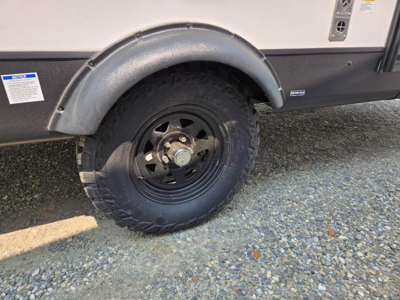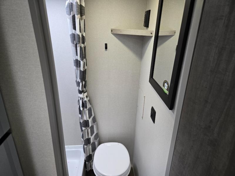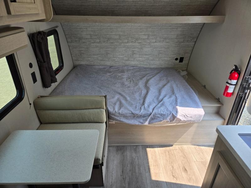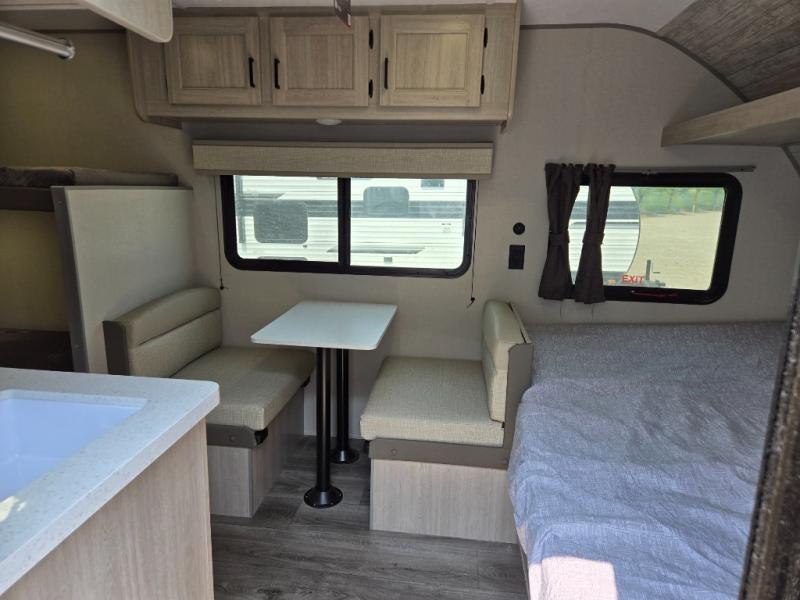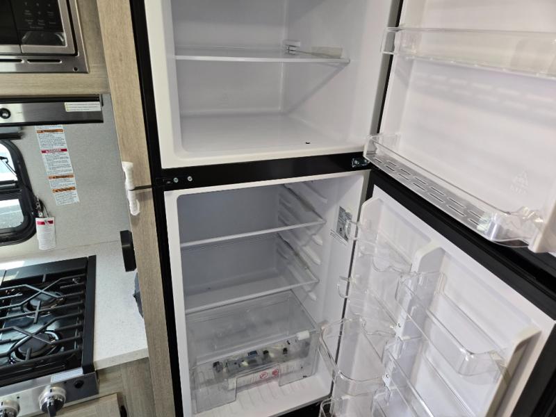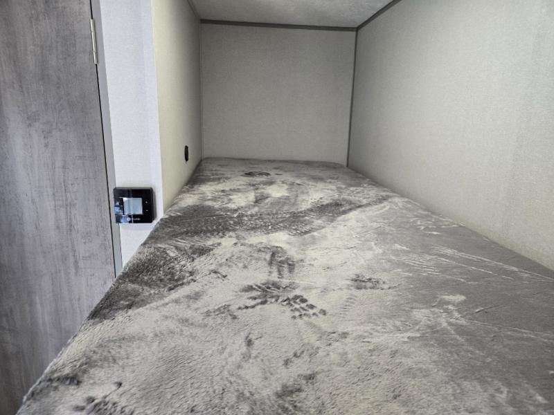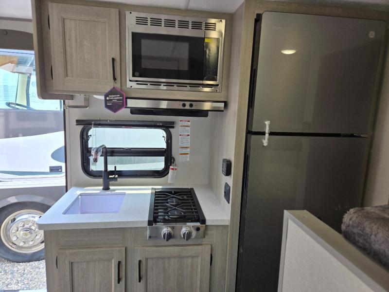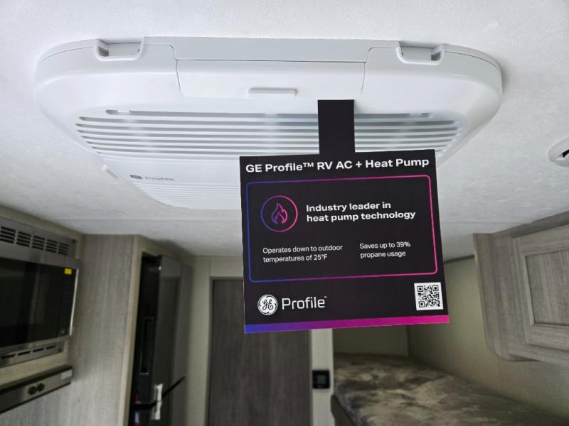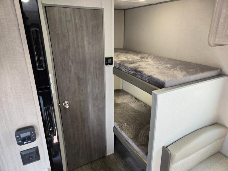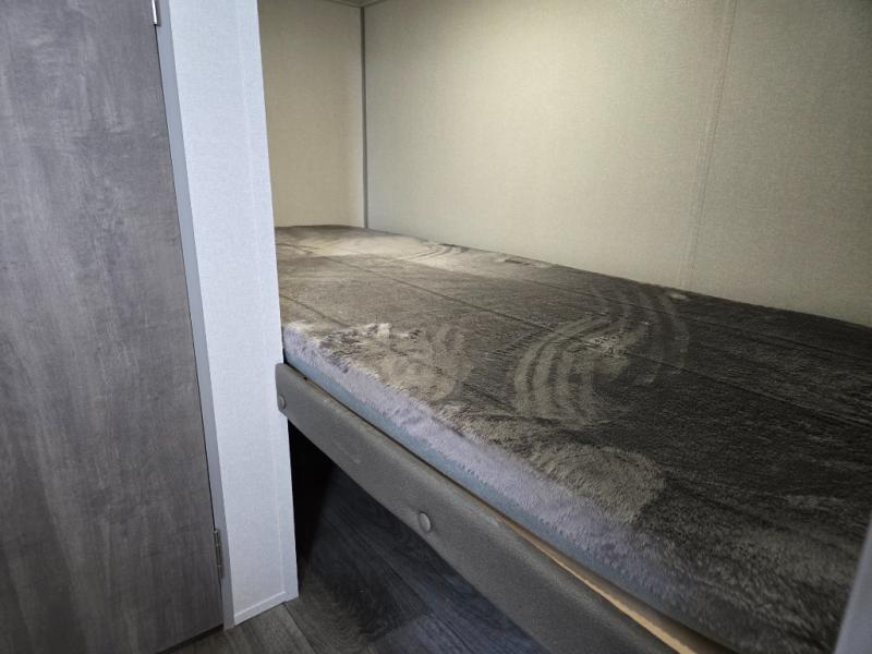 This travel trailers is perfect for a young family or smaller group. You can easily sleep four or more with the rear set of bunk beds and queen bed up front. There is also a 60" sofa for inside down-time, as well as complete kitchen and bath amenities so you can cook and stay clean while traveling. The rear corner bath features a toilet and 36" x 30" shower, and it's conveniently located next to the bunk beds which is great for little ones at night. Cooking inside will be easy with a GE stainless two-burner cooktop and single sink, plus there is also a GE microwave oven for snacks and things that you can easily warm up. If you plan to spend most of your time outdoors, you will find plenty of storage space in the front exterior storage compartment, and there is also plenty of storage inside as well.