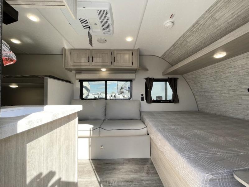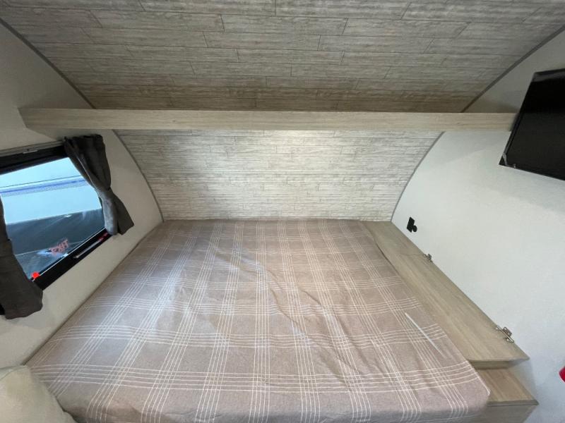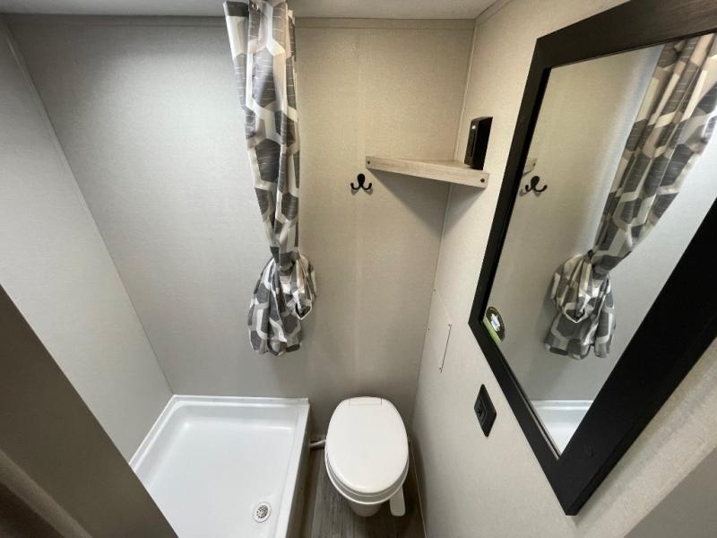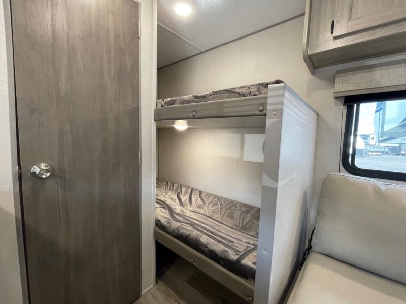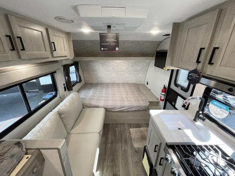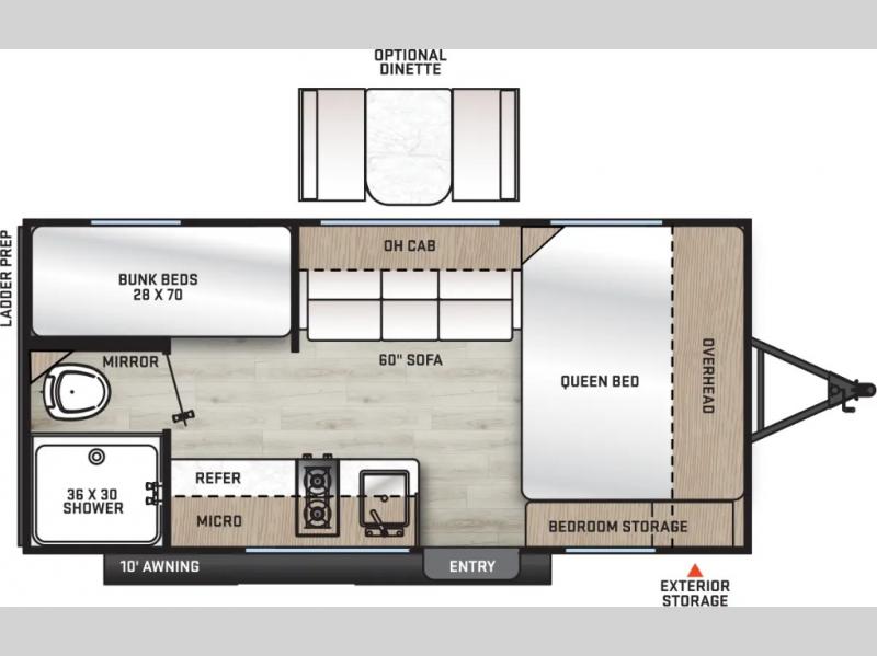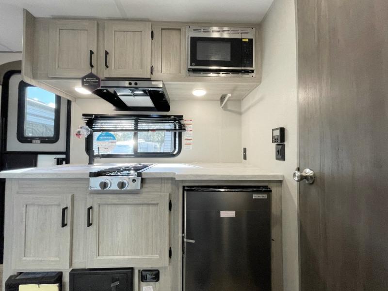 This travel trailers is perfect for a young family or smaller group. You can easily sleep four or more with the rear set of bunk beds and queen bed up front. There is also a 60" sofa for inside down-time, as well as complete kitchen and bath amenities so you can cook and stay clean while traveling. The rear corner bath features a toilet and 36" x 30" shower, and it's conveniently located next to the bunk beds which is great for little ones at night. Cooking inside will be easy with a GE stainless two-burner cooktop and single sink, plus there is also a GE microwave oven for snacks and things that you can easily warm up. If you plan to spend most of your time outdoors, you will find plenty of storage space in the front exterior storage compartment, and there is also plenty of storage inside as well.