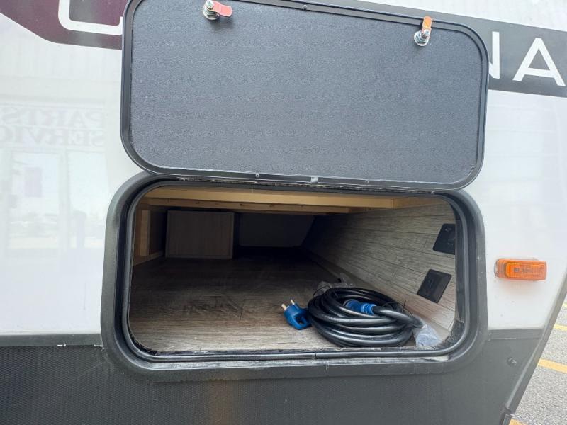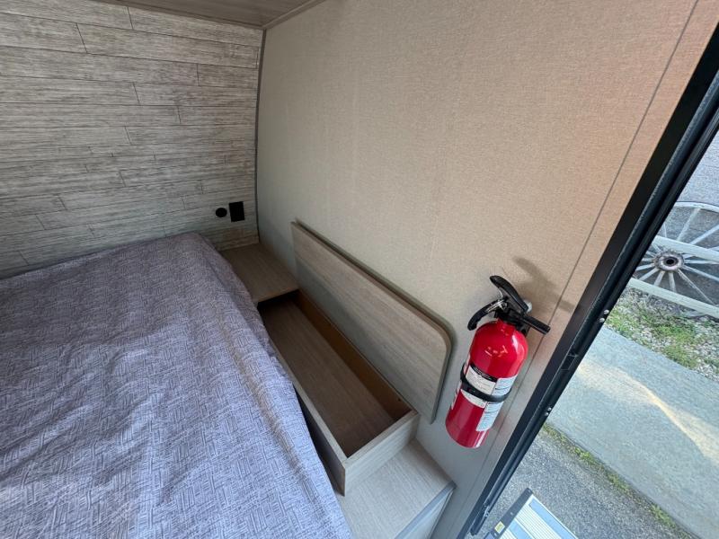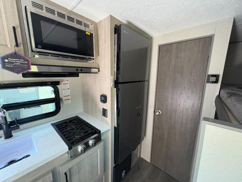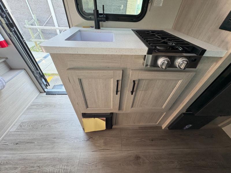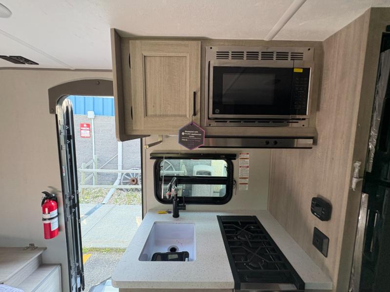 This travel trailers is perfect for a young family or smaller group. You can easily sleep four or more with the rear set of bunk beds and queen bed up front. There is also a 60" sofa for inside down-time, as well as complete kitchen and bath amenities so you can cook and stay clean while traveling. The rear corner bath features a toilet and 36" x 30" shower, and it's conveniently located next to the bunk beds which is great for little ones at night. Cooking inside will be easy with a GE stainless two-burner cooktop and single sink, plus there is also a GE microwave oven for snacks and things that you can easily warm up. If you plan to spend most of your time outdoors, you will find plenty of storage space in the front exterior storage compartment, and there is also plenty of storage inside as well.