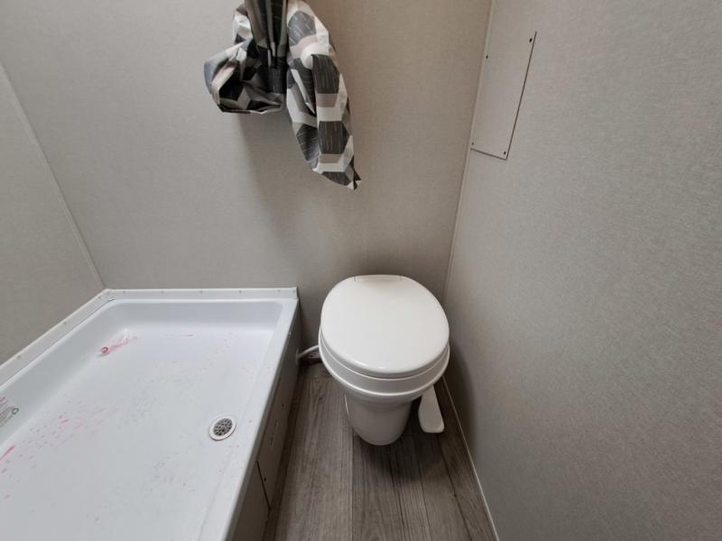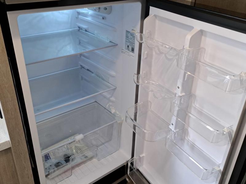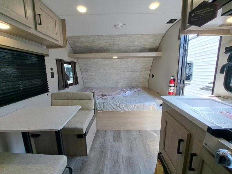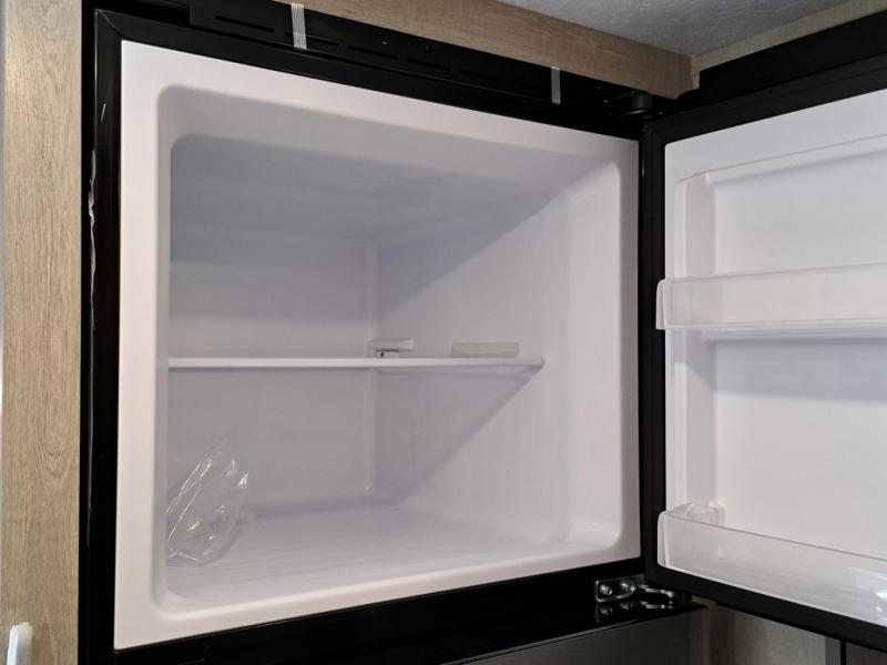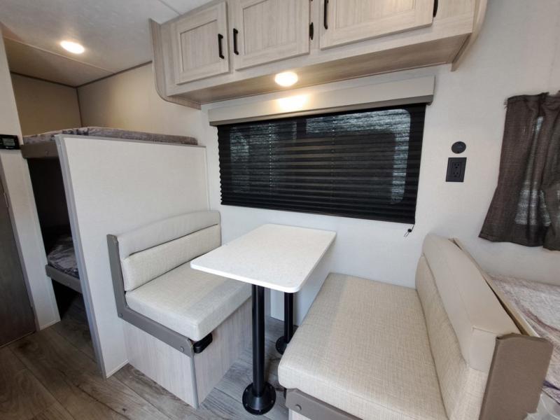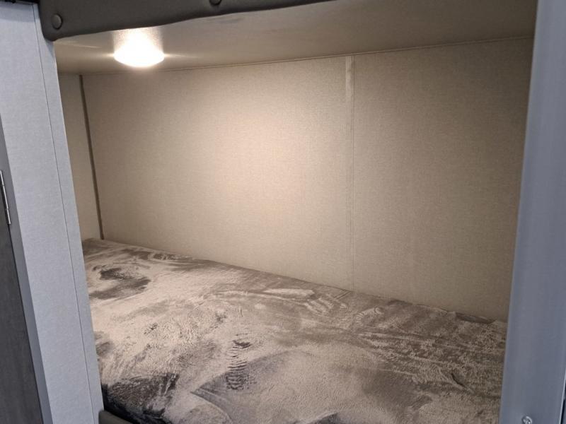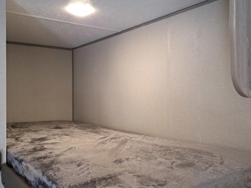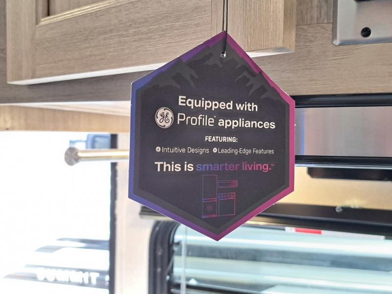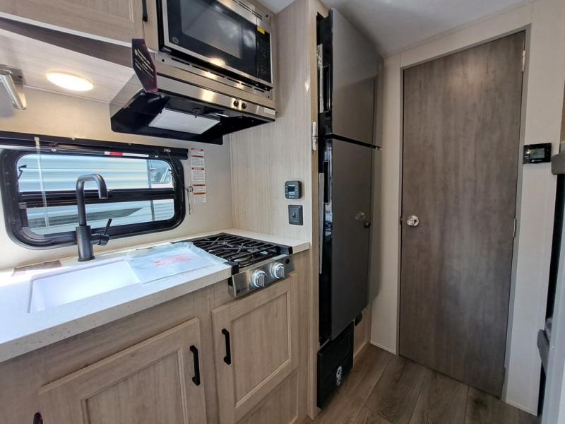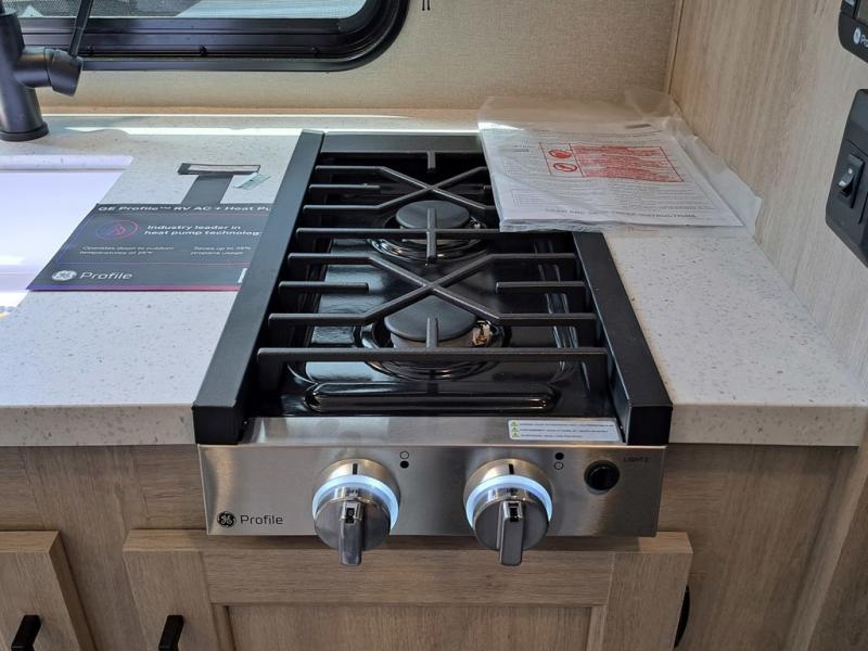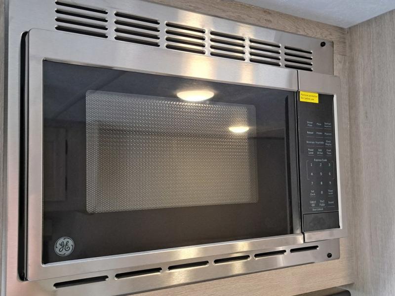 This travel trailers is perfect for a young family or smaller group. You can easily sleep four or more with the rear set of bunk beds and queen bed up front. There is also a 60" sofa for inside down-time, as well as complete kitchen and bath amenities so you can cook and stay clean while traveling. The rear corner bath features a toilet and 36" x 30" shower, and it's conveniently located next to the bunk beds which is great for little ones at night. Cooking inside will be easy with a GE stainless two-burner cooktop and single sink, plus there is also a GE microwave oven for snacks and things that you can easily warm up. If you plan to spend most of your time outdoors, you will find plenty of storage space in the front exterior storage compartment, and there is also plenty of storage inside as well.