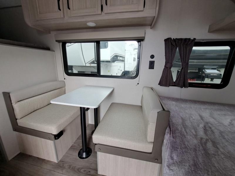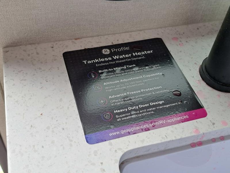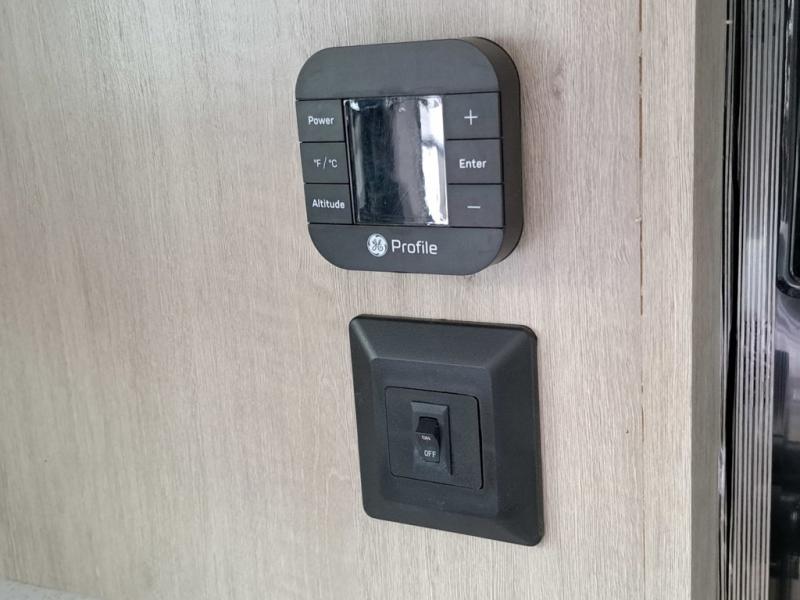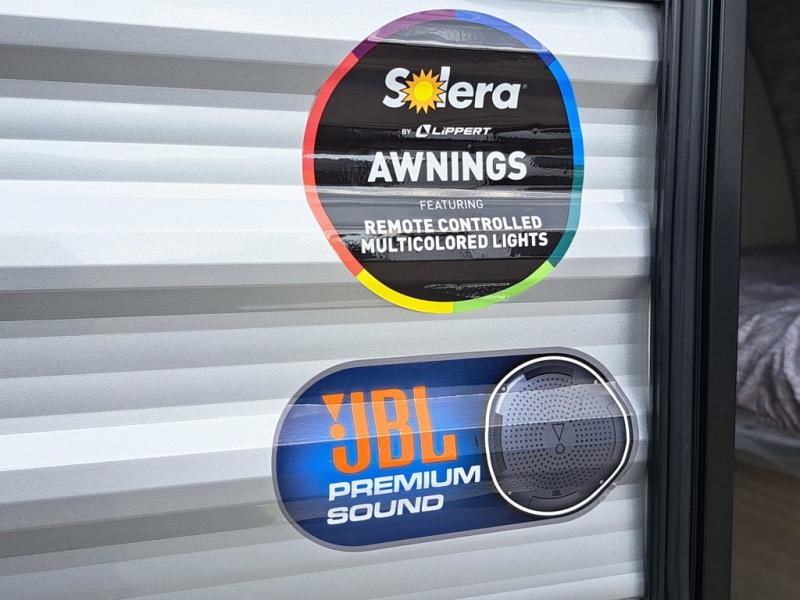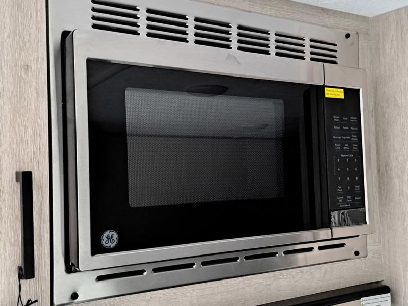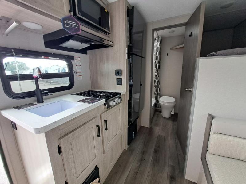 This travel trailers is perfect for a young family or smaller group. You can easily sleep four or more with the rear set of bunk beds and queen bed up front. There is also a 60" sofa for inside down-time, as well as complete kitchen and bath amenities so you can cook and stay clean while traveling. The rear corner bath features a toilet and 36" x 30" shower, and it's conveniently located next to the bunk beds which is great for little ones at night. Cooking inside will be easy with a GE stainless two-burner cooktop and single sink, plus there is also a GE microwave oven for snacks and things that you can easily warm up. If you plan to spend most of your time outdoors, you will find plenty of storage space in the front exterior storage compartment, and there is also plenty of storage inside as well.