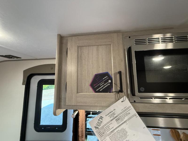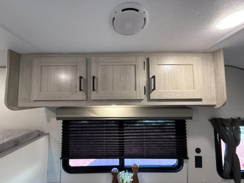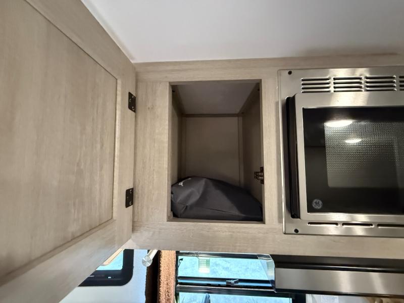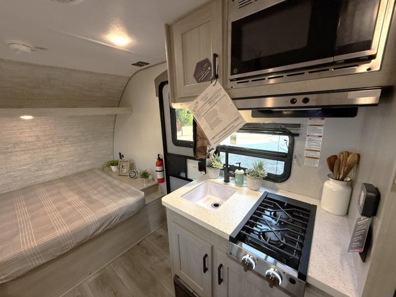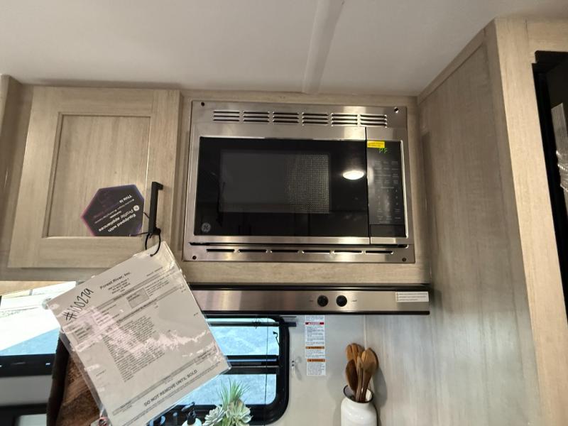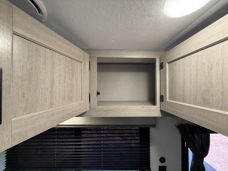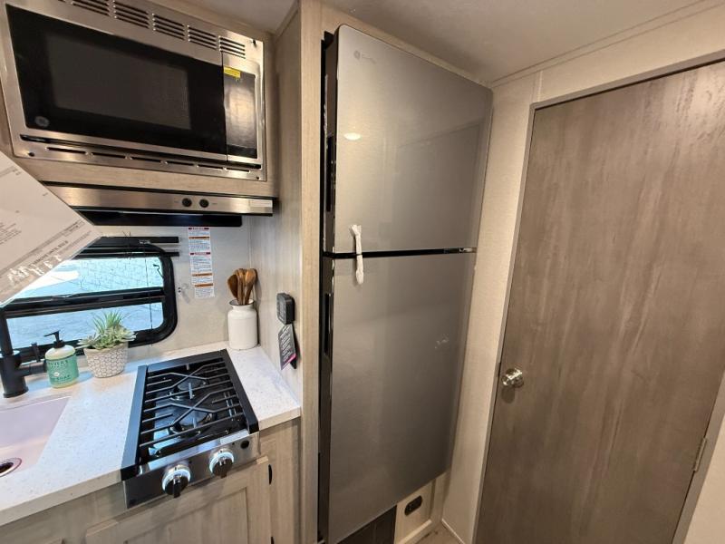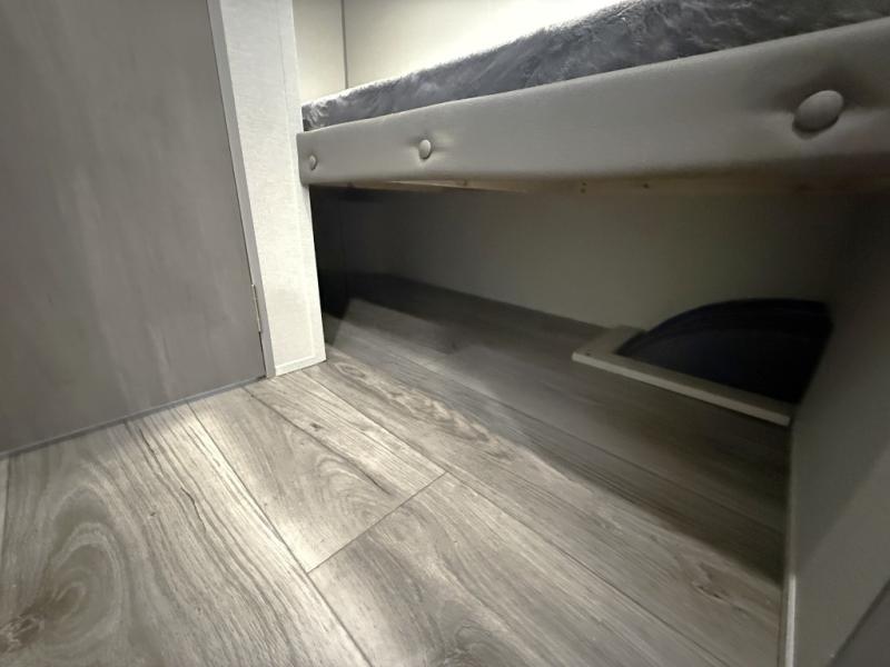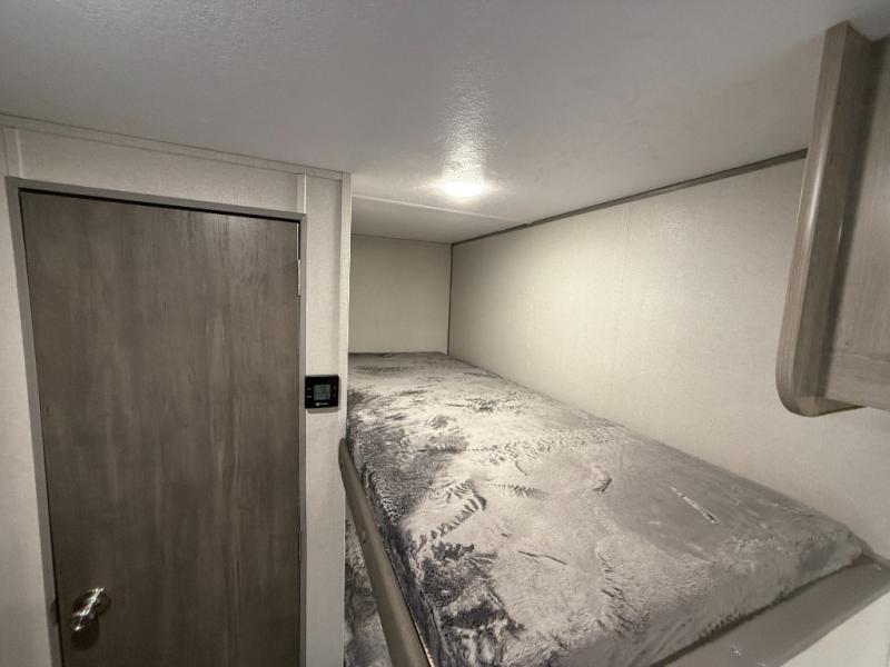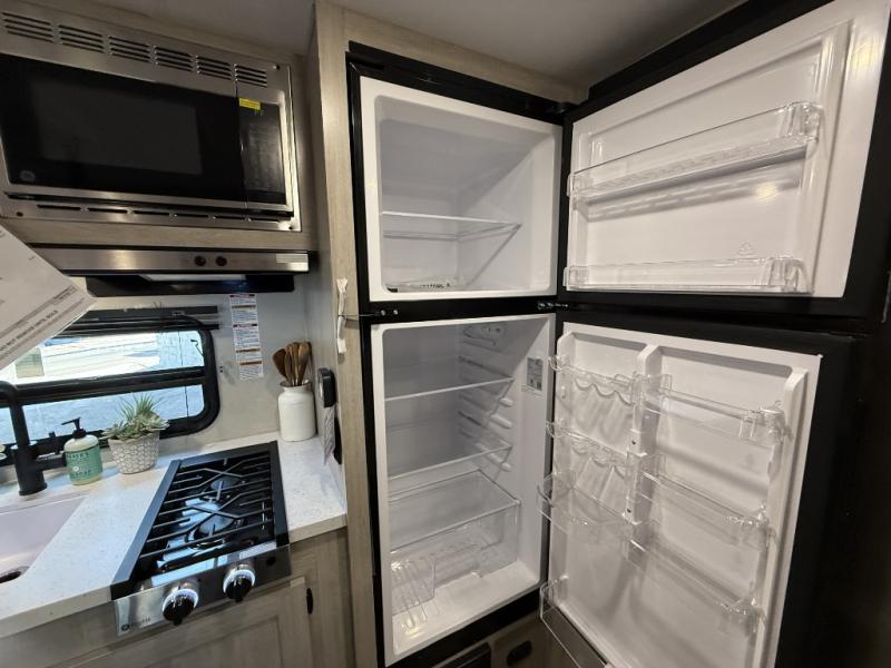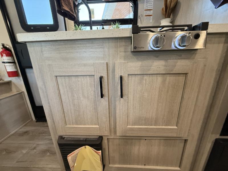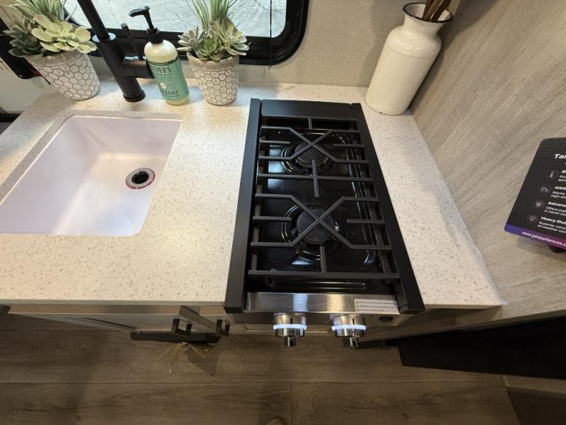 This travel trailers is perfect for a young family or smaller group. You can easily sleep four or more with the rear set of bunk beds and queen bed up front. There is also a 60" sofa for inside down-time, as well as complete kitchen and bath amenities so you can cook and stay clean while traveling. The rear corner bath features a toilet and 36" x 30" shower, and it's conveniently located next to the bunk beds which is great for little ones at night. Cooking inside will be easy with a GE stainless two-burner cooktop and single sink, plus there is also a GE microwave oven for snacks and things that you can easily warm up. If you plan to spend most of your time outdoors, you will find plenty of storage space in the front exterior storage compartment, and there is also plenty of storage inside as well.