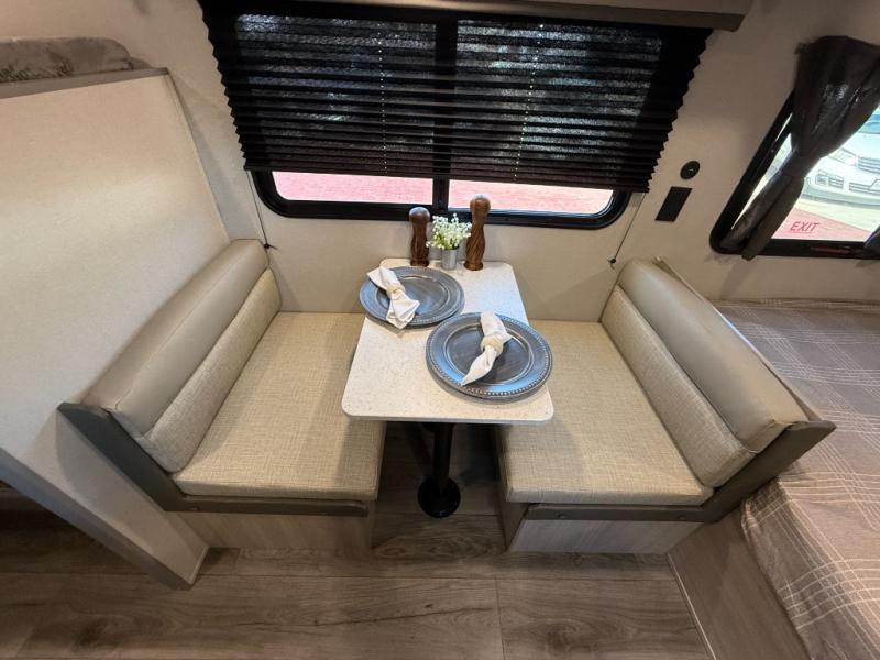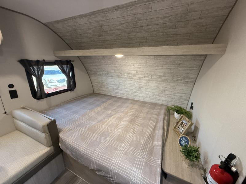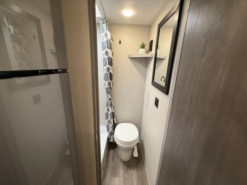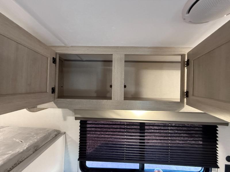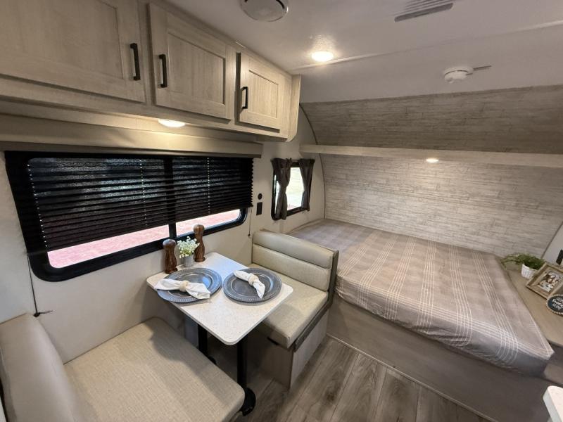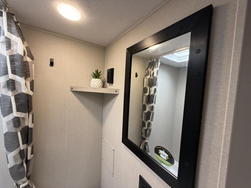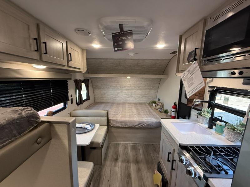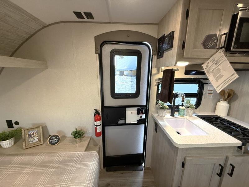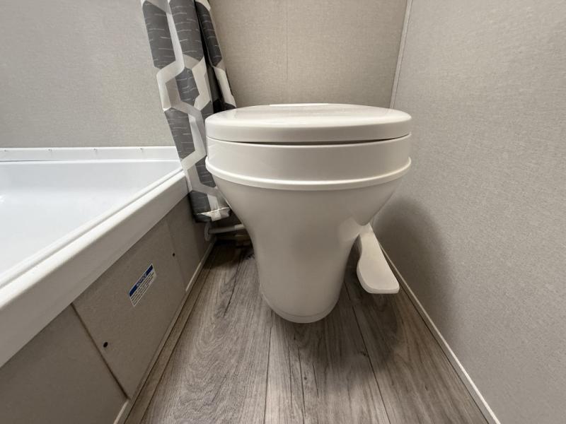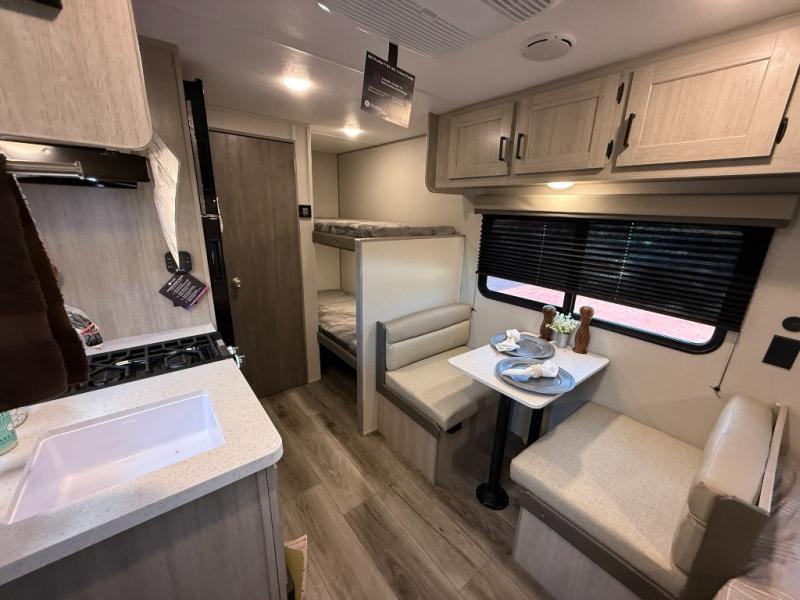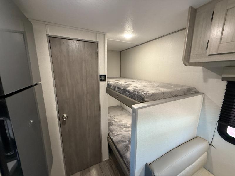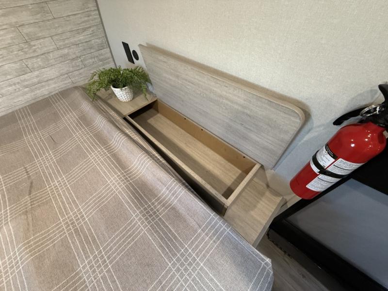 This travel trailers is perfect for a young family or smaller group. You can easily sleep four or more with the rear set of bunk beds and queen bed up front. There is also a 60" sofa for inside down-time, as well as complete kitchen and bath amenities so you can cook and stay clean while traveling. The rear corner bath features a toilet and 36" x 30" shower, and it's conveniently located next to the bunk beds which is great for little ones at night. Cooking inside will be easy with a GE stainless two-burner cooktop and single sink, plus there is also a GE microwave oven for snacks and things that you can easily warm up. If you plan to spend most of your time outdoors, you will find plenty of storage space in the front exterior storage compartment, and there is also plenty of storage inside as well.