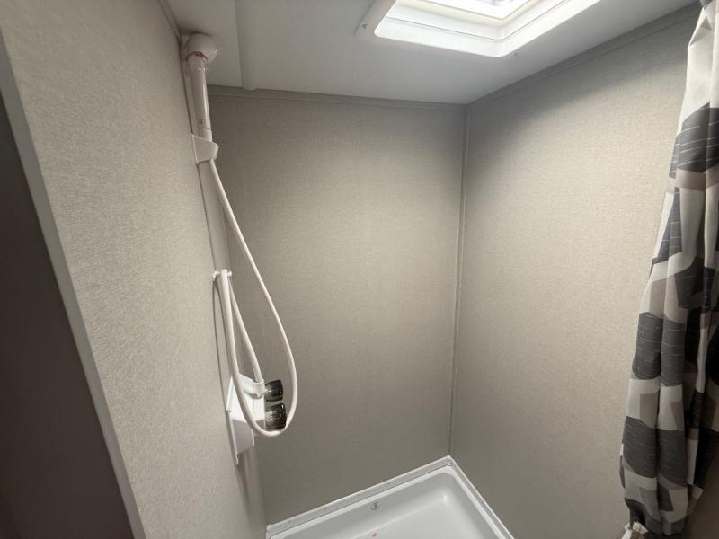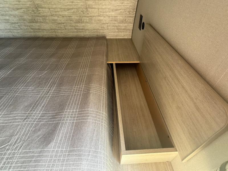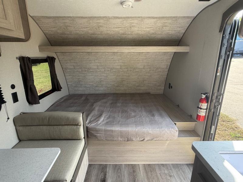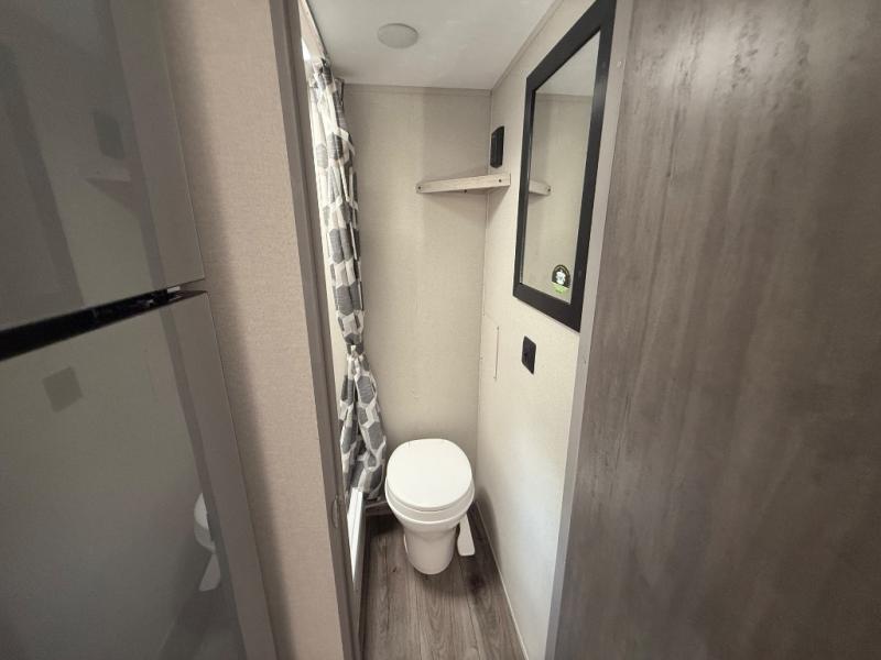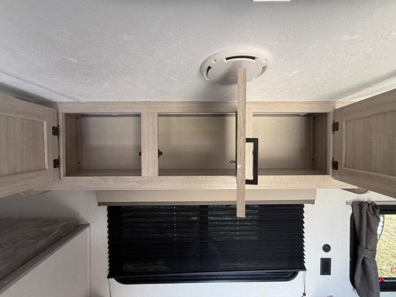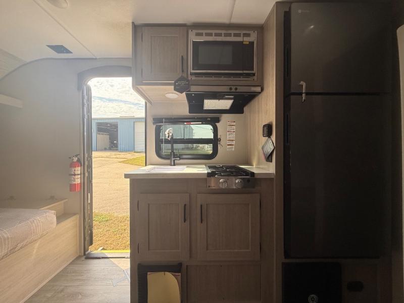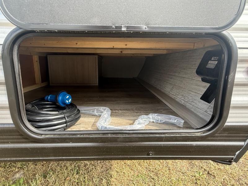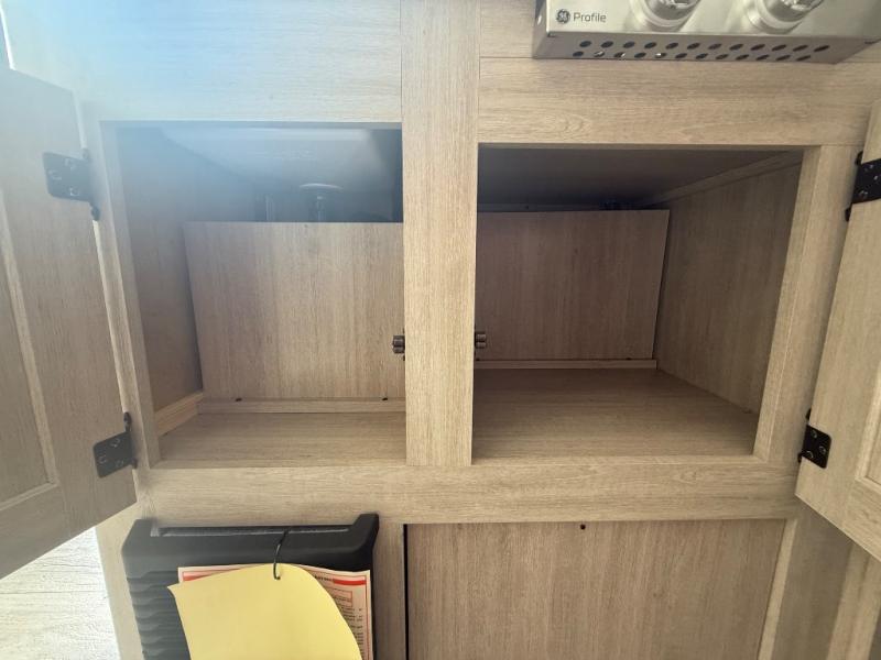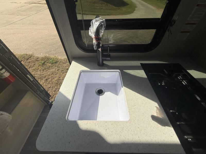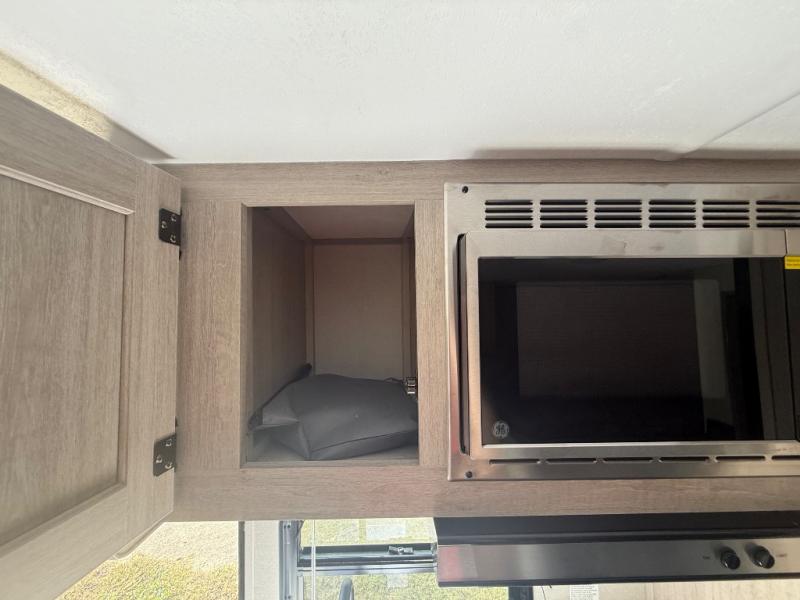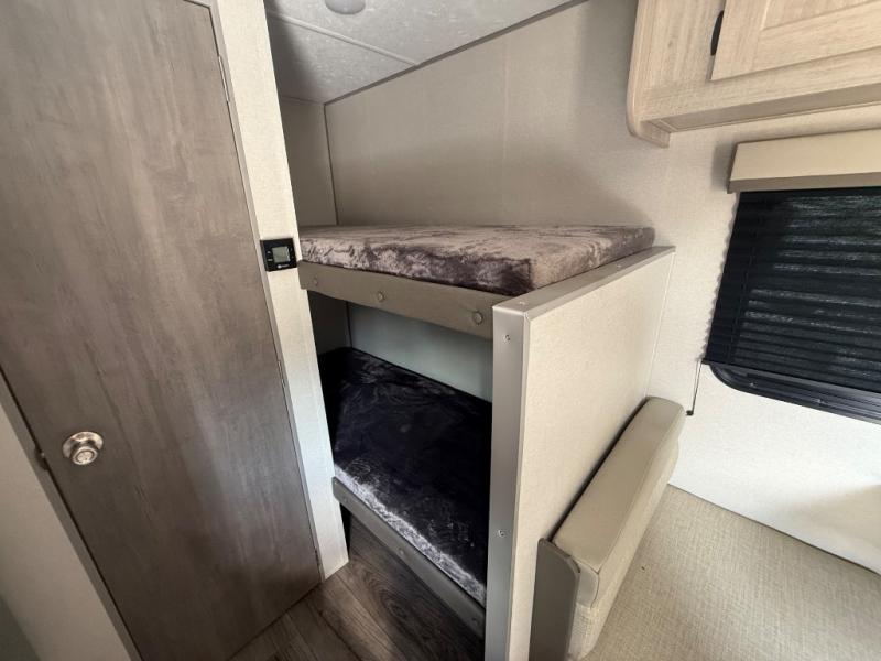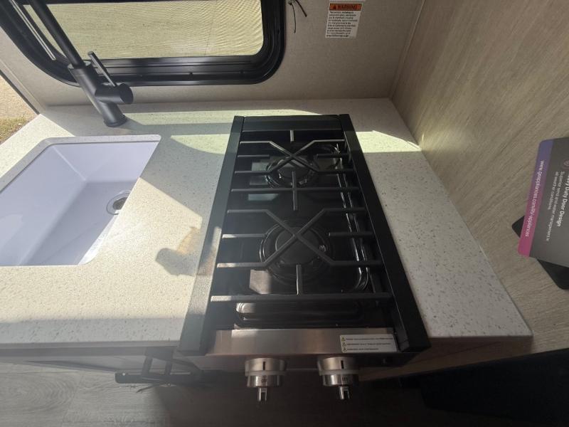 This travel trailers is perfect for a young family or smaller group. You can easily sleep four or more with the rear set of bunk beds and queen bed up front. There is also a 60" sofa for inside down-time, as well as complete kitchen and bath amenities so you can cook and stay clean while traveling. The rear corner bath features a toilet and 36" x 30" shower, and it's conveniently located next to the bunk beds which is great for little ones at night. Cooking inside will be easy with a GE stainless two-burner cooktop and single sink, plus there is also a GE microwave oven for snacks and things that you can easily warm up. If you plan to spend most of your time outdoors, you will find plenty of storage space in the front exterior storage compartment, and there is also plenty of storage inside as well.