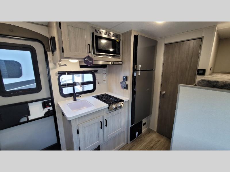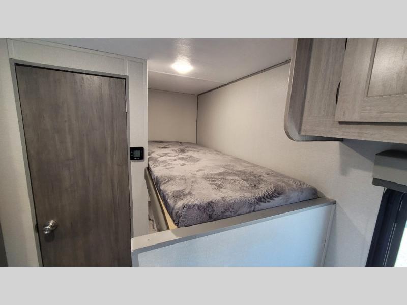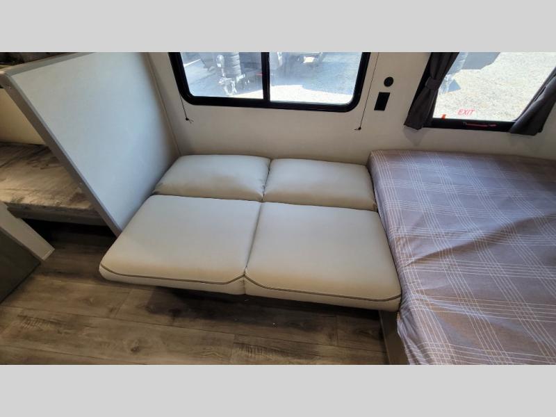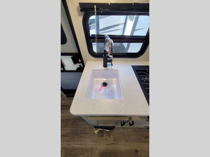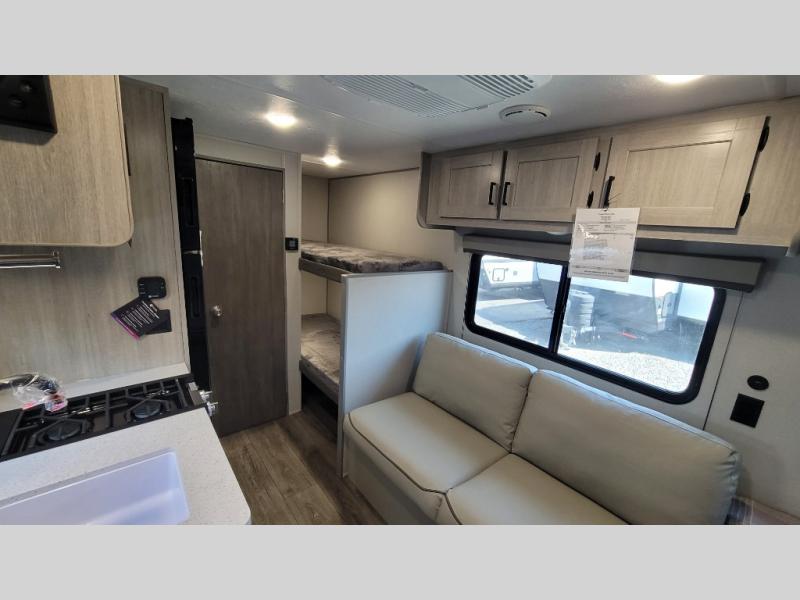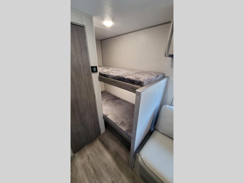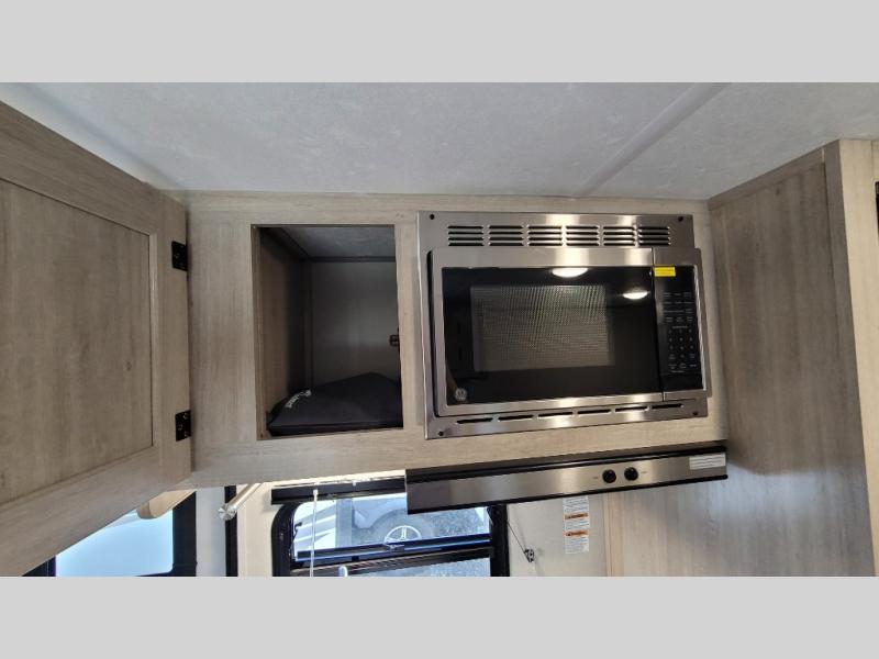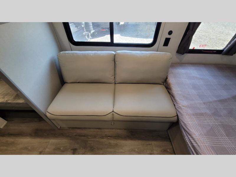 This travel trailers is perfect for a young family or smaller group. You can easily sleep four or more with the rear set of bunk beds and queen bed up front. There is also a 60" sofa for inside down-time, as well as complete kitchen and bath amenities so you can cook and stay clean while traveling. The rear corner bath features a toilet and 36" x 30" shower, and it's conveniently located next to the bunk beds which is great for little ones at night. Cooking inside will be easy with a GE stainless two-burner cooktop and single sink, plus there is also a GE microwave oven for snacks and things that you can easily warm up. If you plan to spend most of your time outdoors, you will find plenty of storage space in the front exterior storage compartment, and there is also plenty of storage inside as well.