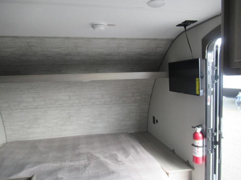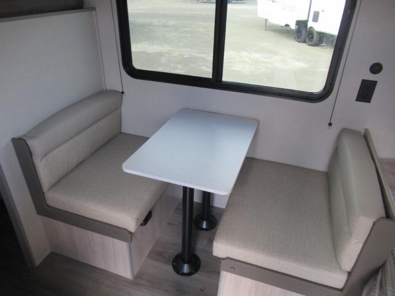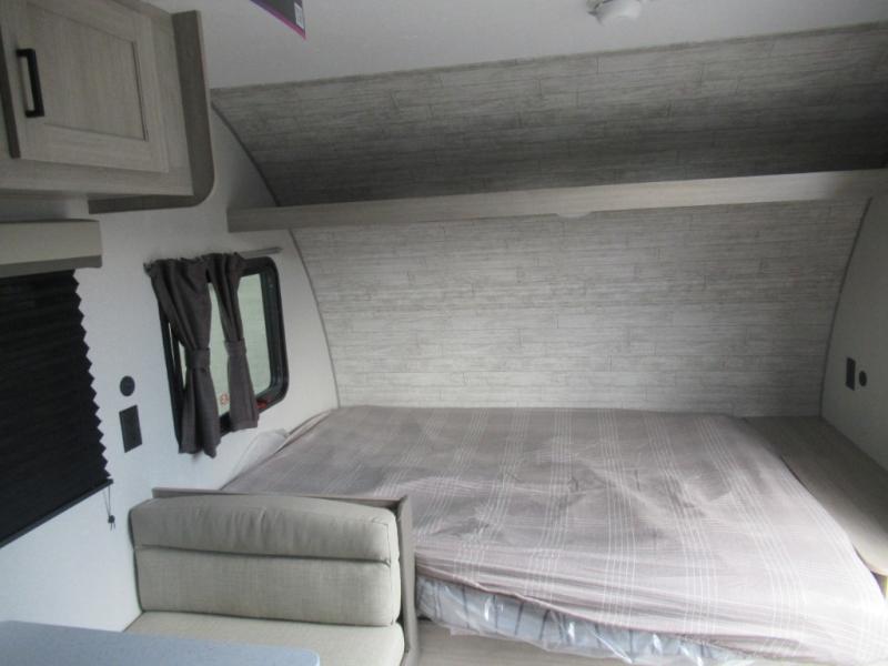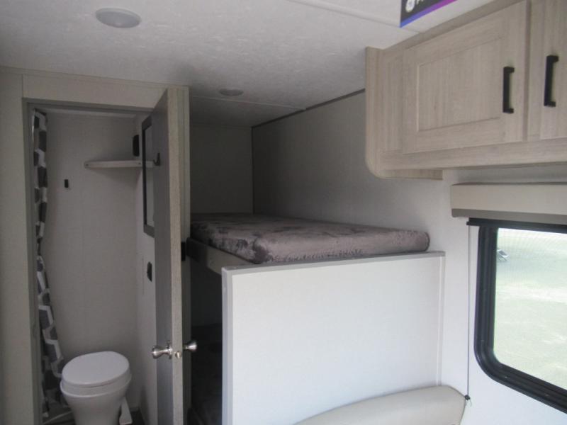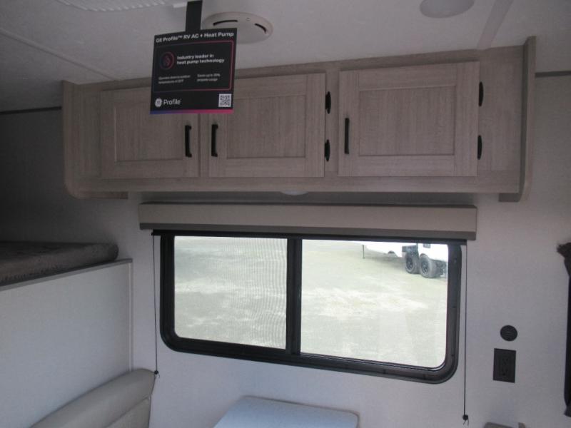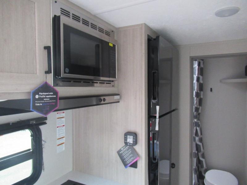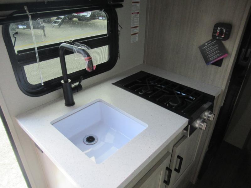 This travel trailers is perfect for a young family or smaller group. You can easily sleep four or more with the rear set of bunk beds and queen bed up front. There is also a 60" sofa for inside down-time, as well as complete kitchen and bath amenities so you can cook and stay clean while traveling. The rear corner bath features a toilet and 36" x 30" shower, and it's conveniently located next to the bunk beds which is great for little ones at night. Cooking inside will be easy with a GE stainless two-burner cooktop and single sink, plus there is also a GE microwave oven for snacks and things that you can easily warm up. If you plan to spend most of your time outdoors, you will find plenty of storage space in the front exterior storage compartment, and there is also plenty of storage inside as well.