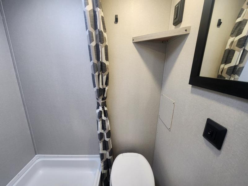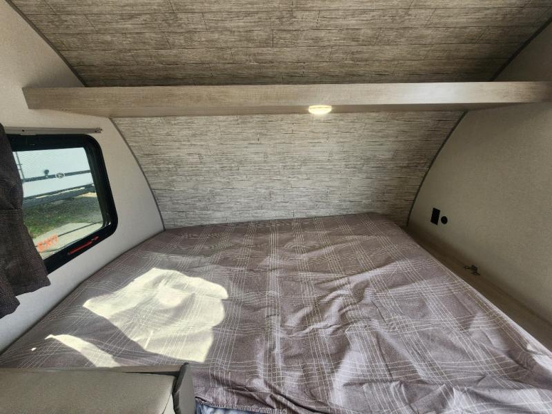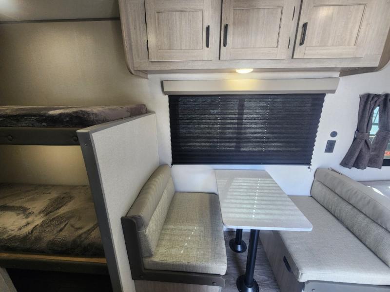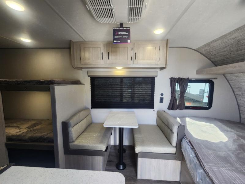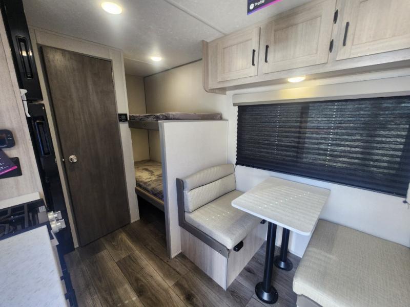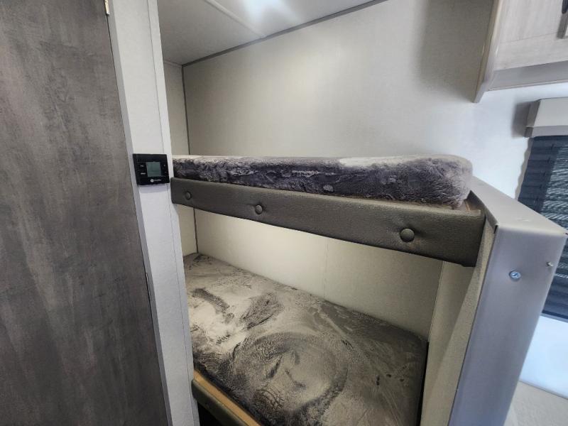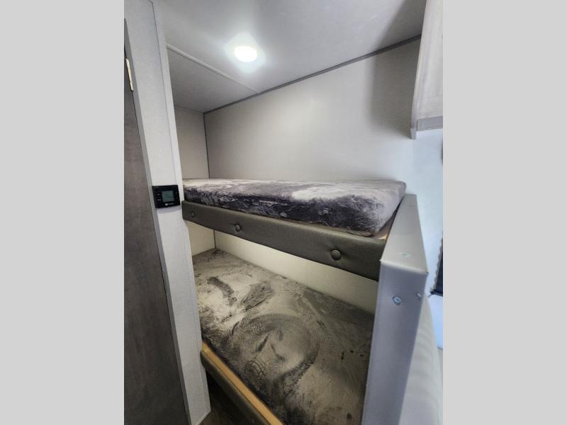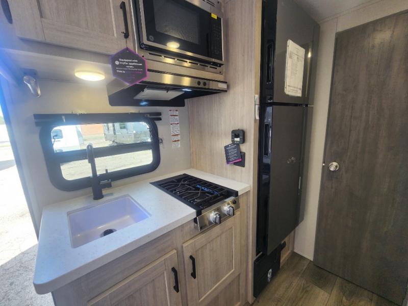 This travel trailers is perfect for a young family or smaller group. You can easily sleep four or more with the rear set of bunk beds and queen bed up front. There is also a 60" sofa for inside down-time, as well as complete kitchen and bath amenities so you can cook and stay clean while traveling. The rear corner bath features a toilet and 36" x 30" shower, and it's conveniently located next to the bunk beds which is great for little ones at night. Cooking inside will be easy with a GE stainless two-burner cooktop and single sink, plus there is also a GE microwave oven for snacks and things that you can easily warm up. If you plan to spend most of your time outdoors, you will find plenty of storage space in the front exterior storage compartment, and there is also plenty of storage inside as well.
