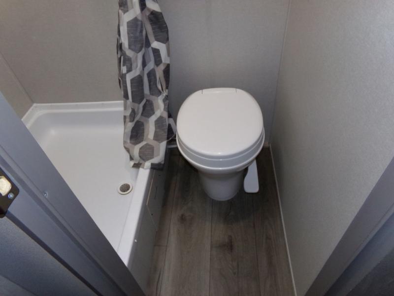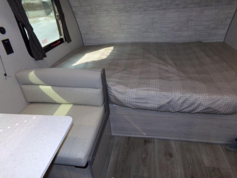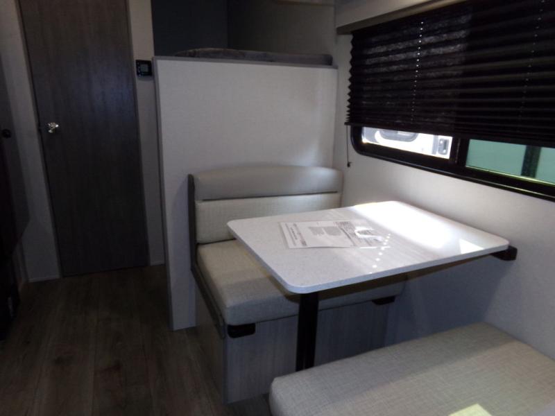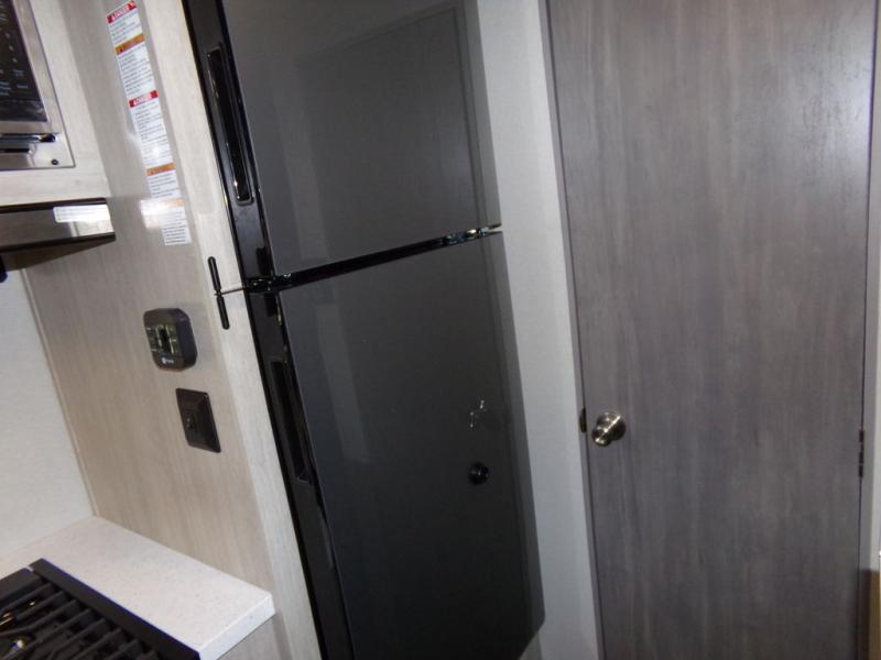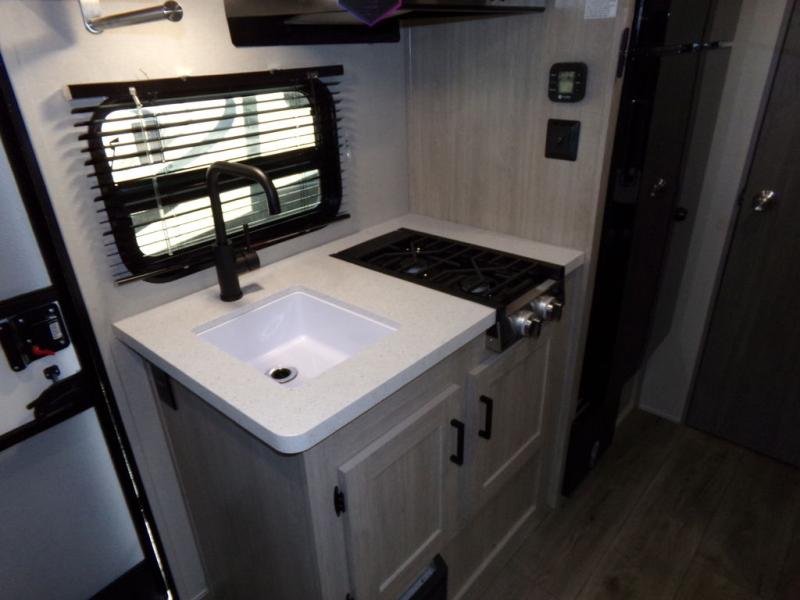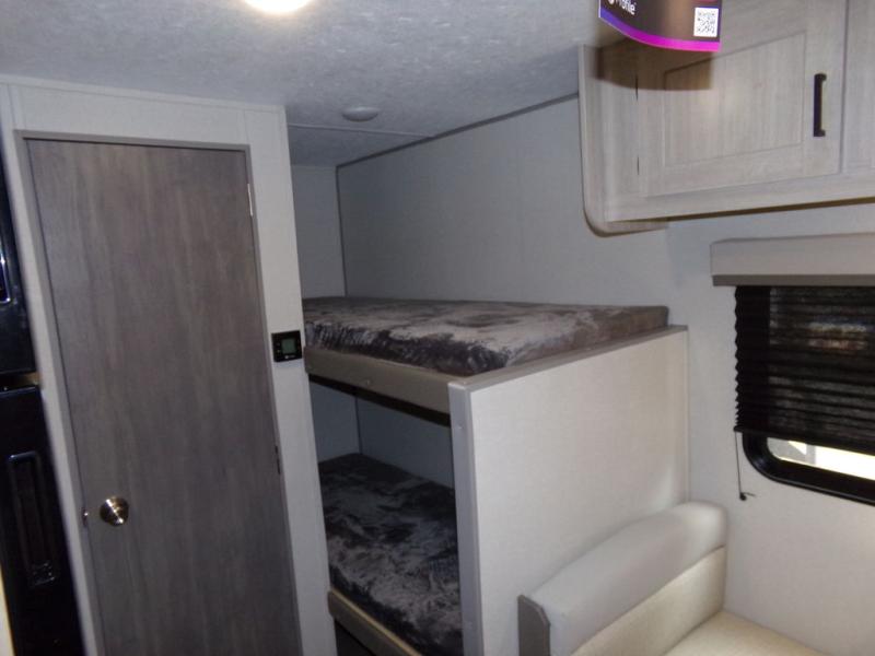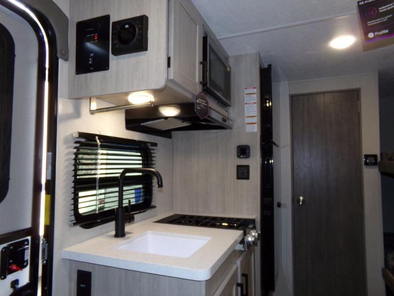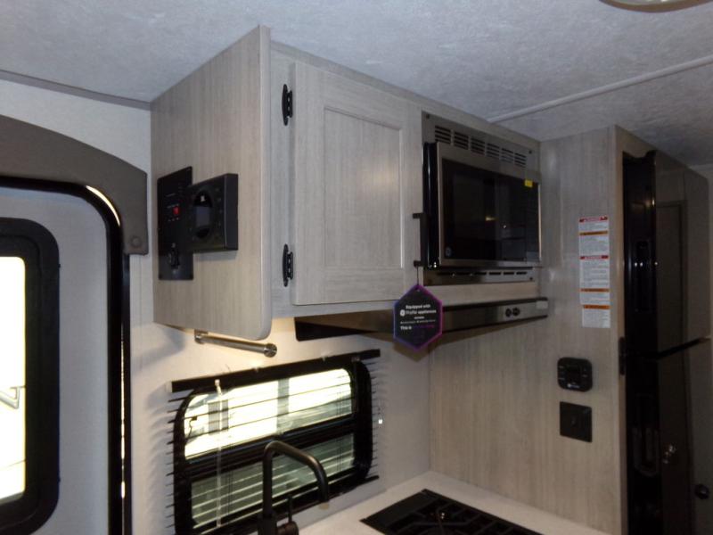 This travel trailers is perfect for a young family or smaller group. You can easily sleep four or more with the rear set of bunk beds and queen bed up front. There is also a 60" sofa for inside down-time, as well as complete kitchen and bath amenities so you can cook and stay clean while traveling. The rear corner bath features a toilet and 36" x 30" shower, and it's conveniently located next to the bunk beds which is great for little ones at night. Cooking inside will be easy with a GE stainless two-burner cooktop and single sink, plus there is also a GE microwave oven for snacks and things that you can easily warm up. If you plan to spend most of your time outdoors, you will find plenty of storage space in the front exterior storage compartment, and there is also plenty of storage inside as well.
