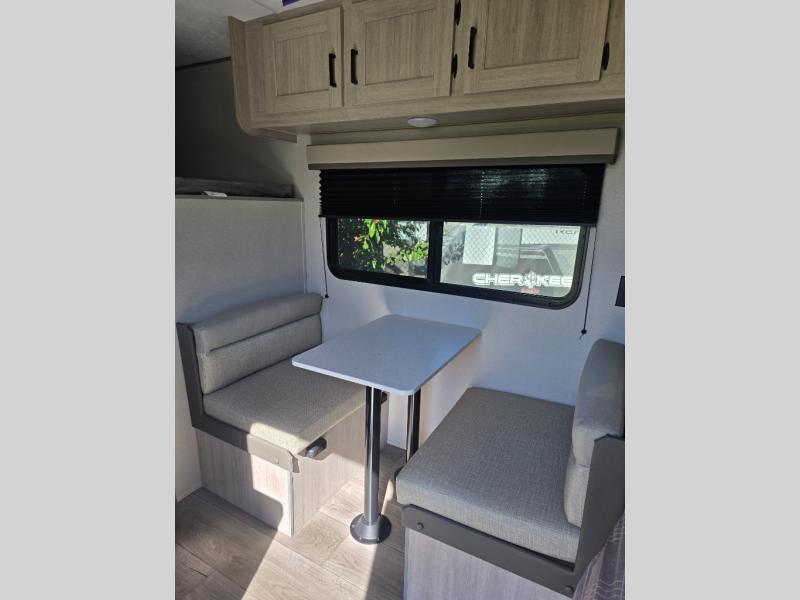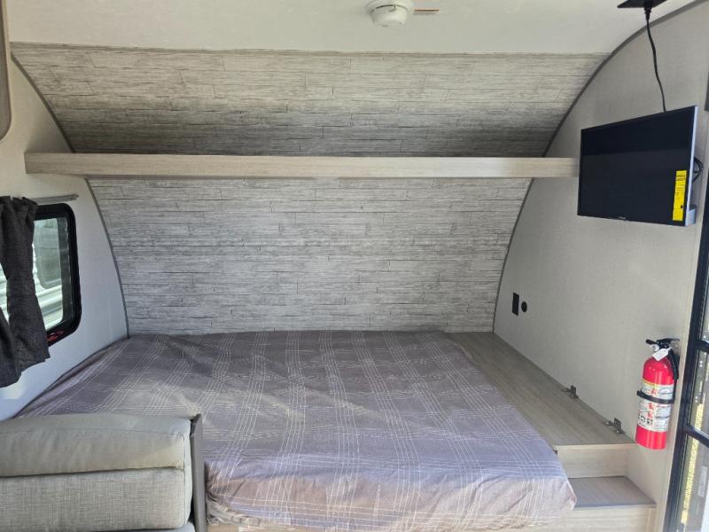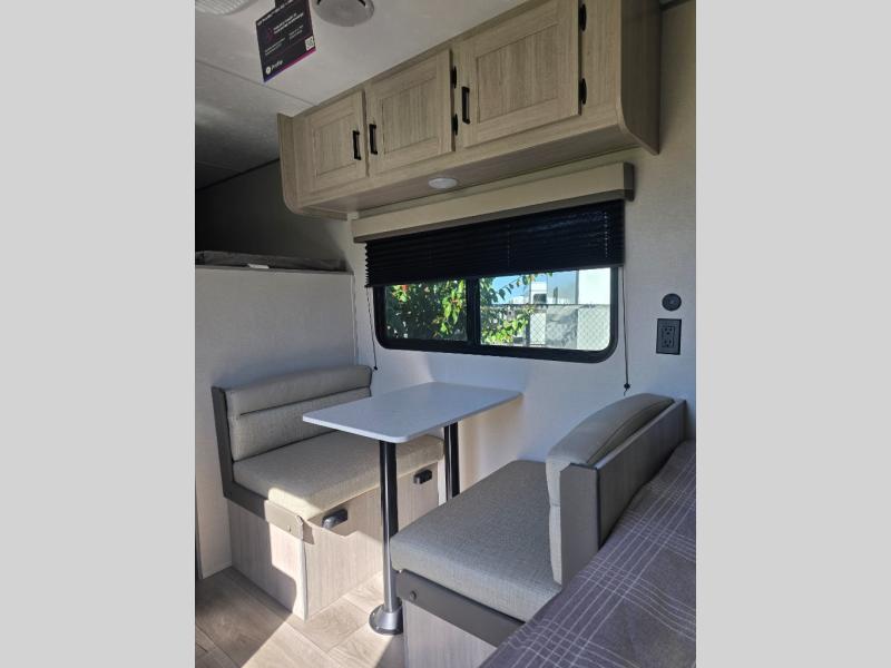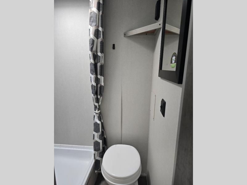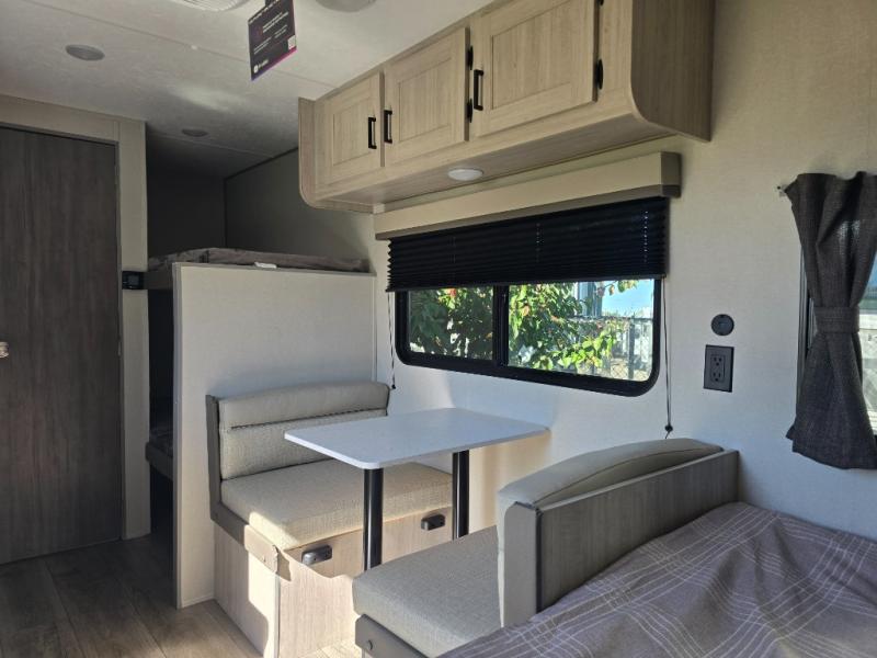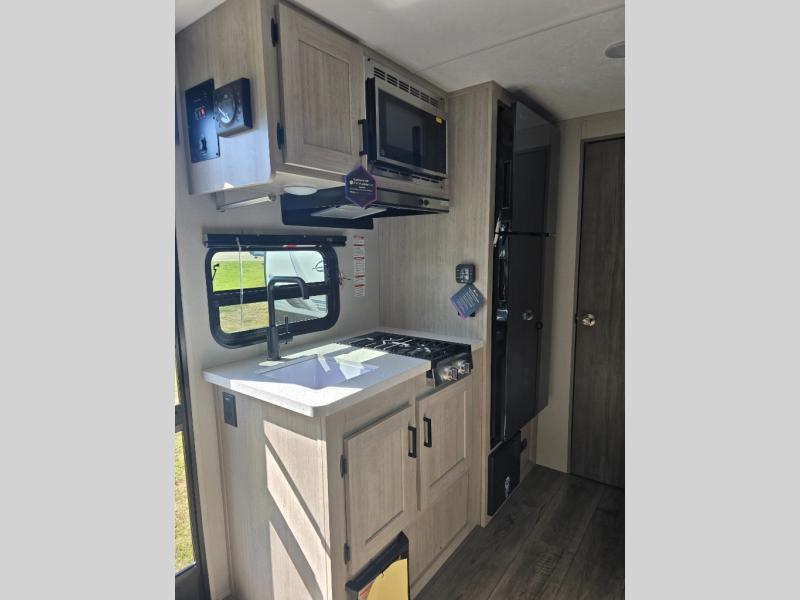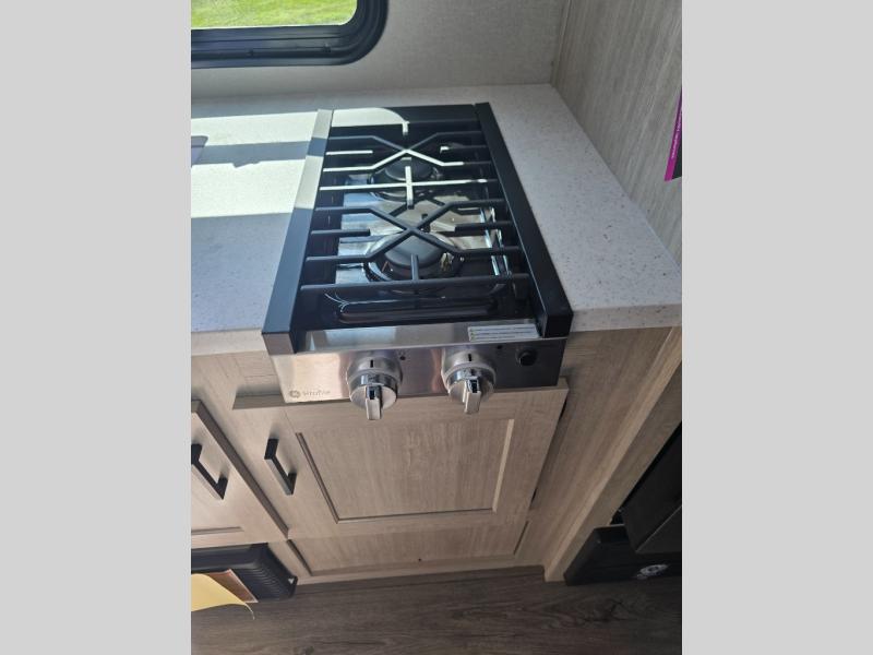 This travel trailers is perfect for a young family or smaller group. You can easily sleep four or more with the rear set of bunk beds and queen bed up front. There is also a 60" sofa for inside down-time, as well as complete kitchen and bath amenities so you can cook and stay clean while traveling. The rear corner bath features a toilet and 36" x 30" shower, and it's conveniently located next to the bunk beds which is great for little ones at night. Cooking inside will be easy with a GE stainless two-burner cooktop and single sink, plus there is also a GE microwave oven for snacks and things that you can easily warm up. If you plan to spend most of your time outdoors, you will find plenty of storage space in the front exterior storage compartment, and there is also plenty of storage inside as well.