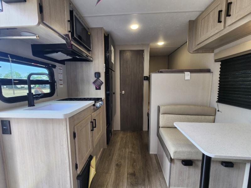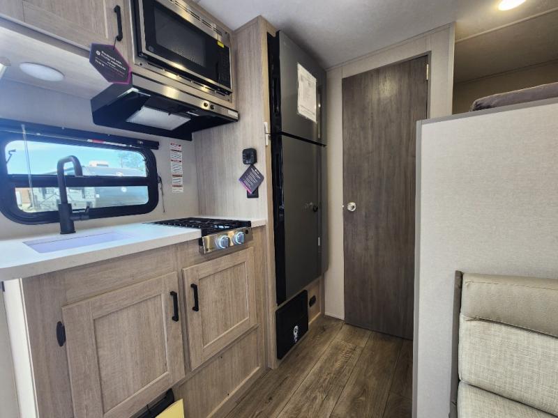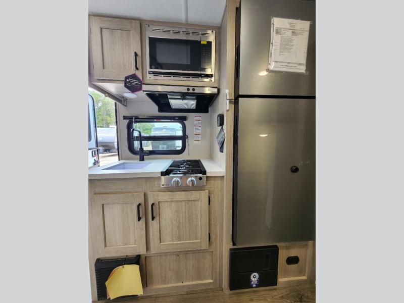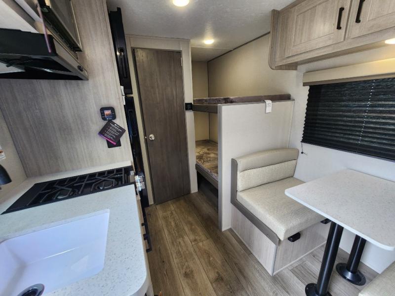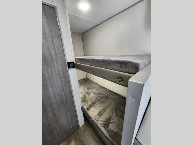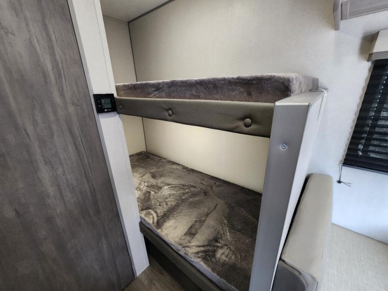 This travel trailers is perfect for a young family or smaller group. You can easily sleep four or more with the rear set of bunk beds and queen bed up front. There is also a 60" sofa for inside down-time, as well as complete kitchen and bath amenities so you can cook and stay clean while traveling. The rear corner bath features a toilet and 36" x 30" shower, and it's conveniently located next to the bunk beds which is great for little ones at night. Cooking inside will be easy with a GE stainless two-burner cooktop and single sink, plus there is also a GE microwave oven for snacks and things that you can easily warm up. If you plan to spend most of your time outdoors, you will find plenty of storage space in the front exterior storage compartment, and there is also plenty of storage inside as well.