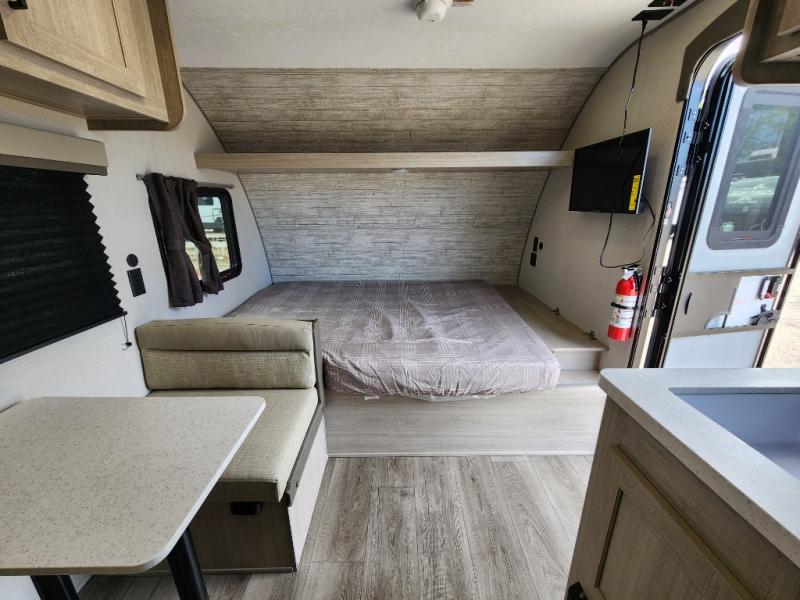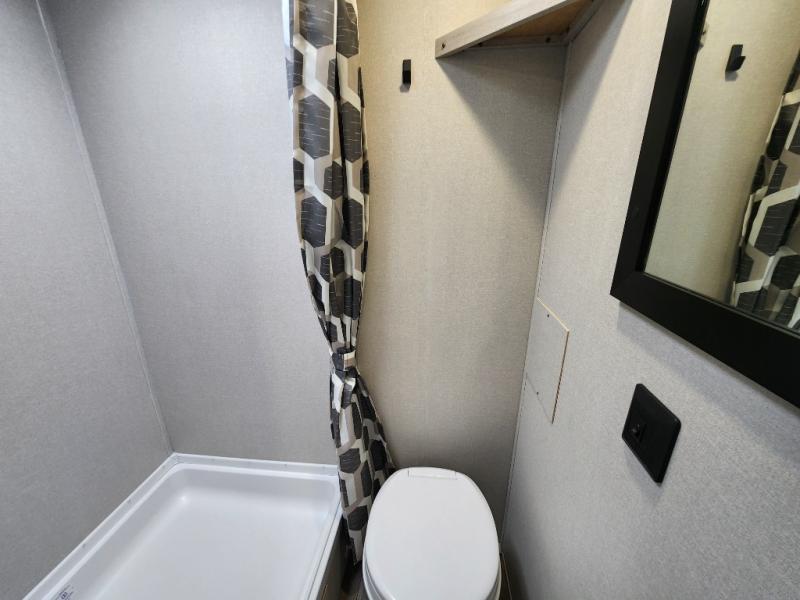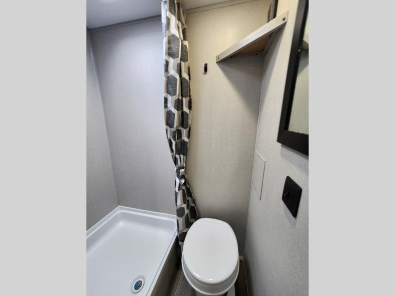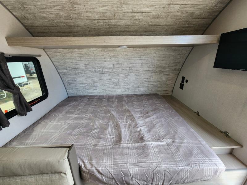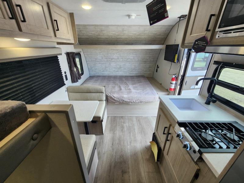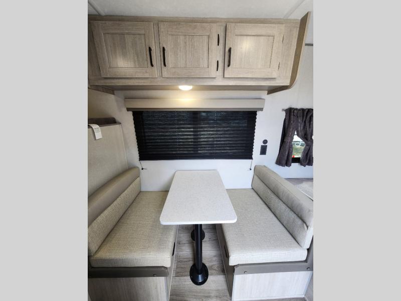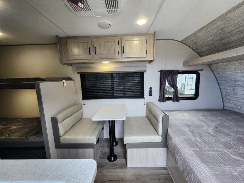 This travel trailers is perfect for a young family or smaller group. You can easily sleep four or more with the rear set of bunk beds and queen bed up front. There is also a 60" sofa for inside down-time, as well as complete kitchen and bath amenities so you can cook and stay clean while traveling. The rear corner bath features a toilet and 36" x 30" shower, and it's conveniently located next to the bunk beds which is great for little ones at night. Cooking inside will be easy with a GE stainless two-burner cooktop and single sink, plus there is also a GE microwave oven for snacks and things that you can easily warm up. If you plan to spend most of your time outdoors, you will find plenty of storage space in the front exterior storage compartment, and there is also plenty of storage inside as well.