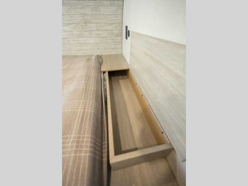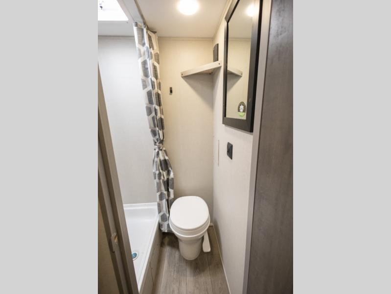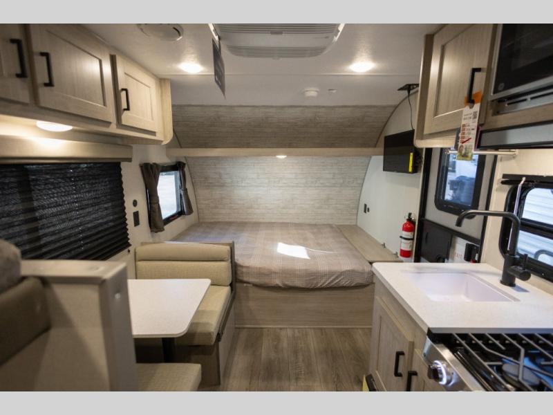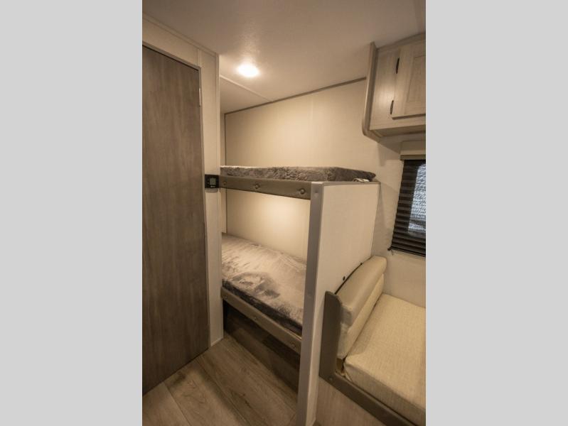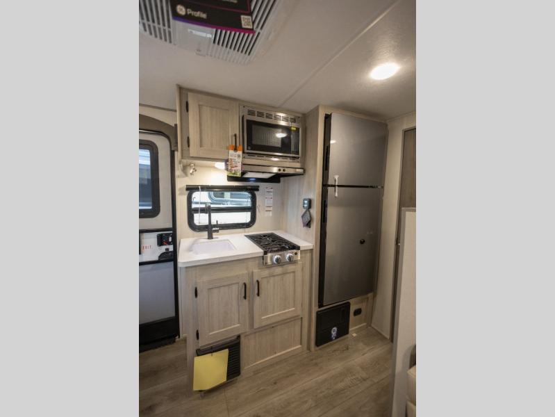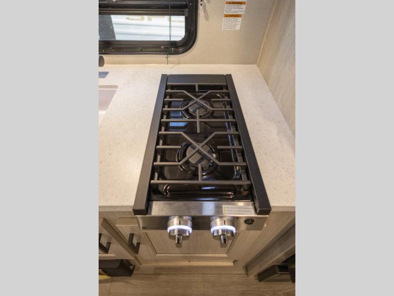 This travel trailers is perfect for a young family or smaller group. You can easily sleep four or more with the rear set of bunk beds and queen bed up front. There is also a 60" sofa for inside down-time, as well as complete kitchen and bath amenities so you can cook and stay clean while traveling. The rear corner bath features a toilet and 36" x 30" shower, and it's conveniently located next to the bunk beds which is great for little ones at night. Cooking inside will be easy with a GE stainless two-burner cooktop and single sink, plus there is also a GE microwave oven for snacks and things that you can easily warm up. If you plan to spend most of your time outdoors, you will find plenty of storage space in the front exterior storage compartment, and there is also plenty of storage inside as well.