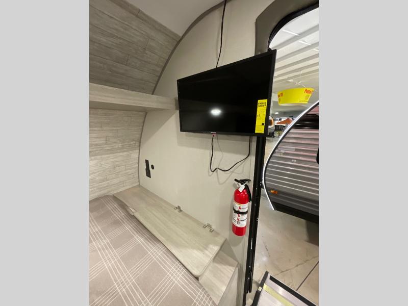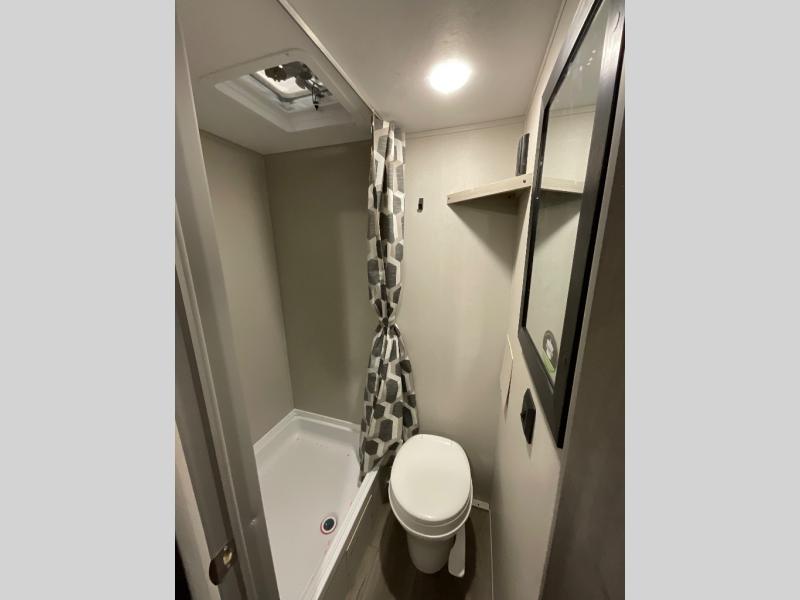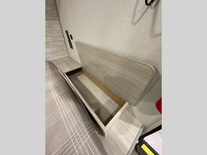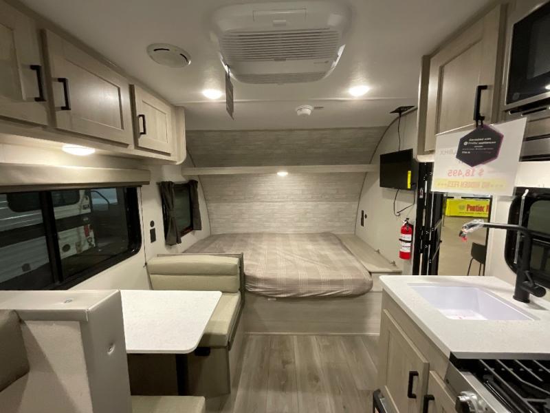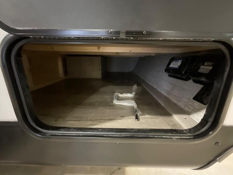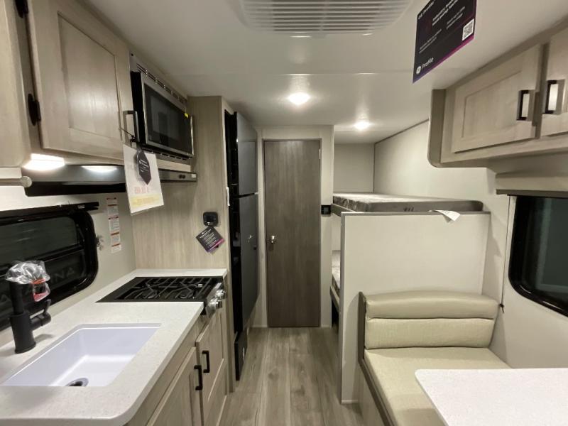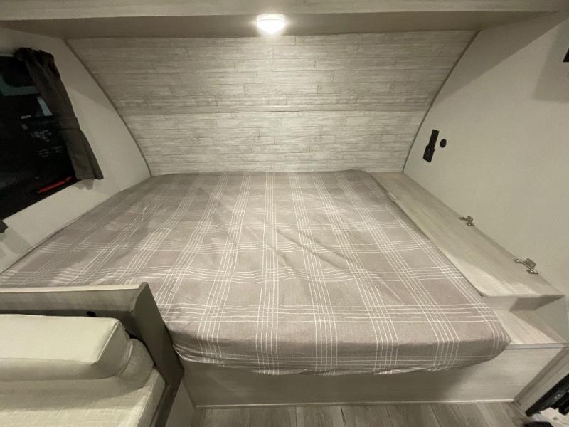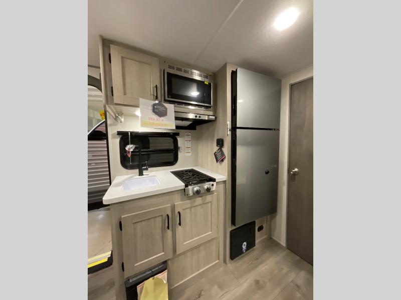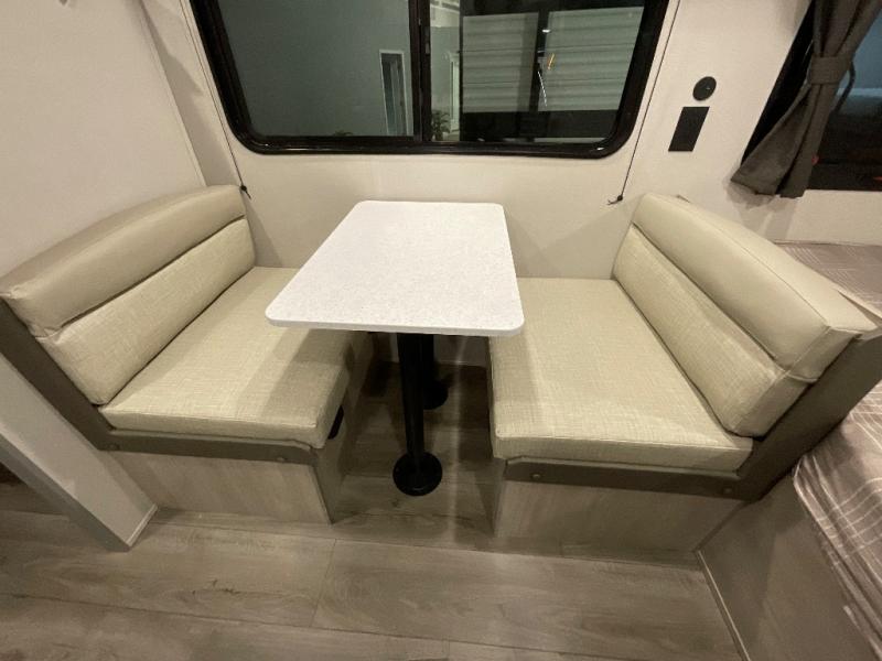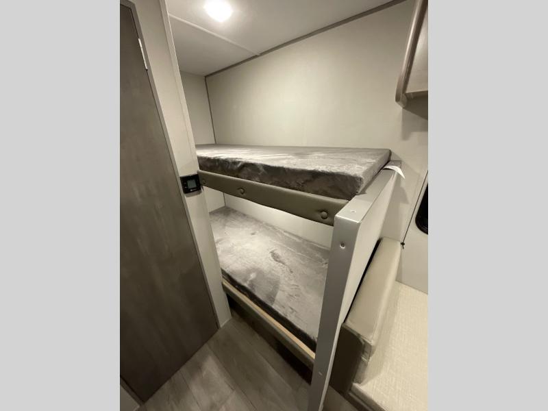 This travel trailers is perfect for a young family or smaller group. You can easily sleep four or more with the rear set of bunk beds and queen bed up front. There is also a booth dinette for inside down-time, as well as complete kitchen and bath amenities so you can cook and stay clean while traveling. The rear corner bath features a toilet and 36" x 30" shower, and it's conveniently located next to the bunk beds which is great for little ones at night. Cooking inside will be easy with a GE stainless two-burner cooktop and single sink, plus there is also a GE microwave oven for snacks and things that you can easily warm up. If you plan to spend most of your time outdoors, you will find plenty of storage space in the front exterior storage compartment, and there is also plenty of storage inside as well.