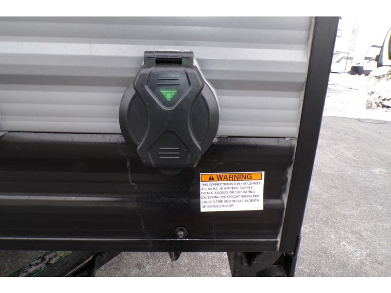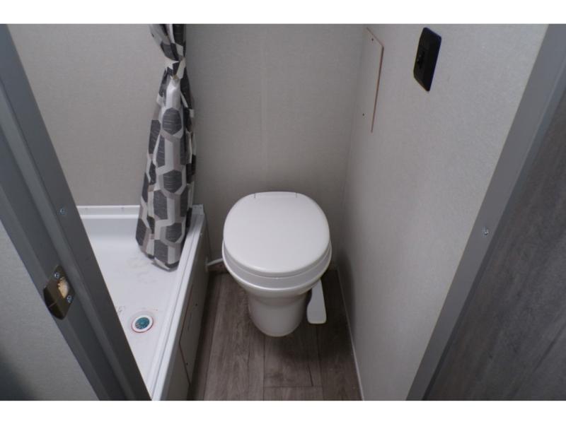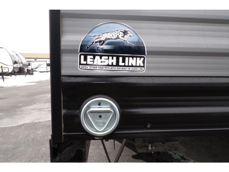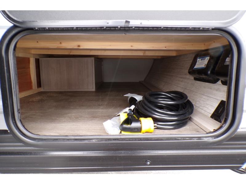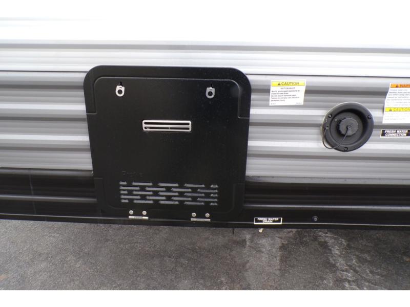 This travel trailers is perfect for a young family or smaller group. You can easily sleep four or more with the rear set of bunk beds and queen bed up front. There is also a booth dinette for inside down-time, as well as complete kitchen and bath amenities so you can cook and stay clean while traveling. The rear corner bath features a toilet and 36" x 30" shower, and it's conveniently located next to the bunk beds which is great for little ones at night. Cooking inside will be easy with a GE stainless two-burner cooktop and single sink, plus there is also a GE microwave oven for snacks and things that you can easily warm up. If you plan to spend most of your time outdoors, you will find plenty of storage space in the front exterior storage compartment, and there is also plenty of storage inside as well.
