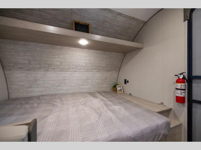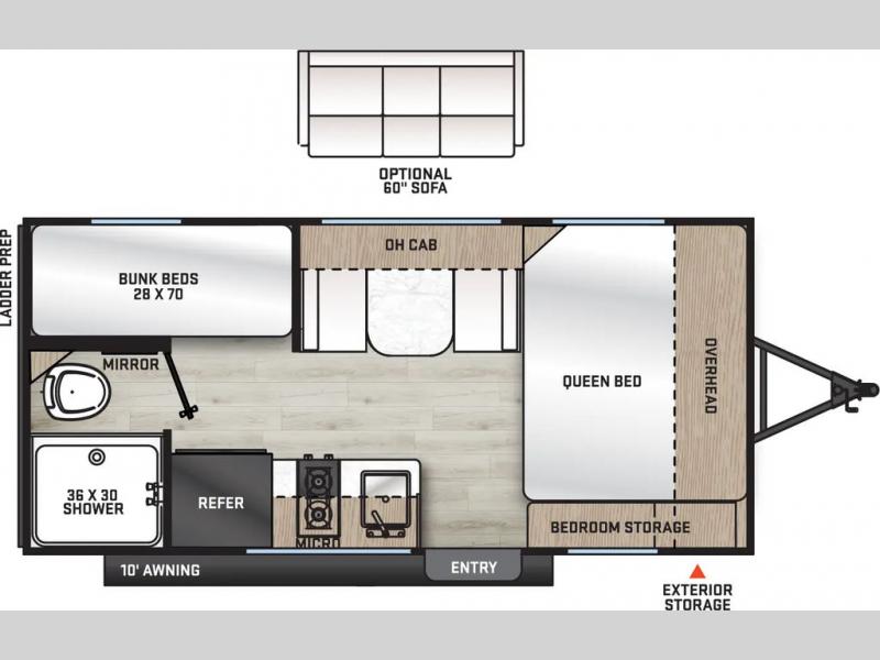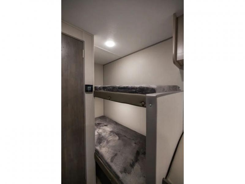 This travel trailers is perfect for a young family or smaller group. You can easily sleep four or more with the rear set of bunk beds and queen bed up front. There is also a booth dinette for inside down-time, as well as complete kitchen and bath amenities so you can cook and stay clean while traveling. The rear corner bath features a toilet and 36" x 30" shower, and it's conveniently located next to the bunk beds which is great for little ones at night. Cooking inside will be easy with a GE stainless two-burner cooktop and single sink, plus there is also a GE microwave oven for snacks and things that you can easily warm up. If you plan to spend most of your time outdoors, you will find plenty of storage space in the front exterior storage compartment, and there is also plenty of storage inside as well.
