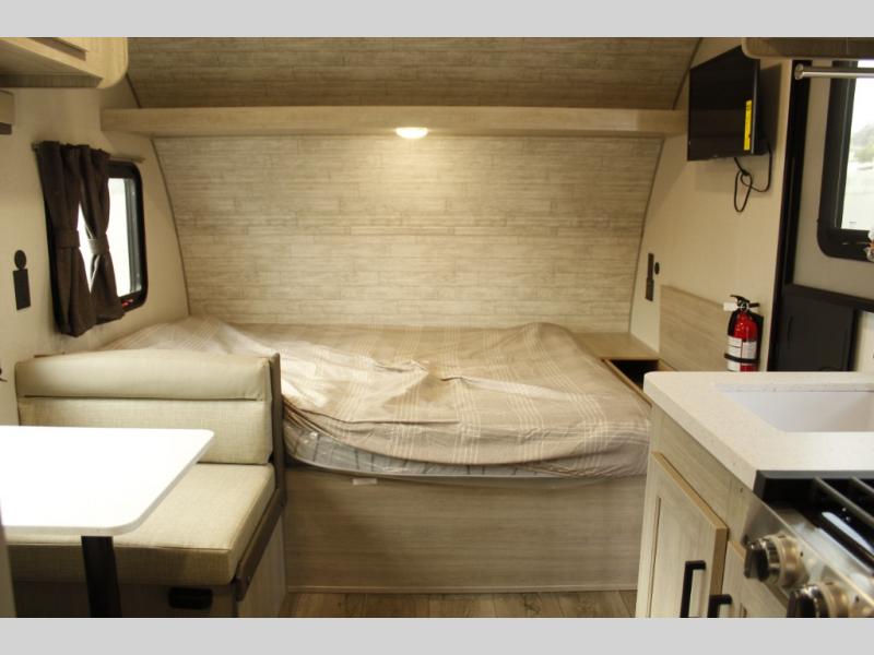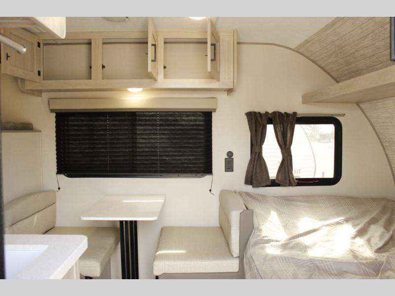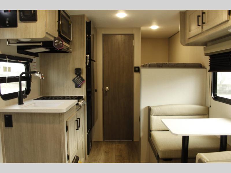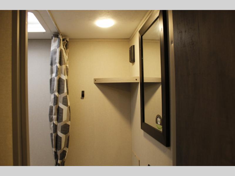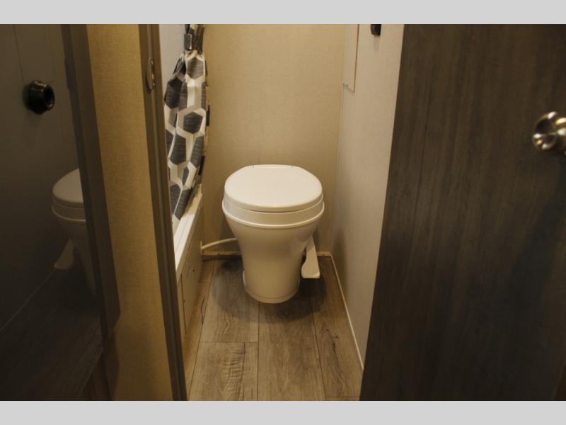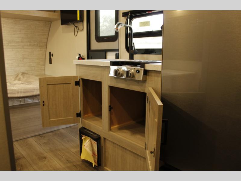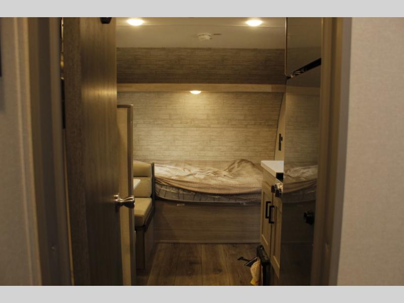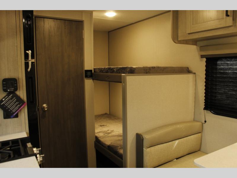 This travel trailers is perfect for a young family or smaller group. You can easily sleep four or more with the rear set of bunk beds and queen bed up front. There is also a booth dinette for inside down-time, as well as complete kitchen and bath amenities so you can cook and stay clean while traveling. The rear corner bath features a toilet and 36" x 30" shower, and it's conveniently located next to the bunk beds which is great for little ones at night. Cooking inside will be easy with a GE stainless two-burner cooktop and single sink, plus there is also a GE microwave oven for snacks and things that you can easily warm up. If you plan to spend most of your time outdoors, you will find plenty of storage space in the front exterior storage compartment, and there is also plenty of storage inside as well.