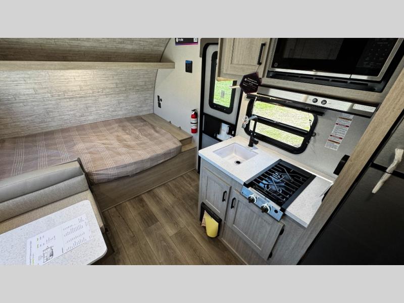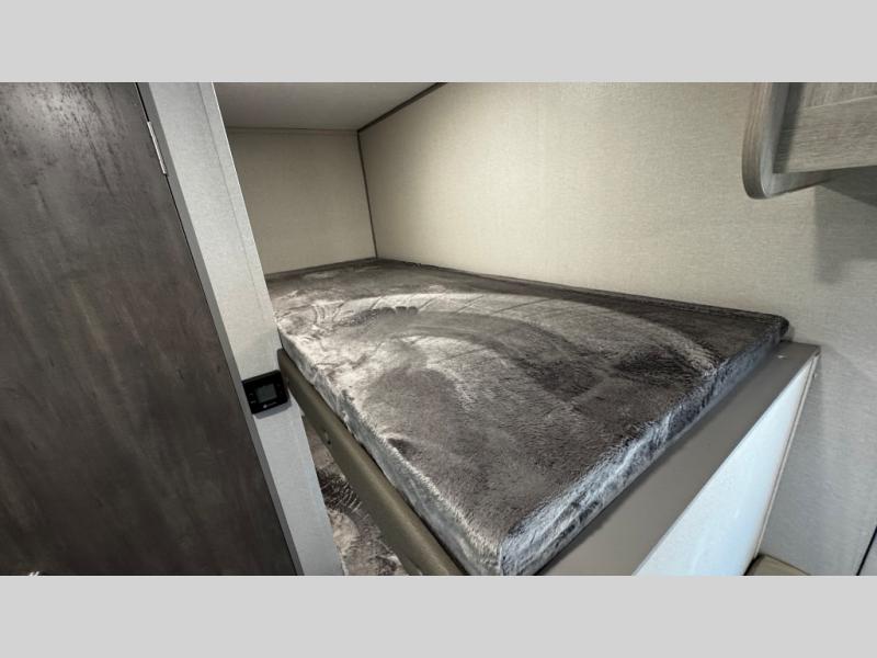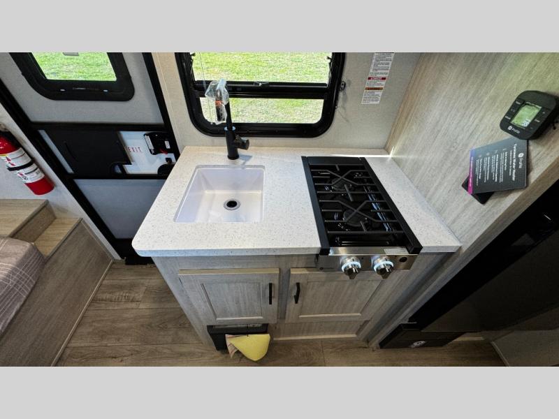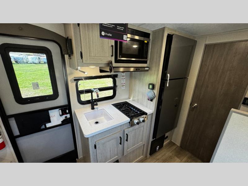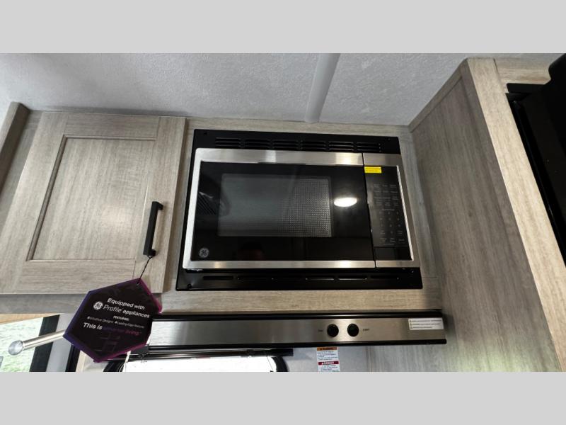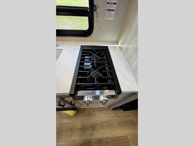This travel trailers is perfect for a young family or smaller group. You can easily sleep four or more with the rear set of bunk beds and queen bed up front. There is also a booth dinette for inside down-time, as well as complete kitchen and bath amenities so you can cook and stay clean while traveling. The rear corner bath features a toilet and 36" x 30" shower, and it's conveniently located next to the bunk beds which is great for little ones at night. Cooking inside will be easy with a GE stainless two-burner cooktop and single sink, plus there is also a GE microwave oven for snacks and things that you can easily warm up. If you plan to spend most of your time outdoors, you will find plenty of storage space in the front exterior storage compartment, and there is also plenty of storage inside as well.