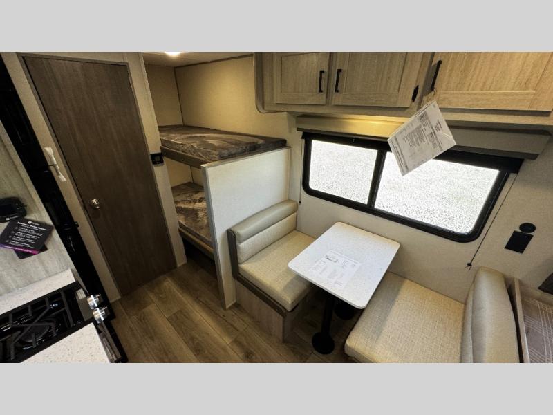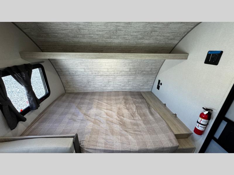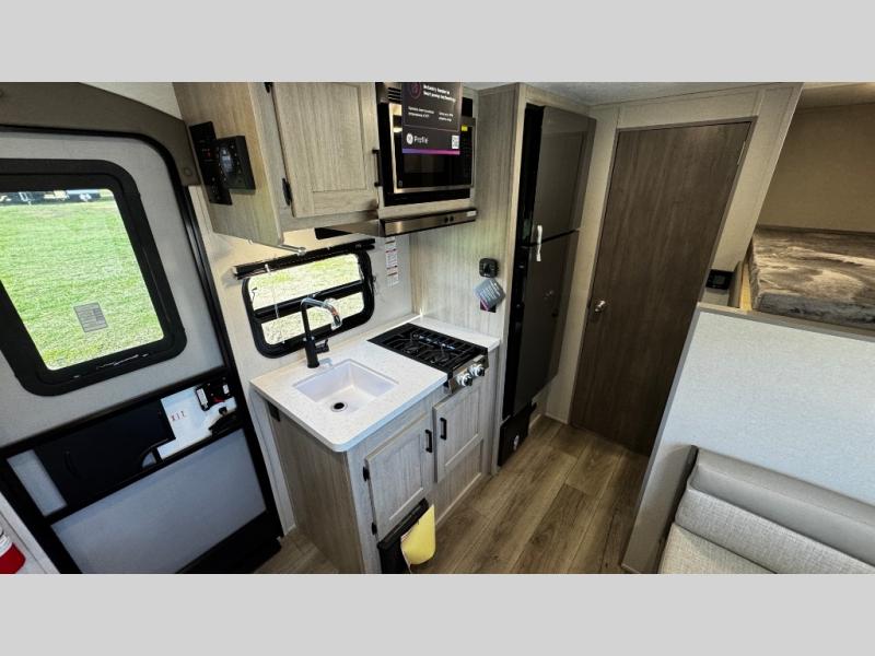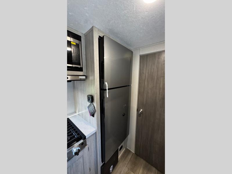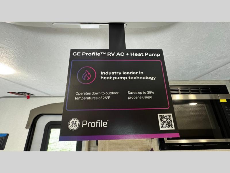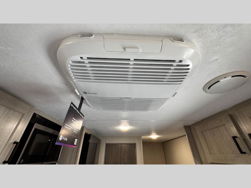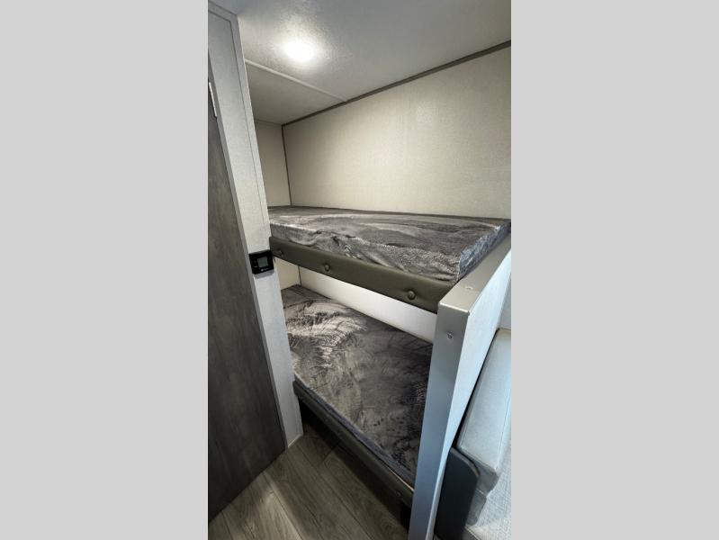 This travel trailers is perfect for a young family or smaller group. You can easily sleep four or more with the rear set of bunk beds and queen bed up front. There is also a booth dinette for inside down-time, as well as complete kitchen and bath amenities so you can cook and stay clean while traveling. The rear corner bath features a toilet and 36" x 30" shower, and it's conveniently located next to the bunk beds which is great for little ones at night. Cooking inside will be easy with a GE stainless two-burner cooktop and single sink, plus there is also a GE microwave oven for snacks and things that you can easily warm up. If you plan to spend most of your time outdoors, you will find plenty of storage space in the front exterior storage compartment, and there is also plenty of storage inside as well.