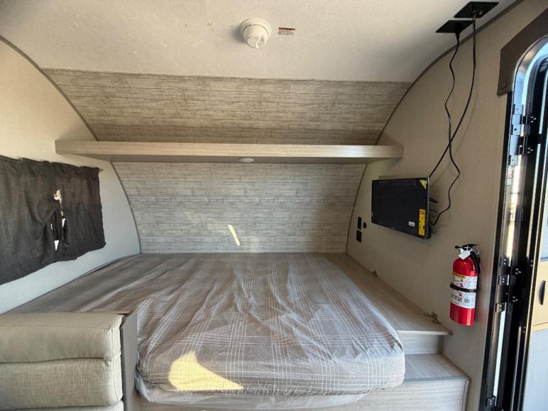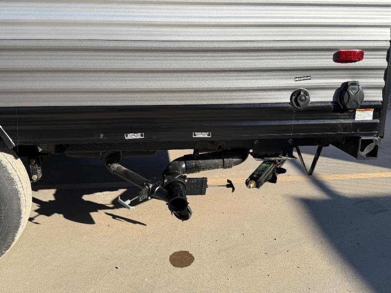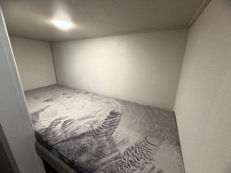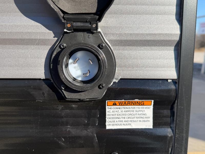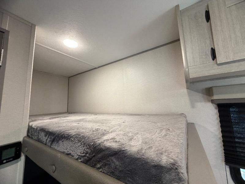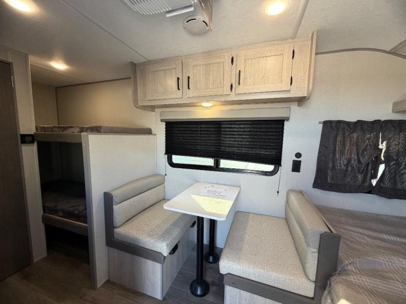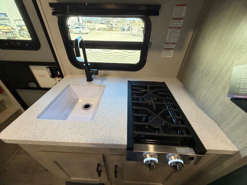 This travel trailers is perfect for a young family or smaller group. You can easily sleep four or more with the rear set of bunk beds and queen bed up front. There is also a booth dinette for inside down-time, as well as complete kitchen and bath amenities so you can cook and stay clean while traveling. The rear corner bath features a toilet and 36" x 30" shower, and it's conveniently located next to the bunk beds which is great for little ones at night. Cooking inside will be easy with a GE stainless two-burner cooktop and single sink, plus there is also a GE microwave oven for snacks and things that you can easily warm up. If you plan to spend most of your time outdoors, you will find plenty of storage space in the front exterior storage compartment, and there is also plenty of storage inside as well.