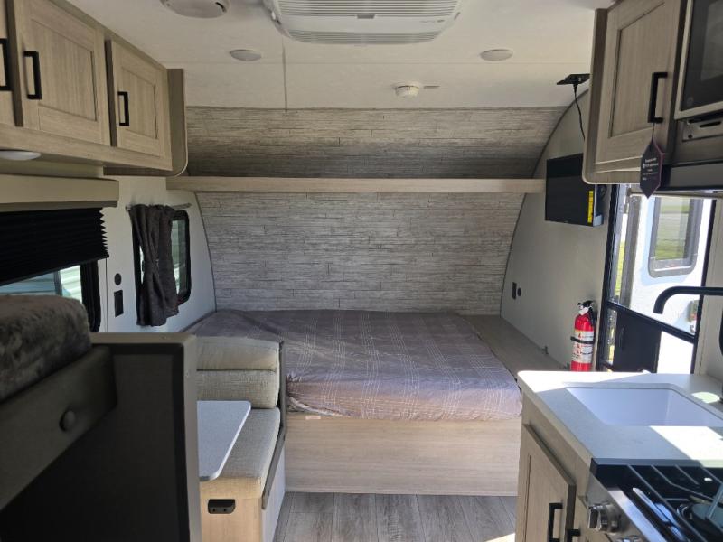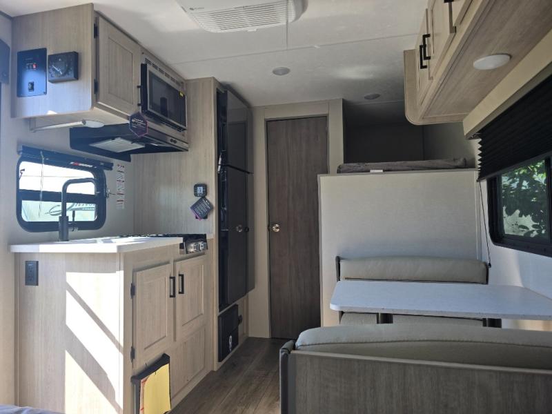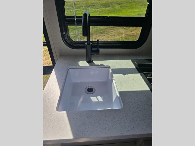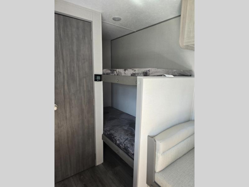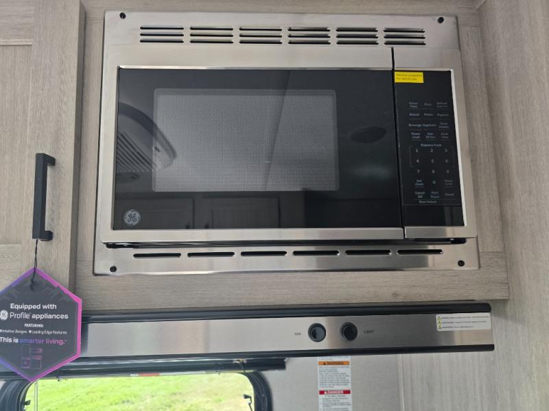 This travel trailers is perfect for a young family or smaller group. You can easily sleep four or more with the rear set of bunk beds and queen bed up front. There is also a booth dinette for inside down-time, as well as complete kitchen and bath amenities so you can cook and stay clean while traveling. The rear corner bath features a toilet and 36" x 30" shower, and it's conveniently located next to the bunk beds which is great for little ones at night. Cooking inside will be easy with a GE stainless two-burner cooktop and single sink, plus there is also a GE microwave oven for snacks and things that you can easily warm up. If you plan to spend most of your time outdoors, you will find plenty of storage space in the front exterior storage compartment, and there is also plenty of storage inside as well.