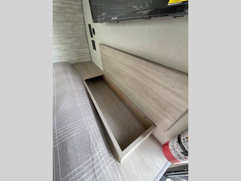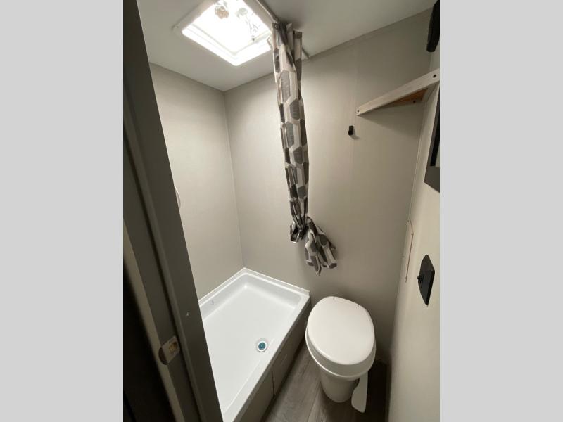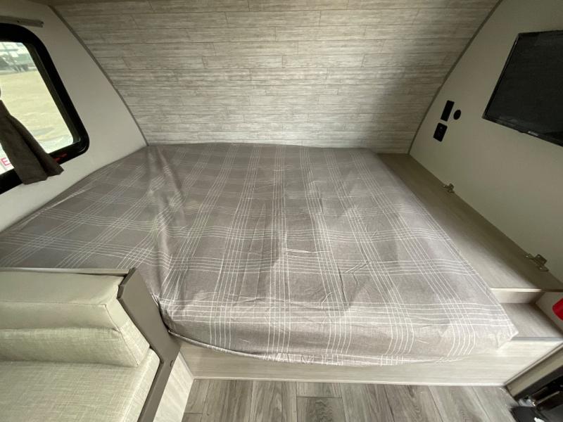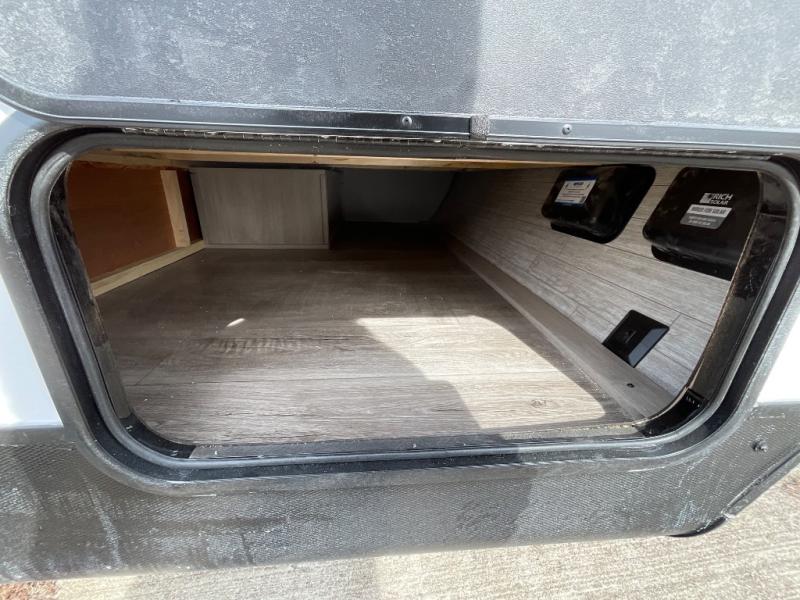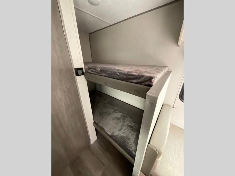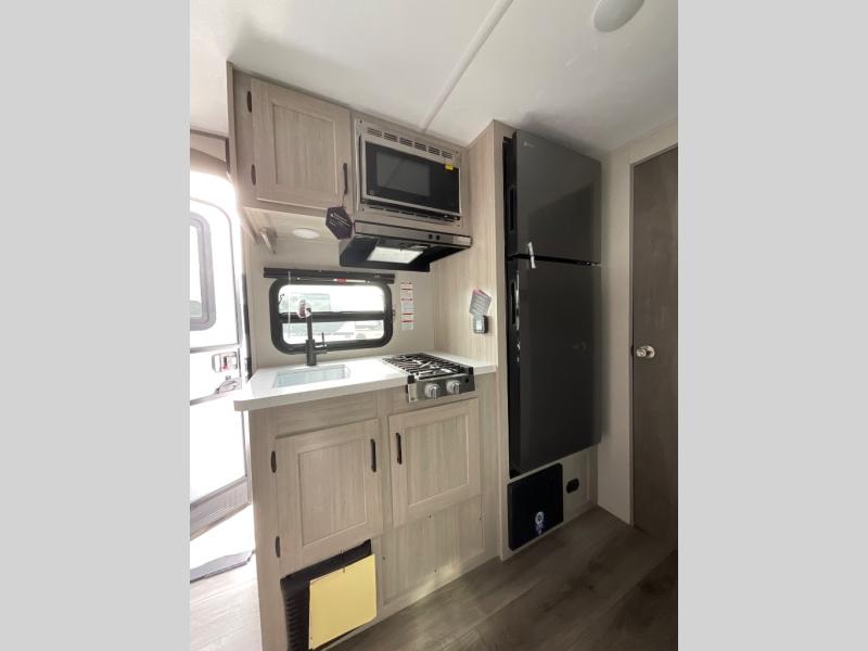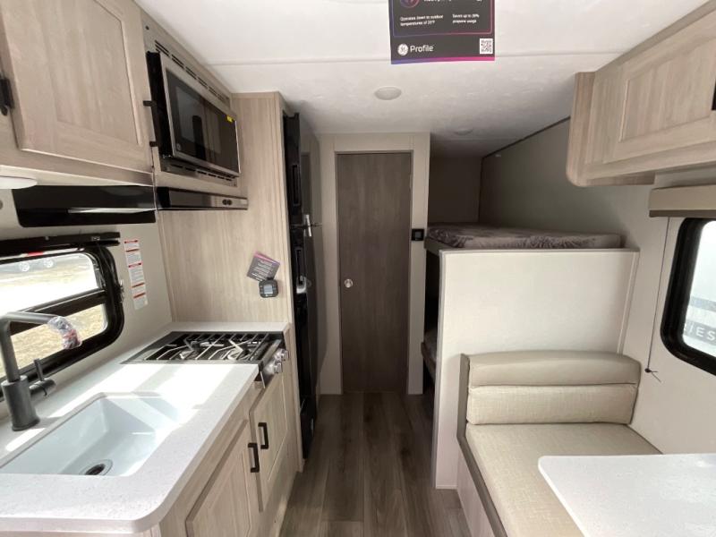 This travel trailers is perfect for a young family or smaller group. You can easily sleep four or more with the rear set of bunk beds and queen bed up front. There is also a booth dinette for inside down-time, as well as complete kitchen and bath amenities so you can cook and stay clean while traveling. The rear corner bath features a toilet and 36" x 30" shower, and it's conveniently located next to the bunk beds which is great for little ones at night. Cooking inside will be easy with a GE stainless two-burner cooktop and single sink, plus there is also a GE microwave oven for snacks and things that you can easily warm up. If you plan to spend most of your time outdoors, you will find plenty of storage space in the front exterior storage compartment, and there is also plenty of storage inside as well.