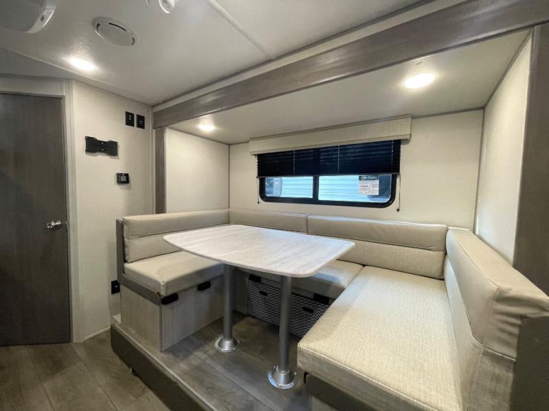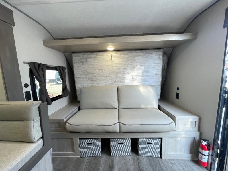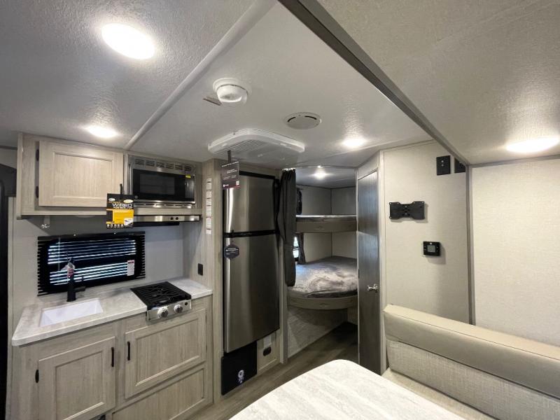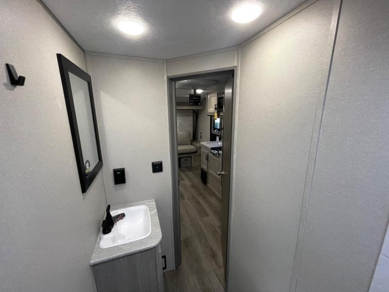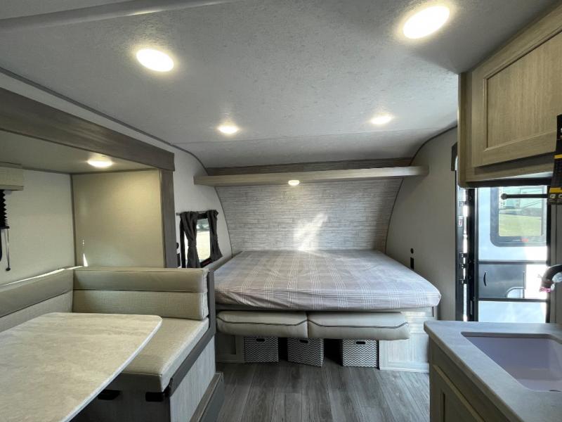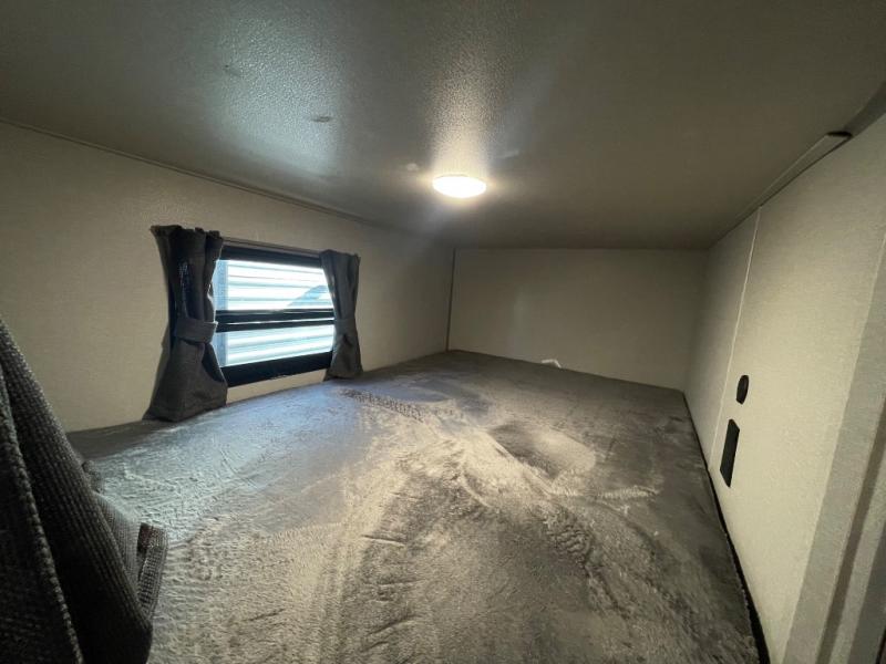This trailer is easy to tow, store, and maneuver at campgrounds into parking spots! After a day of exploring, everyone can enjoy napping or falling asleep on the double-size bunks next to the full bathroom, or on the Murphy bed up front. There is also under-bunk storage for lake gear or extra luggage! This front multi-use space offers both a living area and bedroom depending on the time of day. The U-shaped dinette gives everyone a place to dine inside, or you can head outside to grab your camping chairs from the pass-through storage and dine under the 15' power awning with multicolor LED lights. There is much more to enjoy inside and outside, and you might like to add the optional camper kitchen as well.