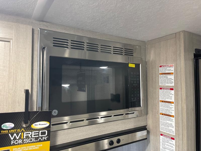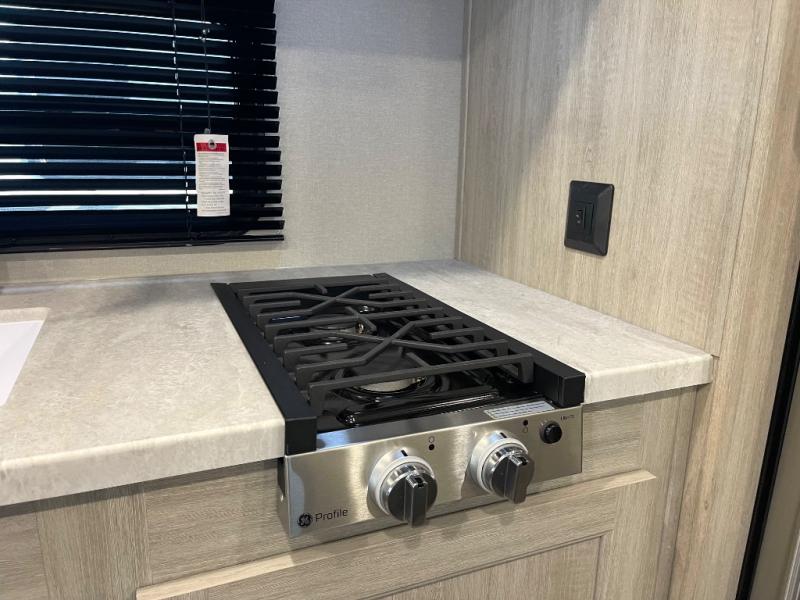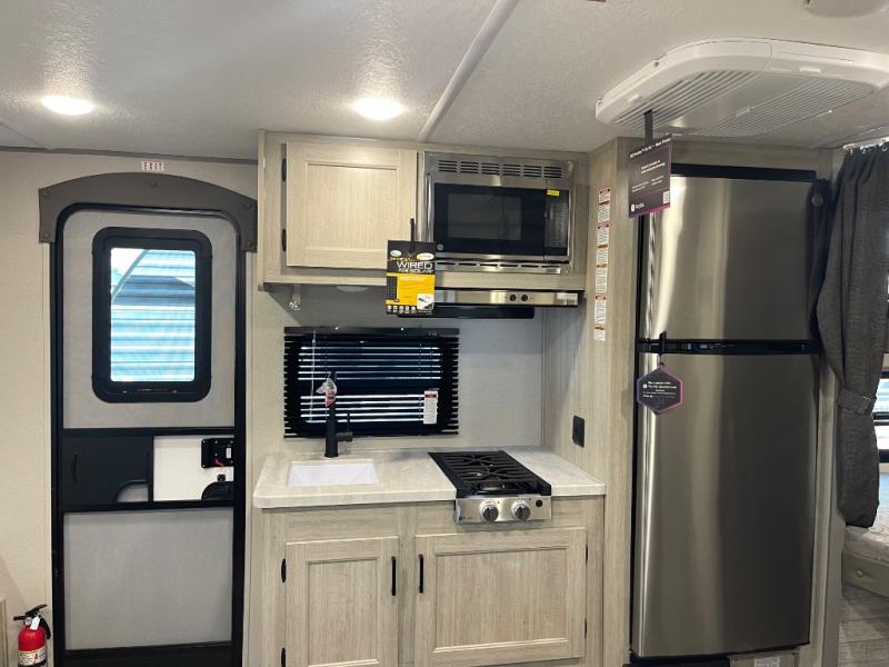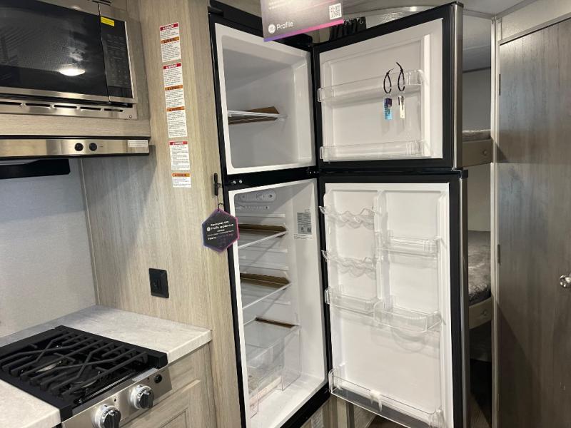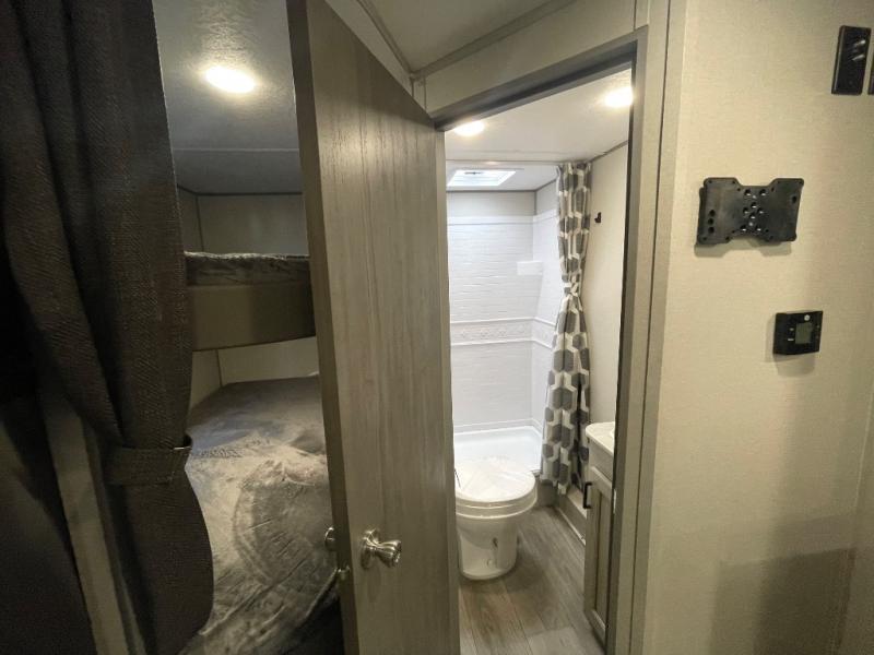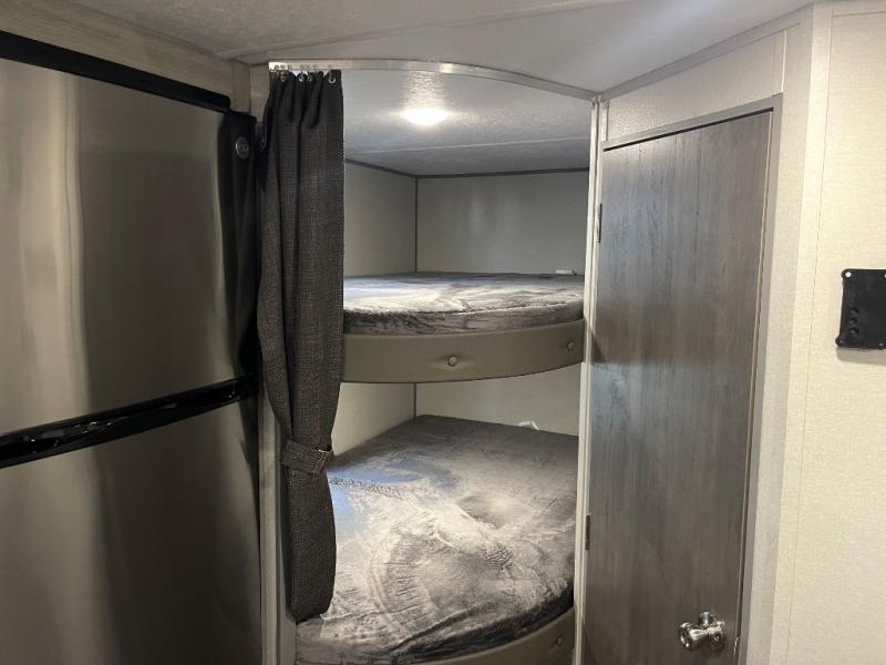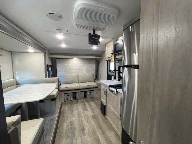 This trailer is easy to tow, store, and maneuver at campgrounds into parking spots! After a day of exploring, everyone can enjoy napping or falling asleep on the double-size bunks next to the full bathroom, or on the Murphy bed up front. There is also under-bunk storage for lake gear or extra luggage! This front multi-use space offers both a living area and bedroom depending on the time of day. The U-shaped dinette gives everyone a place to dine inside, or you can head outside to grab your camping chairs from the pass-through storage and dine under the 15' power awning with multicolor LED lights. There is much more to enjoy inside and outside, and you might like to add the optional camper kitchen as well.