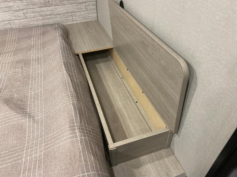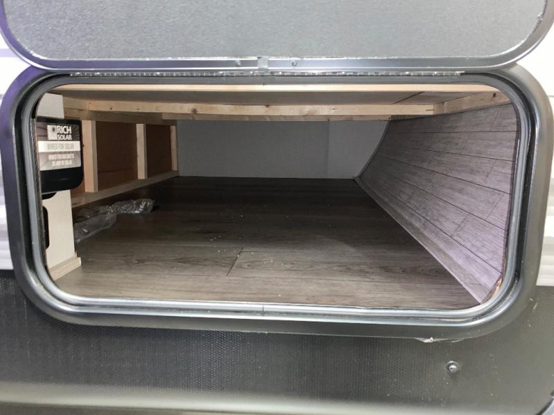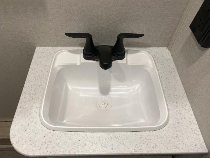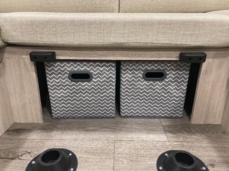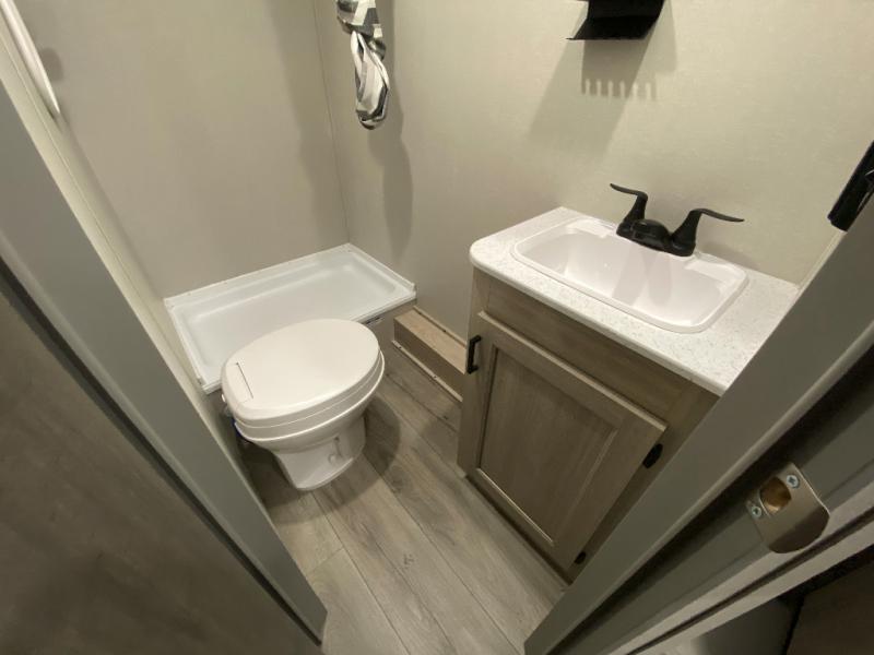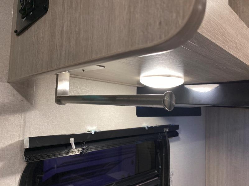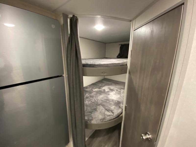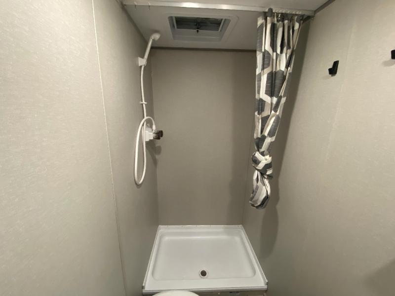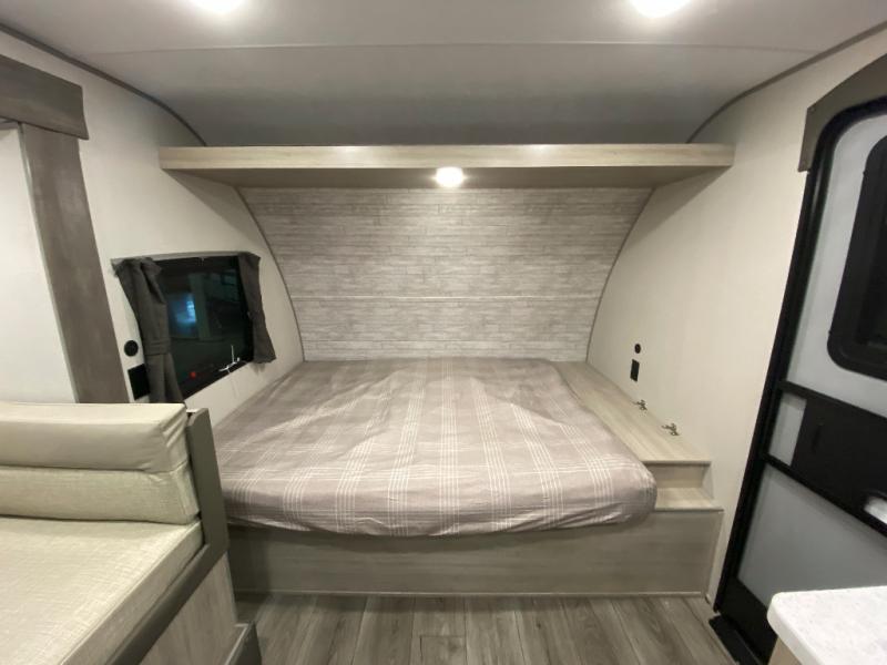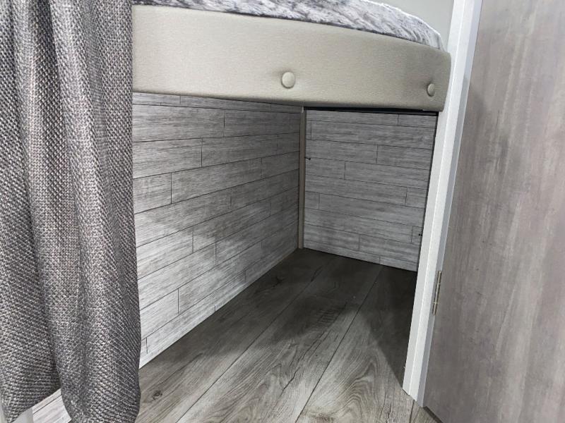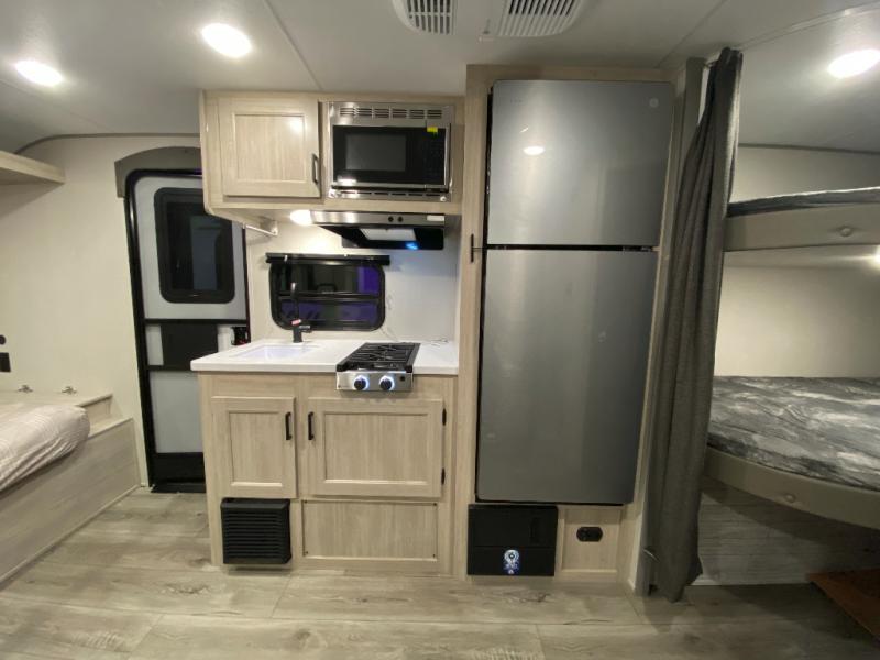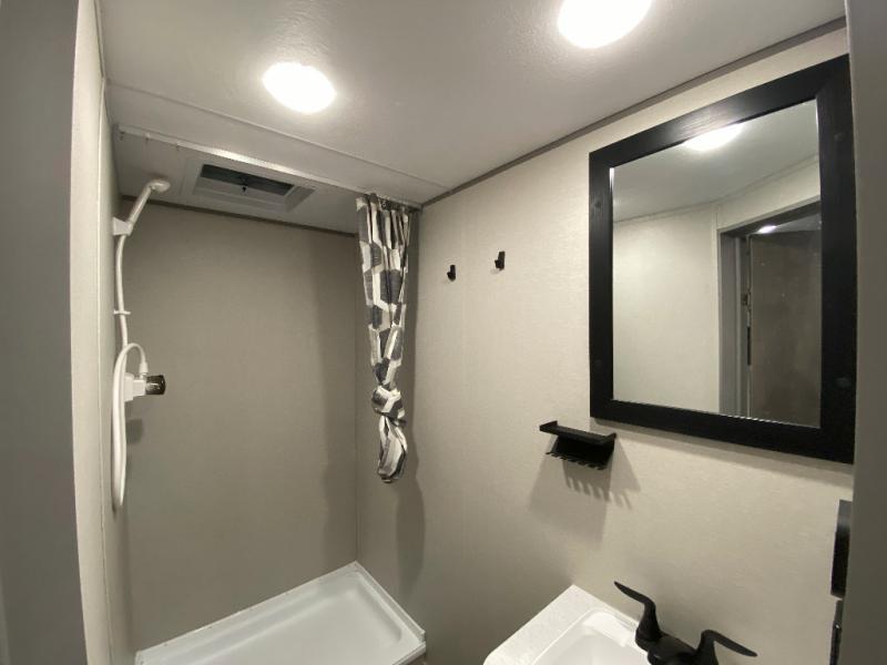 This trailer is easy to tow, store, and maneuver at campgrounds into parking spots! After a day of exploring, everyone can enjoy napping or falling asleep on the double-size bunks next to the full bathroom, or on the Murphy bed up front. There is also under-bunk storage for lake gear or extra luggage! This front multi-use space offers both a living area and bedroom depending on the time of day. The U-shaped dinette gives everyone a place to dine inside, or you can head outside to grab your camping chairs from the pass-through storage and dine under the 15' power awning with multicolor LED lights. There is much more to enjoy inside and outside, and you might like to add the optional camper kitchen as well.