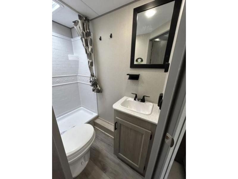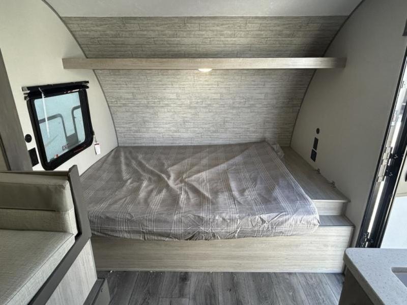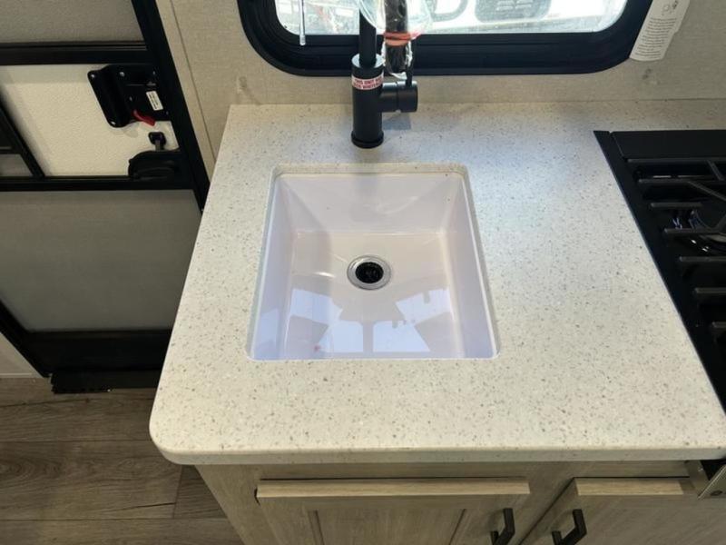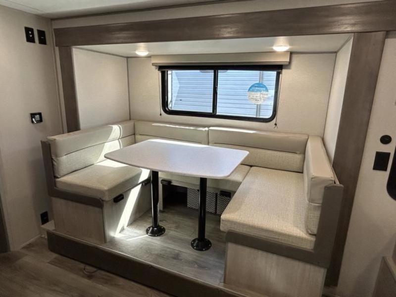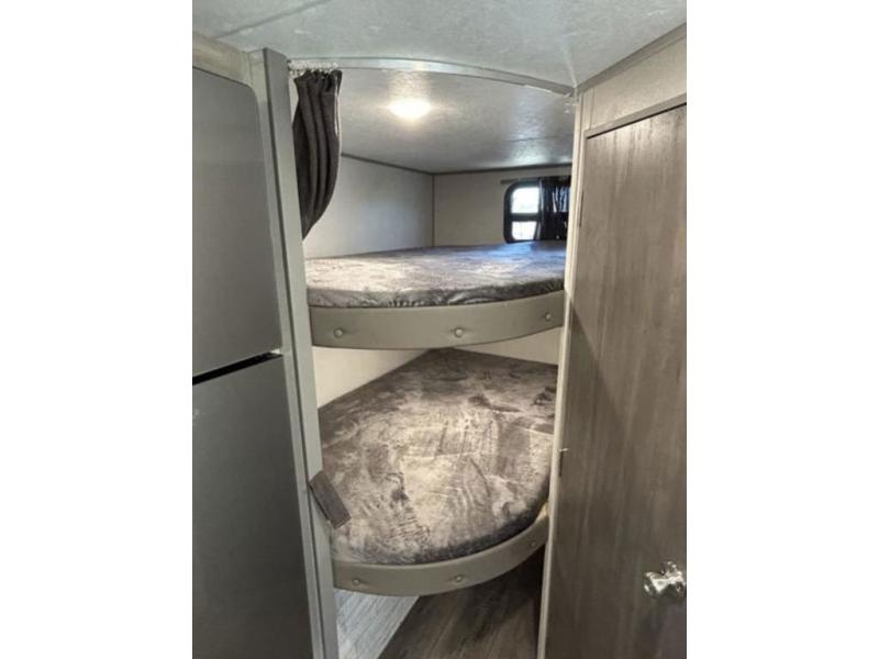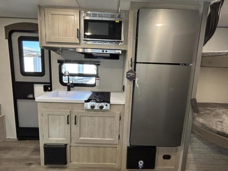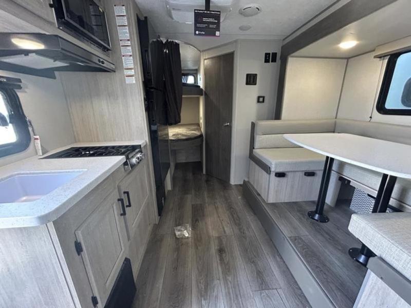 This trailer is easy to tow, store, and maneuver at campgrounds into parking spots! After a day of exploring, everyone can enjoy napping or falling asleep on the double-size bunks next to the full bathroom, or on the Murphy bed up front. There is also under-bunk storage for lake gear or extra luggage! This front multi-use space offers both a living area and bedroom depending on the time of day. The U-shaped dinette gives everyone a place to dine inside, or you can head outside to grab your camping chairs from the pass-through storage and dine under the 15' power awning with multicolor LED lights. There is much more to enjoy inside and outside, and you might like to add the optional camper kitchen as well.