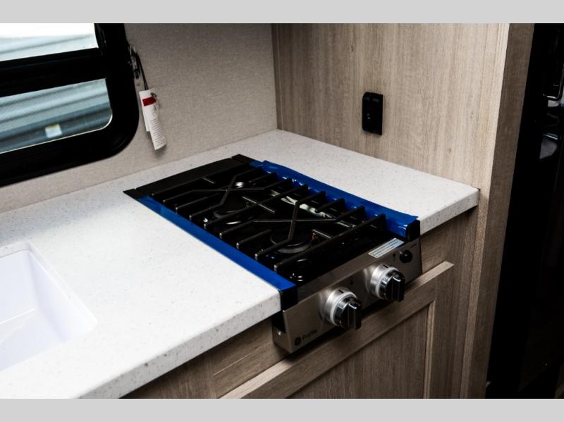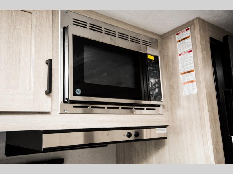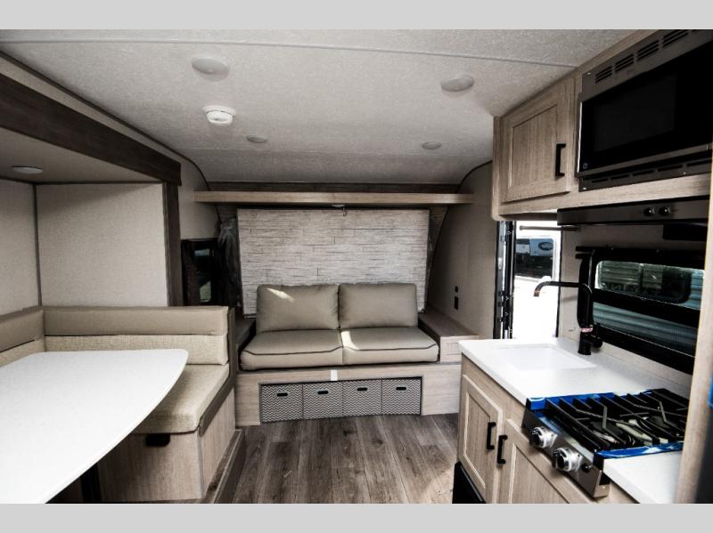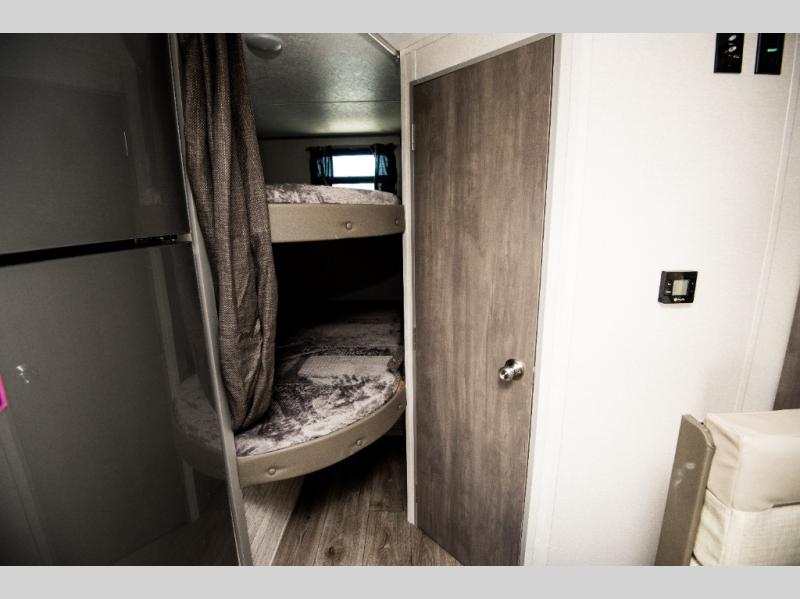 This spacious travel trailer can sleep eight campers each night thanks to the double-size bunks in the back, the U-shaped dinette within the slide out, and the queen bed up front! You can easily make meals for your crew with the two burner cooktop and microwave oven, and leftovers can go in the 10.7 cu. ft. 12V refrigerator! After you've cleaned up in the full bath, head outdoors to relax under the 15' power awning with multicolor LED lights and a remote!