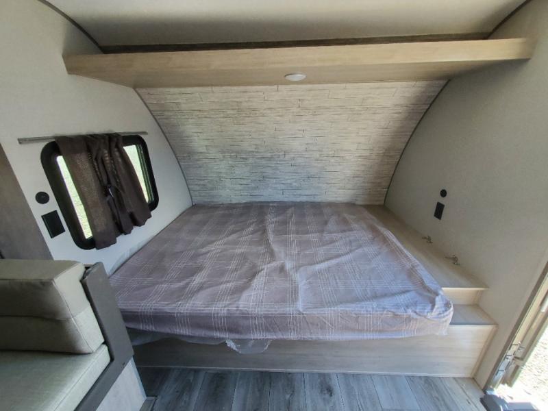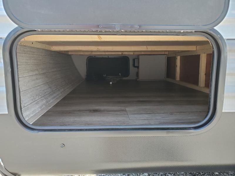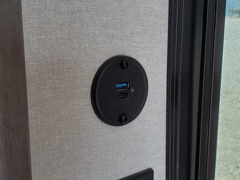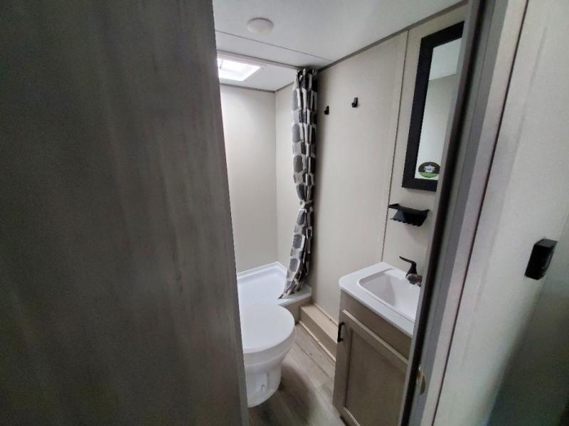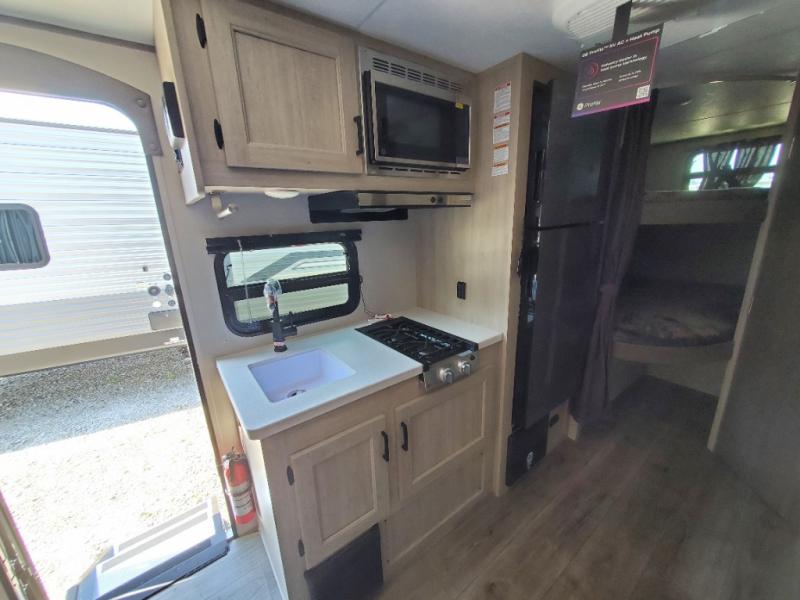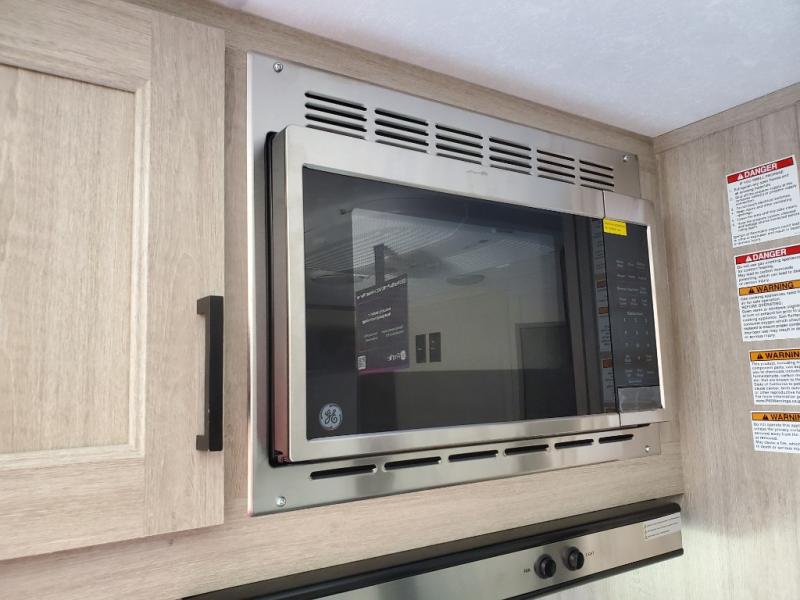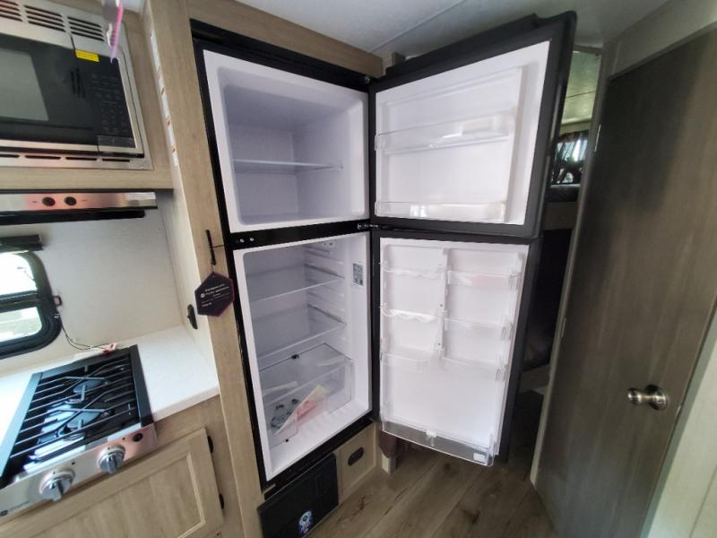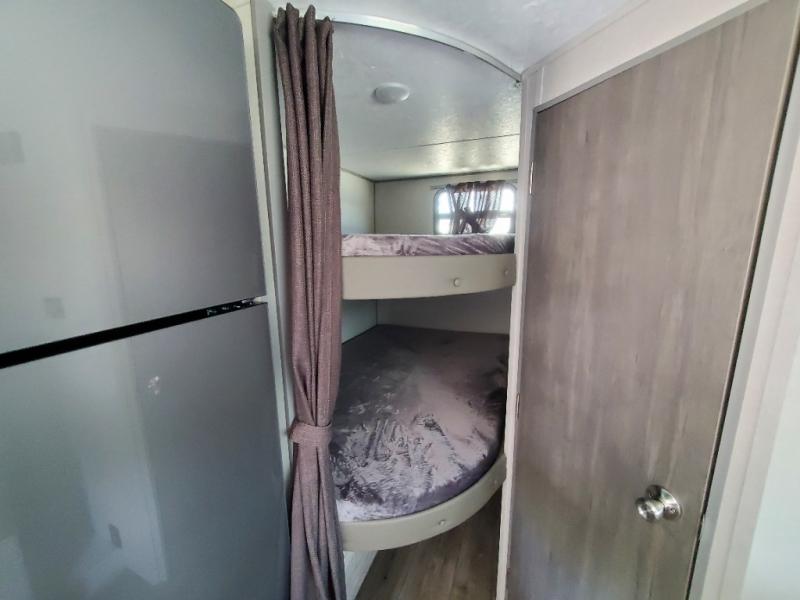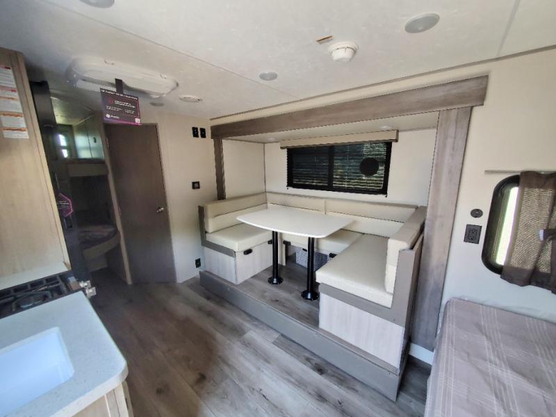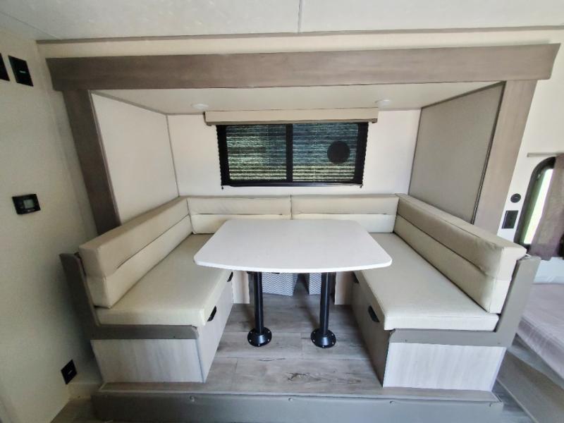 This spacious travel trailer can sleep eight campers each night thanks to the double-size bunks in the back, the U-shaped dinette within the slide out, and the queen bed up front! You can easily make meals for your crew with the two burner cooktop and microwave oven, and leftovers can go in the 10.7 cu. ft. 12V refrigerator! After you've cleaned up in the full bath, head outdoors to relax under the 15' power awning with multicolor LED lights and a remote!