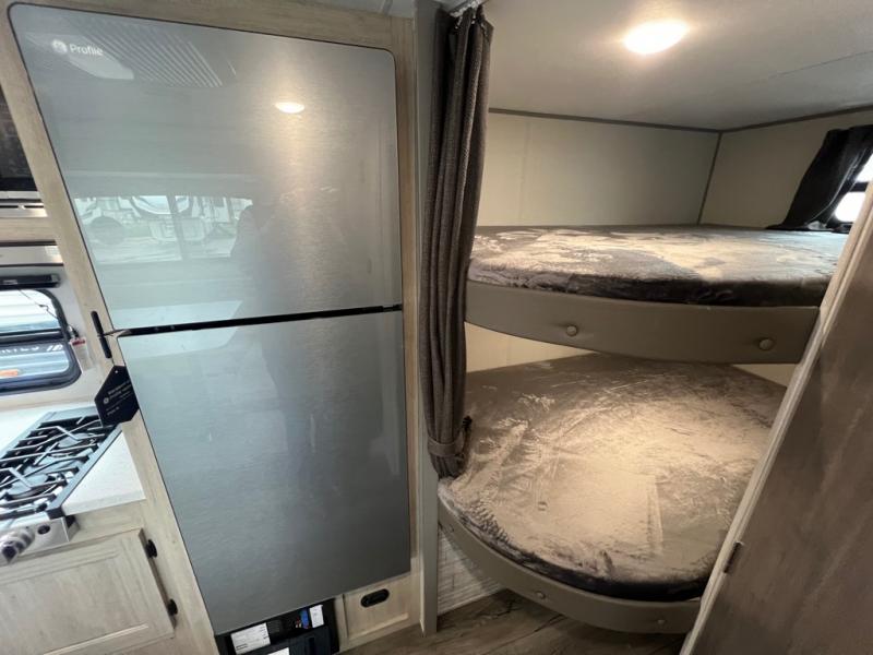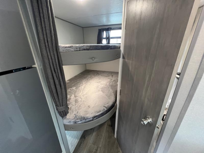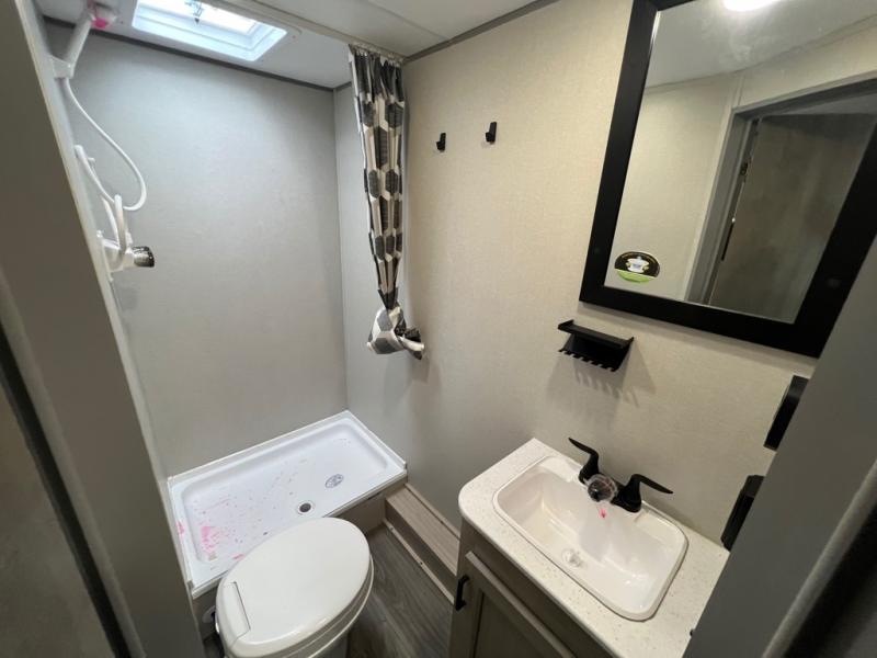This spacious travel trailer can sleep eight campers each night thanks to the double-size bunks in the back, the U-shaped dinette within the slide out, and the queen bed up front! You can easily make meals for your crew with the two burner cooktop and microwave oven, and leftovers can go in the 10.7 cu. ft. 12V refrigerator! After you've cleaned up in the full bath, head outdoors to relax under the 15' power awning with multicolor LED lights and a remote!