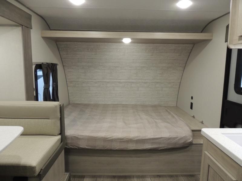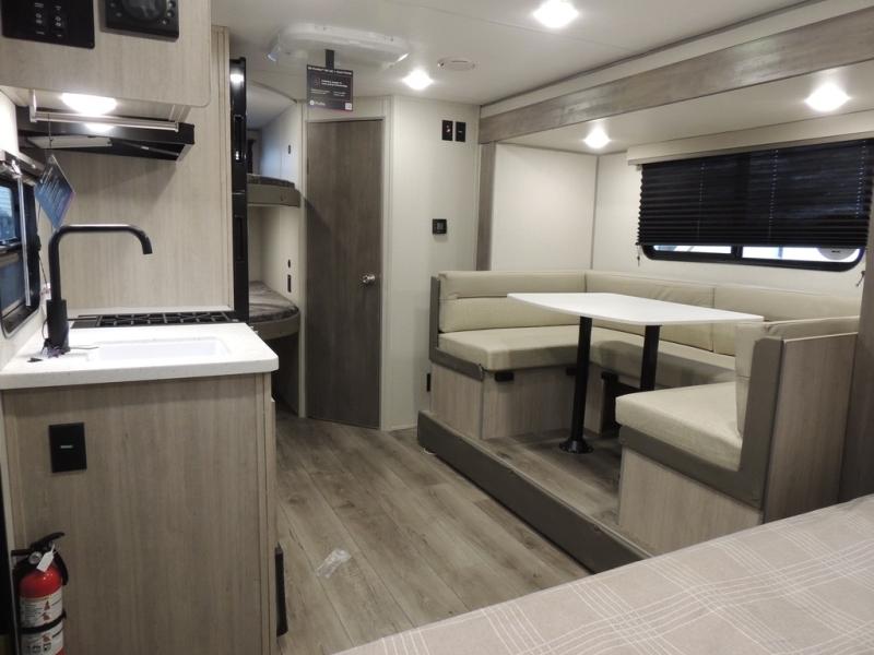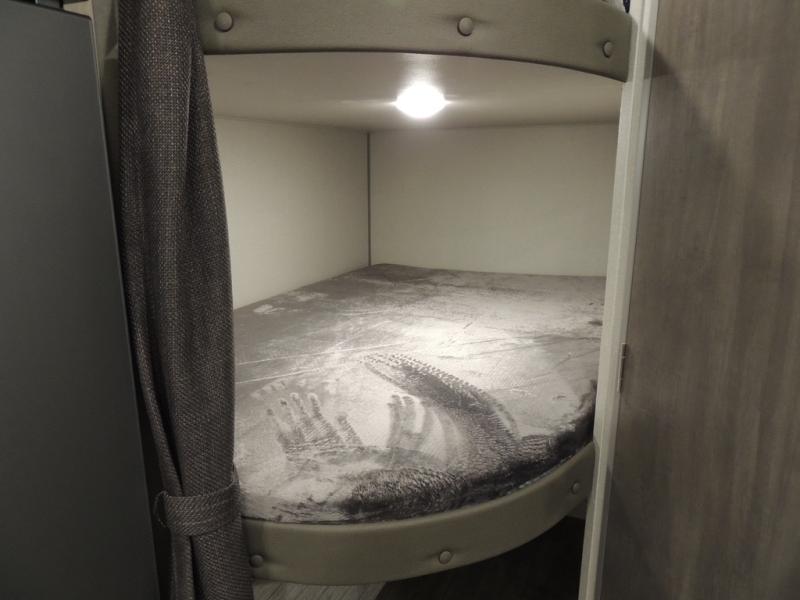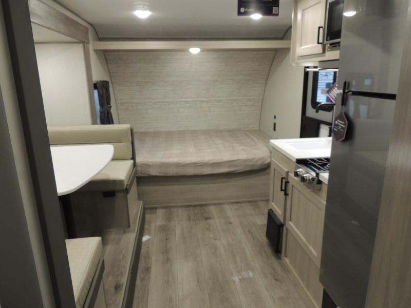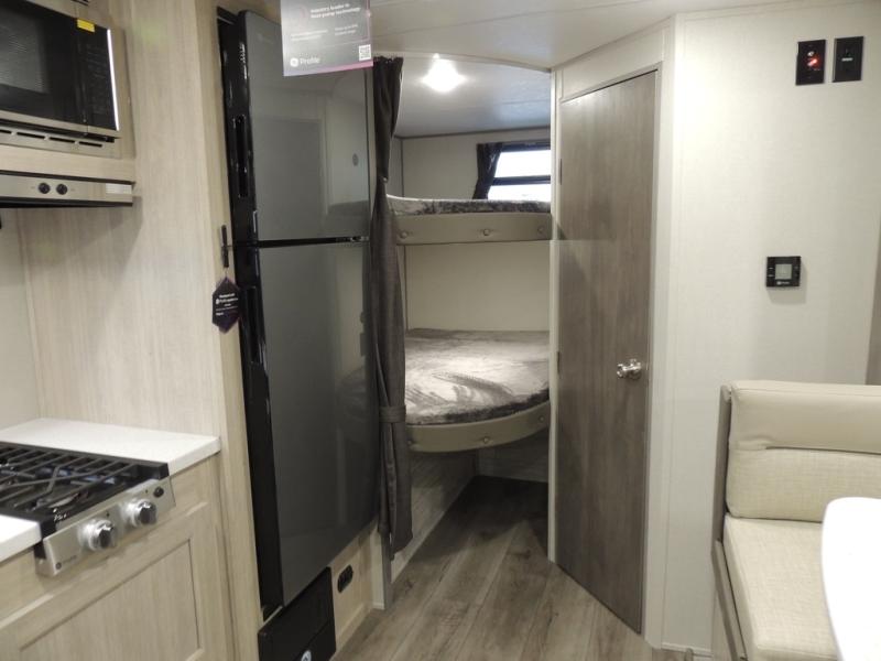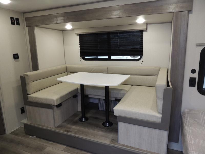 This spacious travel trailer can sleep eight campers each night thanks to the double-size bunks in the back, the U-shaped dinette within the slide out, and the queen bed up front! You can easily make meals for your crew with the two burner cooktop and microwave oven, and leftovers can go in the 10.7 cu. ft. 12V refrigerator! After you've cleaned up in the full bath, head outdoors to relax under the 15' power awning with multicolor LED lights and a remote!