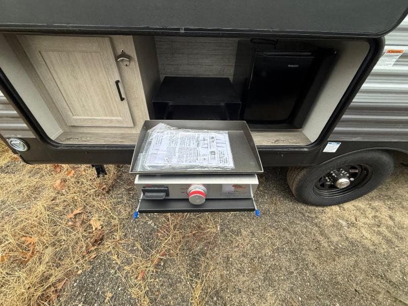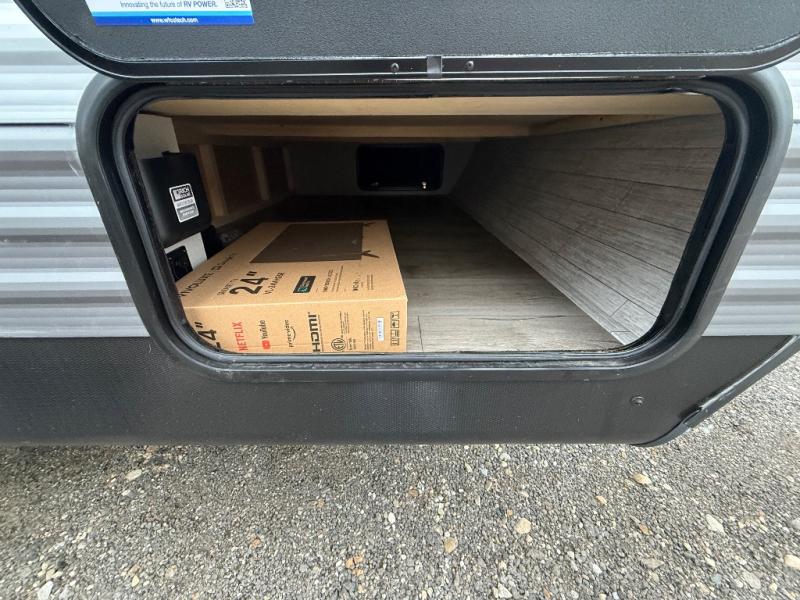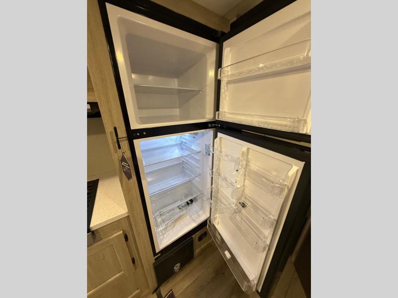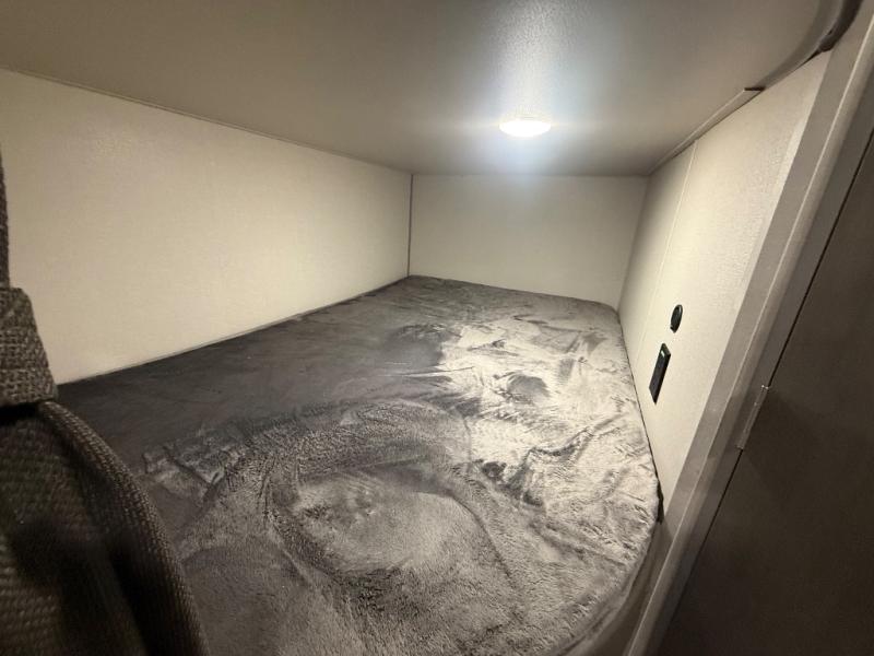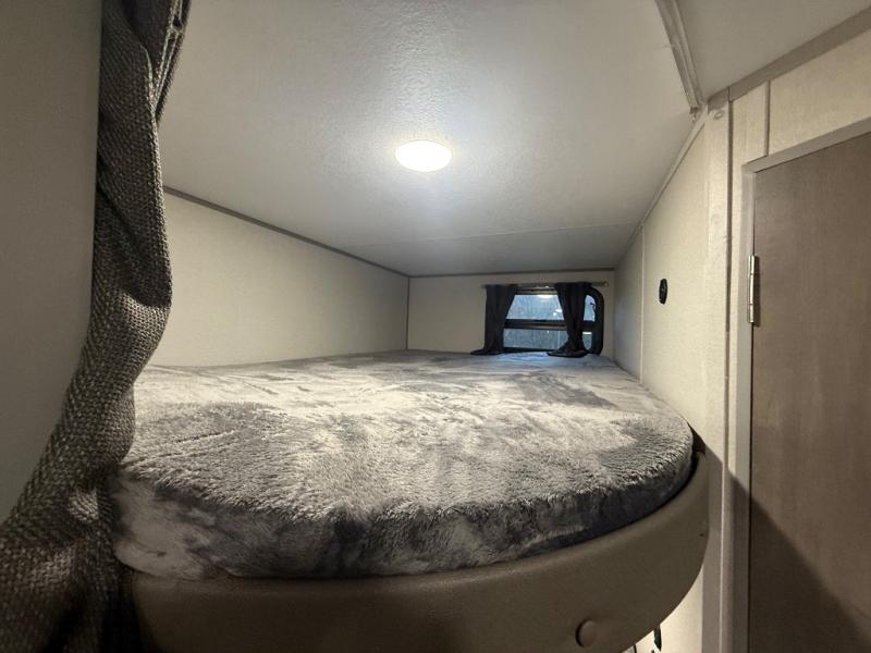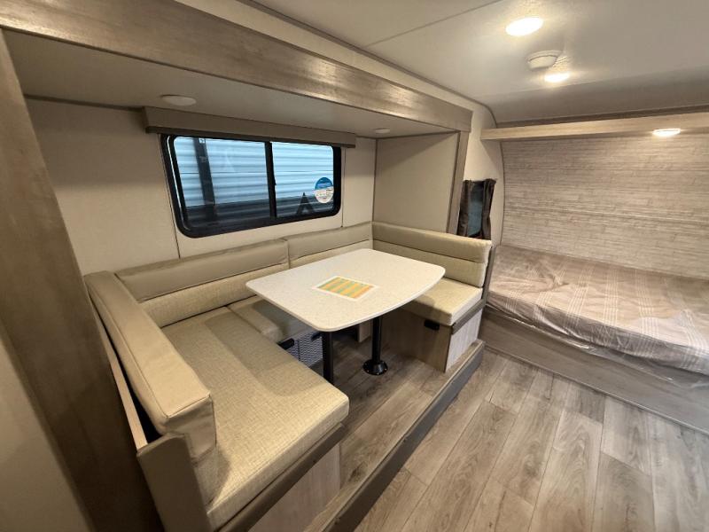 This spacious travel trailer can sleep eight campers each night thanks to the double-size bunks in the back, the U-shaped dinette within the slide out, and the queen bed up front! You can easily make meals for your crew with the two burner cooktop and microwave oven, and leftovers can go in the 10.7 cu. ft. 12V refrigerator! After you've cleaned up in the full bath, head outdoors to relax under the 15' power awning with multicolor LED lights and a remote!