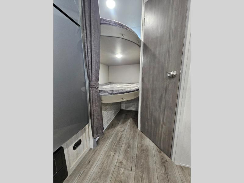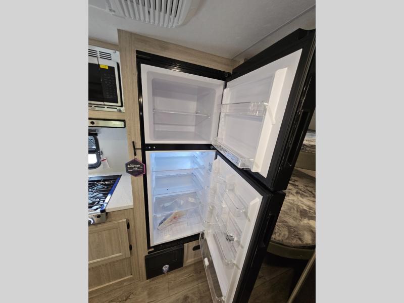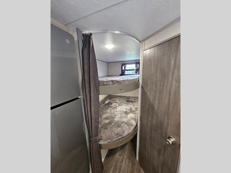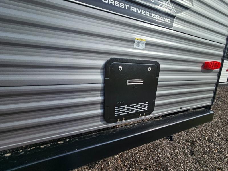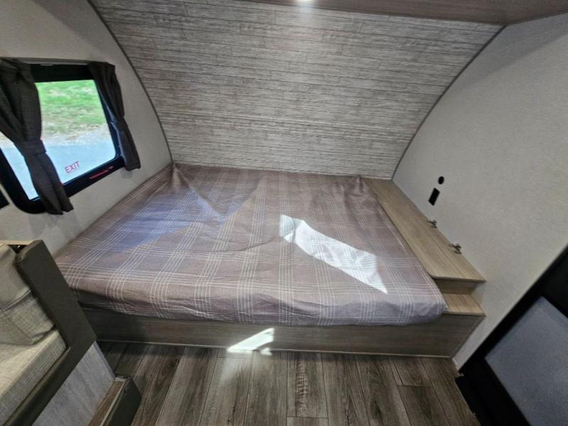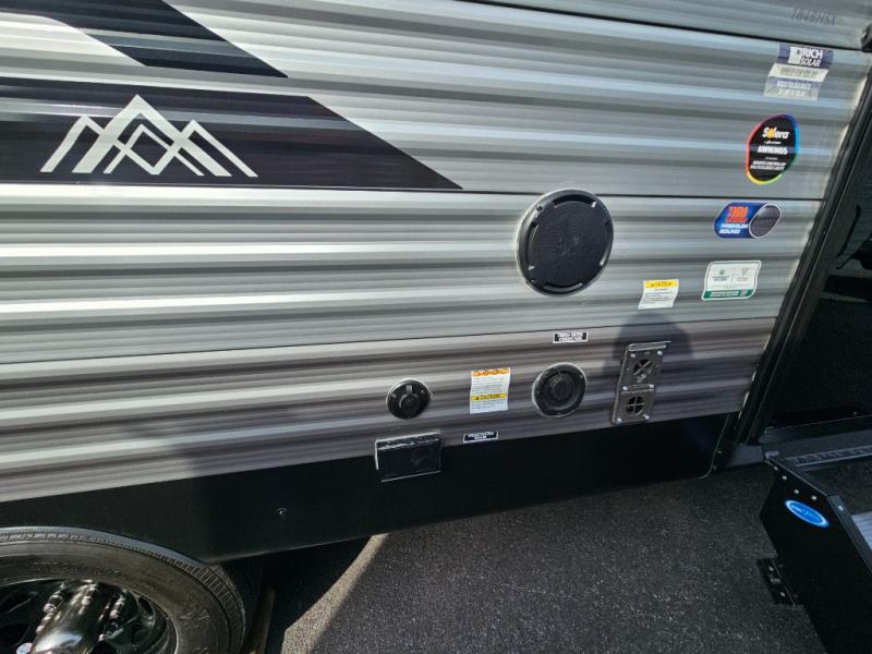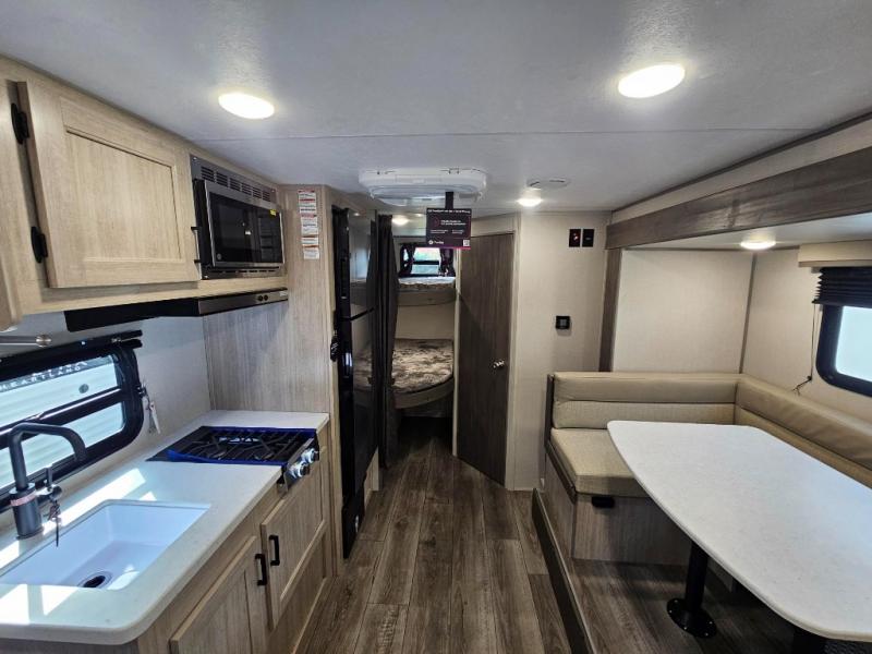This spacious travel trailer can sleep eight campers each night thanks to the double-size bunks in the back, the U-shaped dinette within the slide out, and the queen bed up front! You can easily make meals for your crew with the two burner cooktop and microwave oven, and leftovers can go in the 10.7 cu. ft. 12V refrigerator! After you've cleaned up in the full bath, head outdoors to relax under the 15' power awning with multicolor LED lights and a remote!