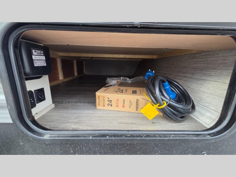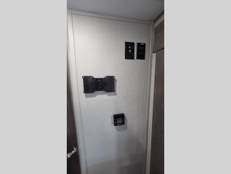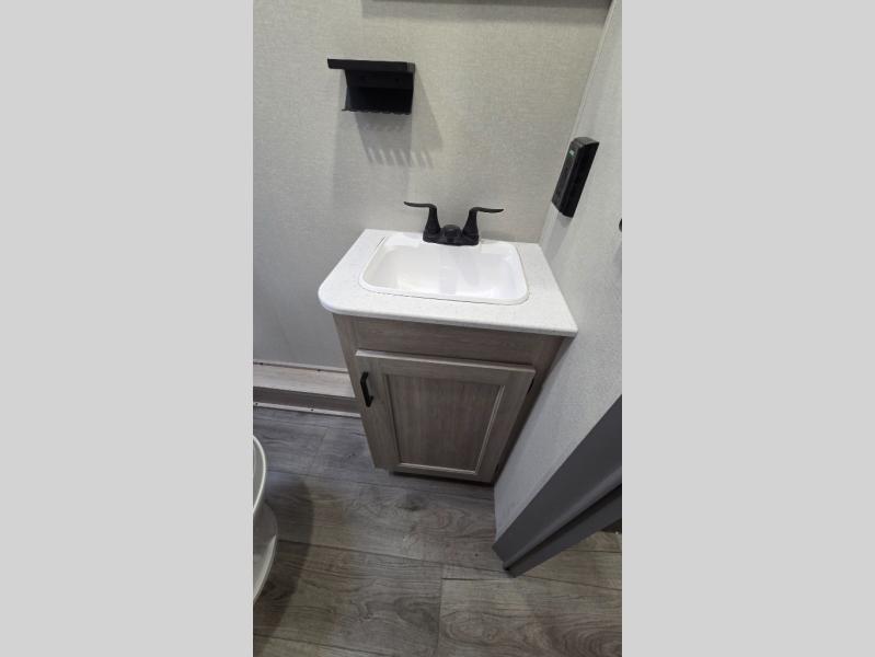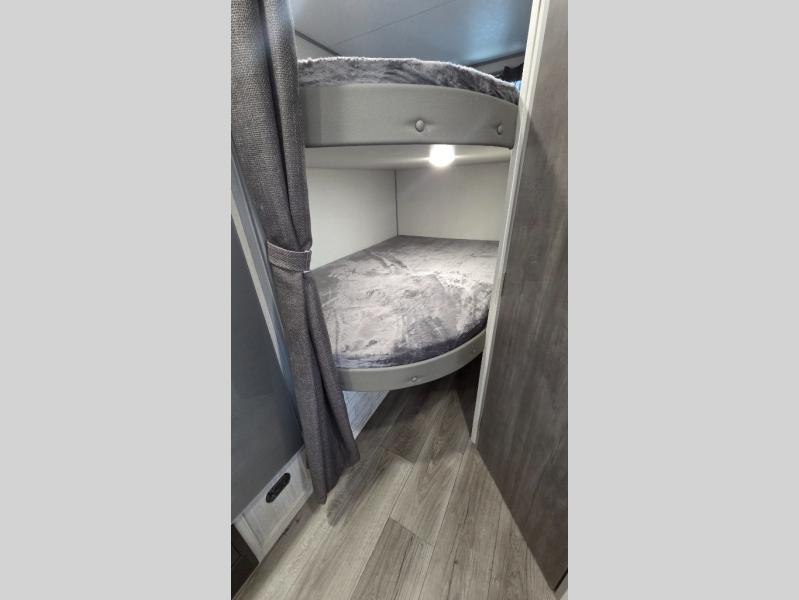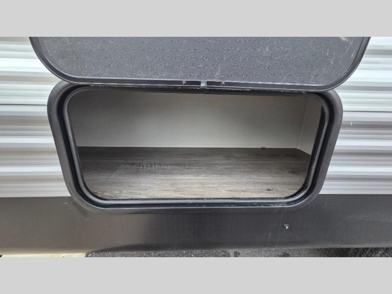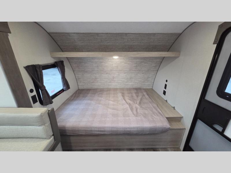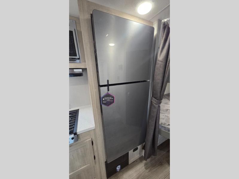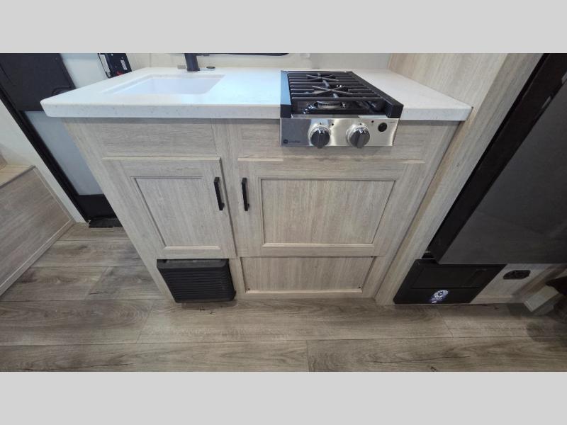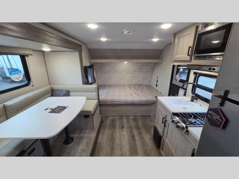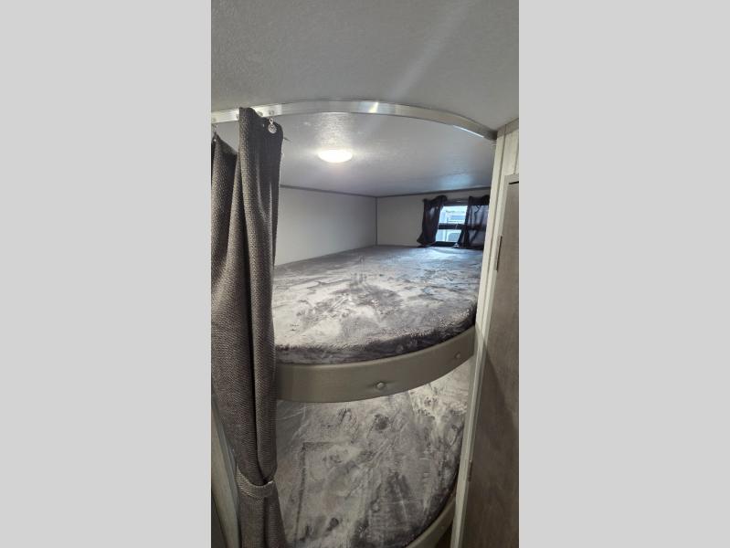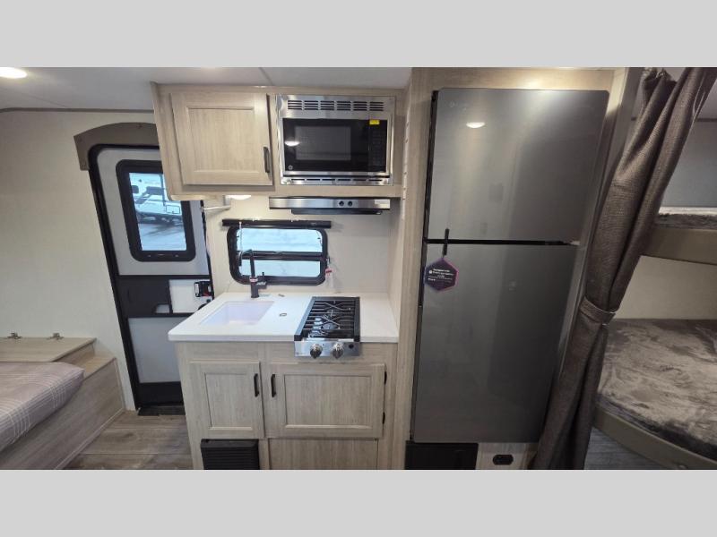 This spacious travel trailer can sleep eight campers each night thanks to the double-size bunks in the back, the U-shaped dinette within the slide out, and the queen bed up front! You can easily make meals for your crew with the two burner cooktop and microwave oven, and leftovers can go in the 10.7 cu. ft. 12V refrigerator! After you've cleaned up in the full bath, head outdoors to relax under the 15' power awning with multicolor LED lights and a remote!