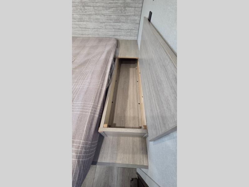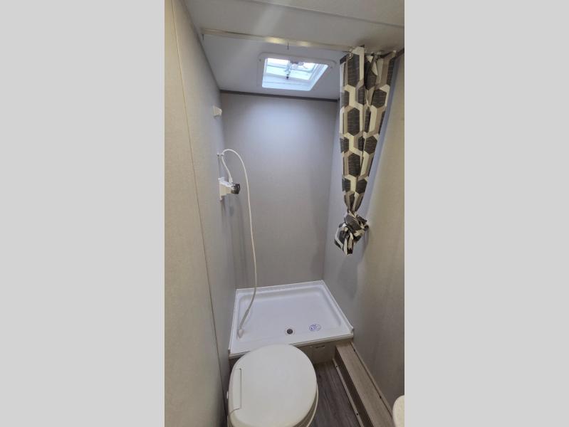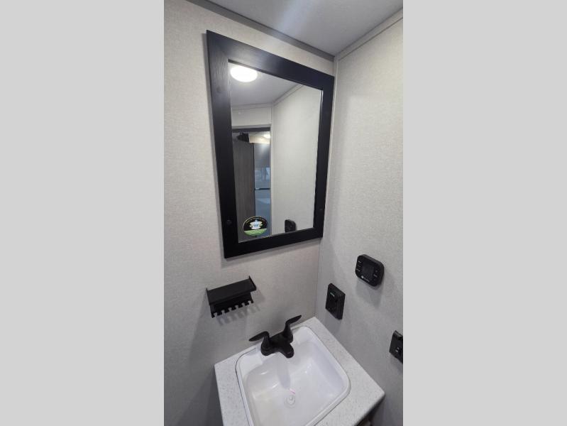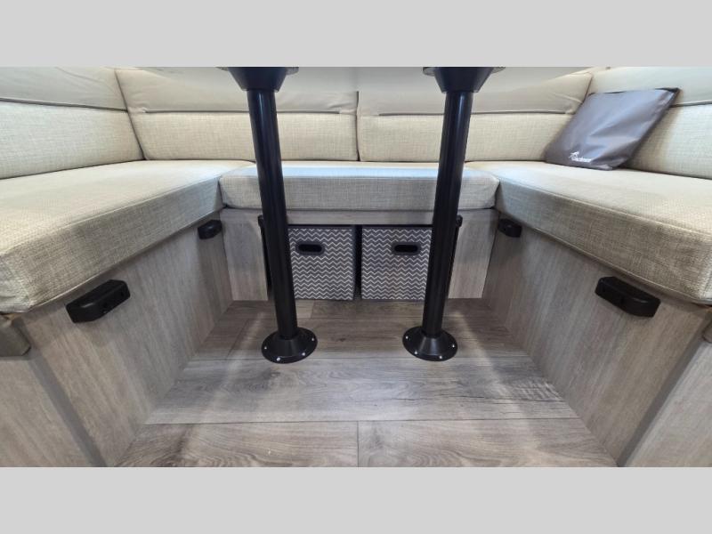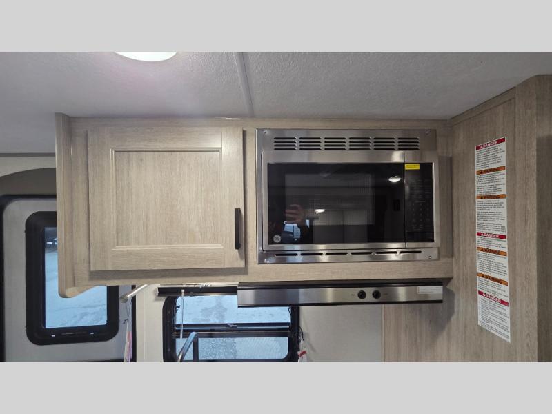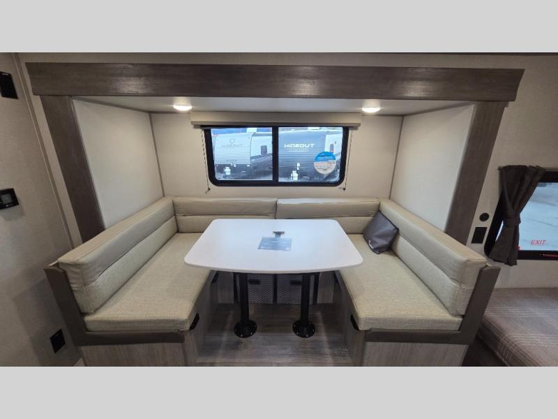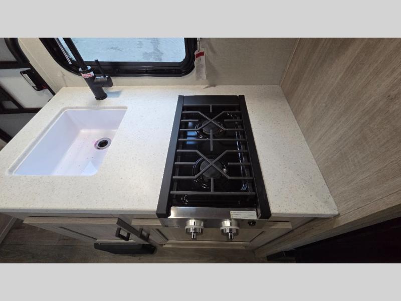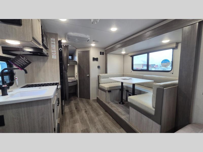 This spacious travel trailer can sleep eight campers each night thanks to the double-size bunks in the back, the U-shaped dinette within the slide out, and the queen bed up front! You can easily make meals for your crew with the two burner cooktop and microwave oven, and leftovers can go in the 10.7 cu. ft. 12V refrigerator! After you've cleaned up in the full bath, head outdoors to relax under the 15' power awning with multicolor LED lights and a remote!