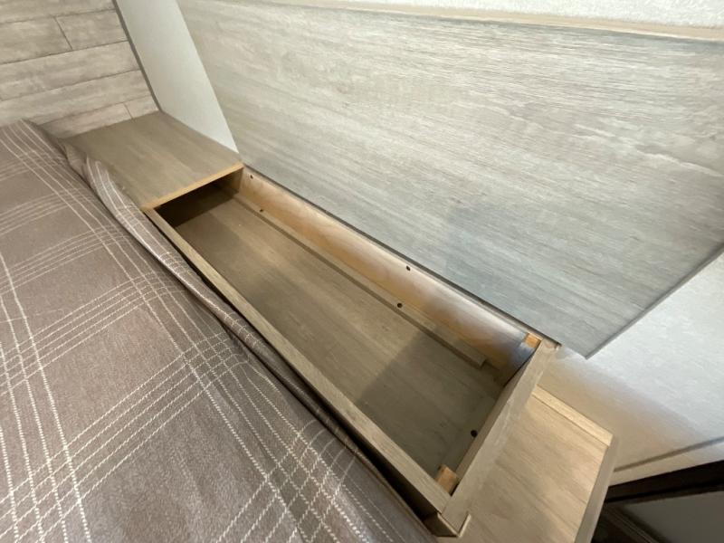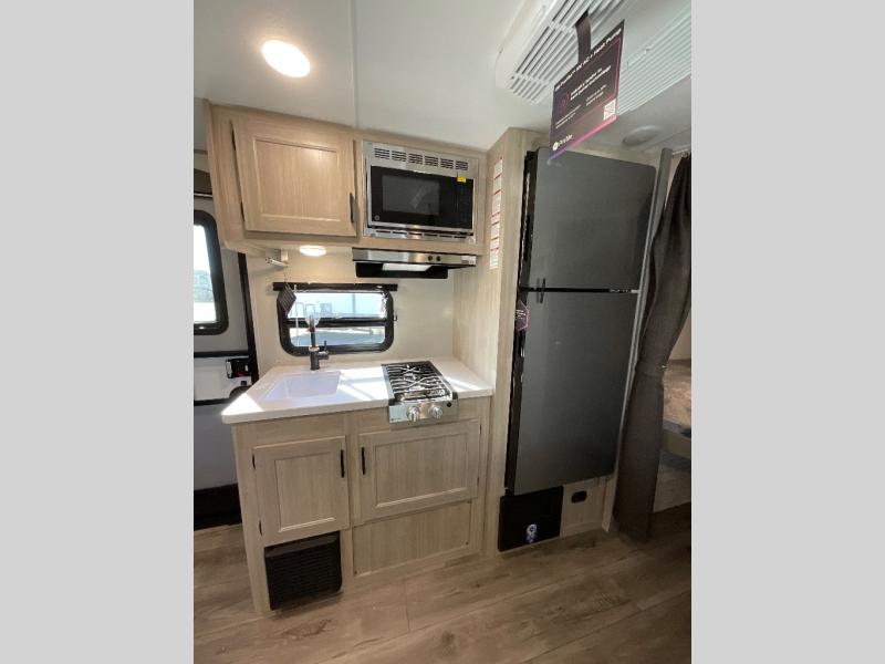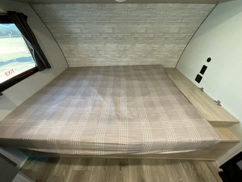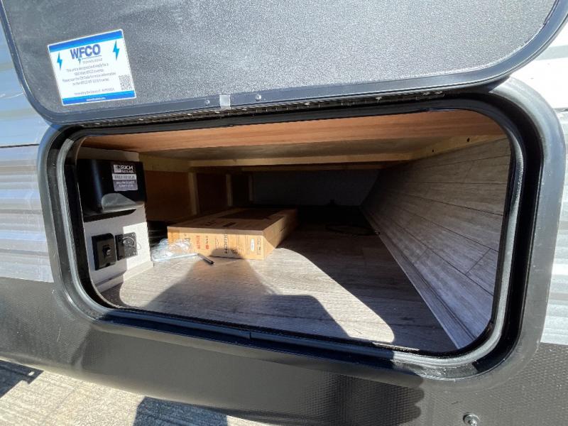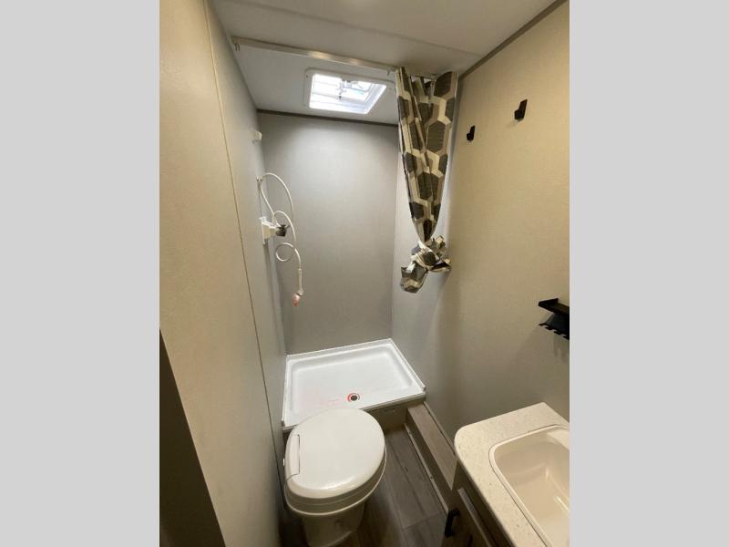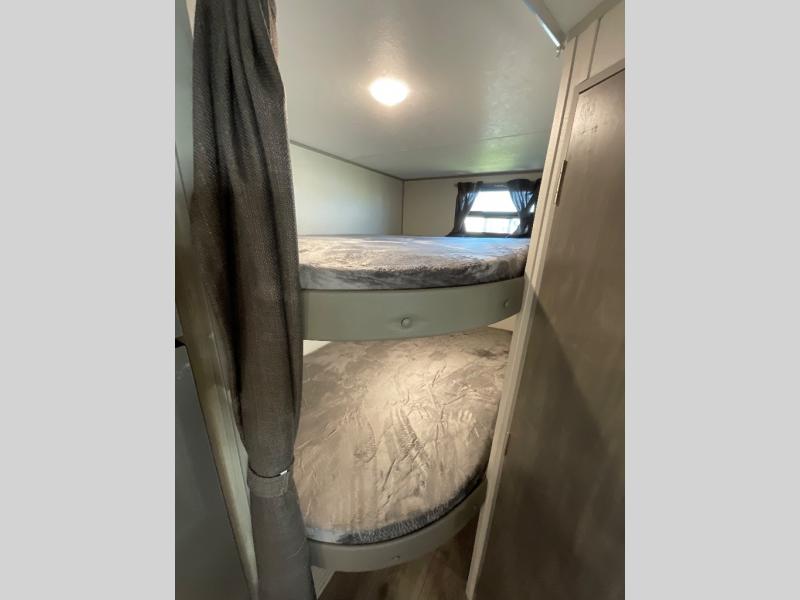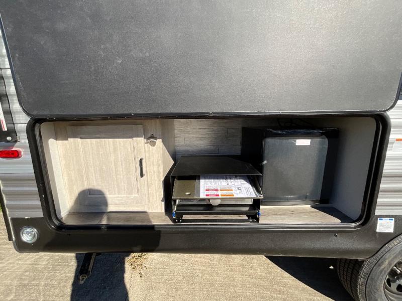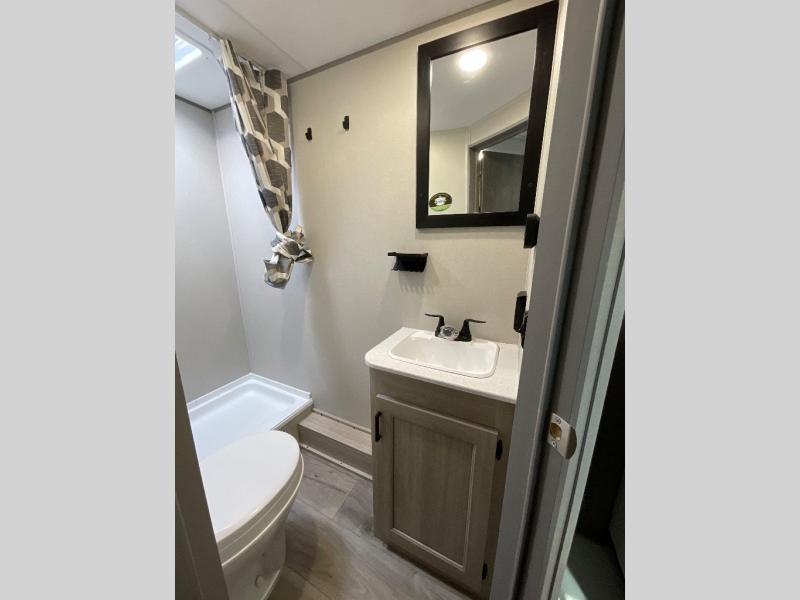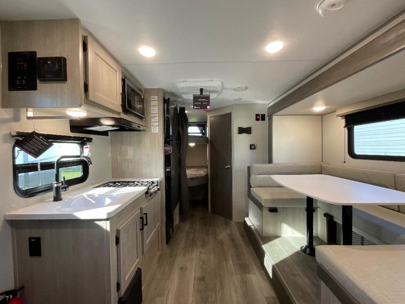 This spacious travel trailer can sleep eight campers each night thanks to the double-size bunks in the back, the U-shaped dinette within the slide out, and the queen bed up front! You can easily make meals for your crew with the two burner cooktop and microwave oven, and leftovers can go in the 10.7 cu. ft. 12V refrigerator! After you've cleaned up in the full bath, head outdoors to relax under the 15' power awning with multicolor LED lights and a remote!