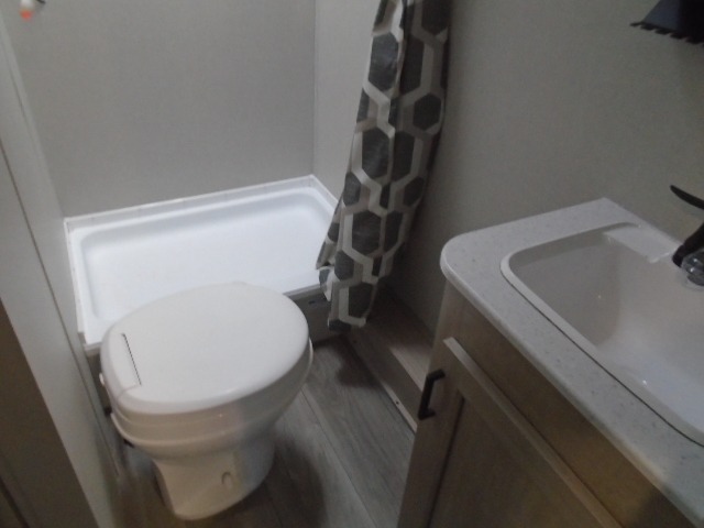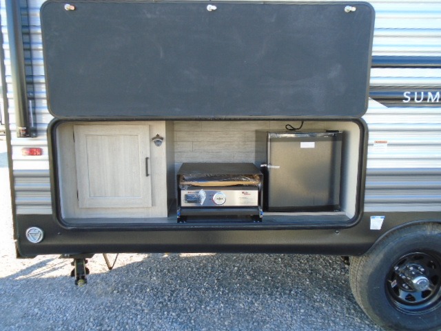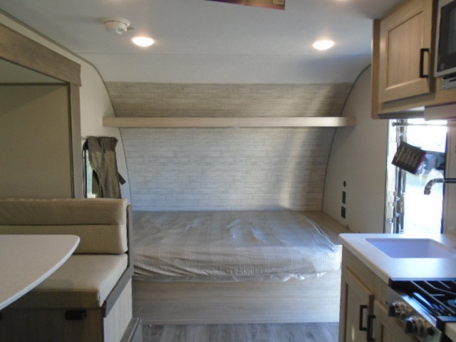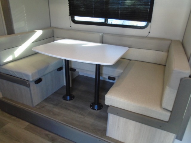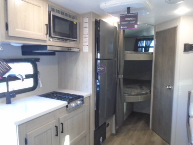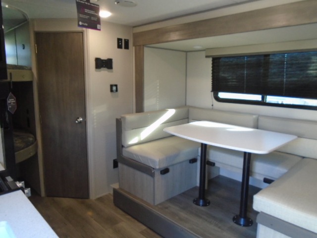 This spacious travel trailer can sleep eight campers each night thanks to the double-size bunks in the back, the U-shaped dinette within the slide out, and the queen bed up front! You can easily make meals for your crew with the two burner cooktop and microwave oven, and leftovers can go in the 10.7 cu. ft. 12V refrigerator! After you've cleaned up in the full bath, head outdoors to relax under the 15' power awning with multicolor LED lights and a remote!