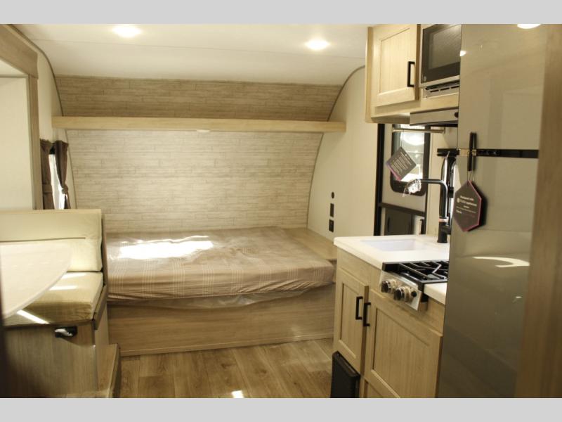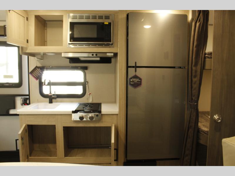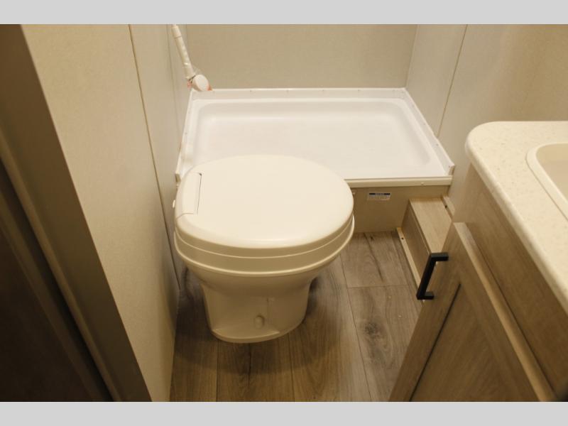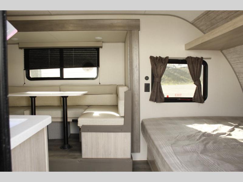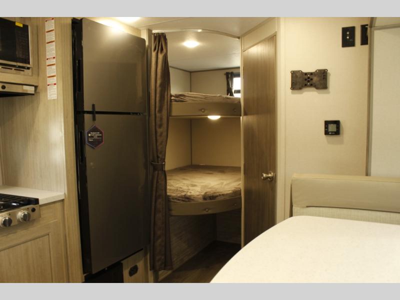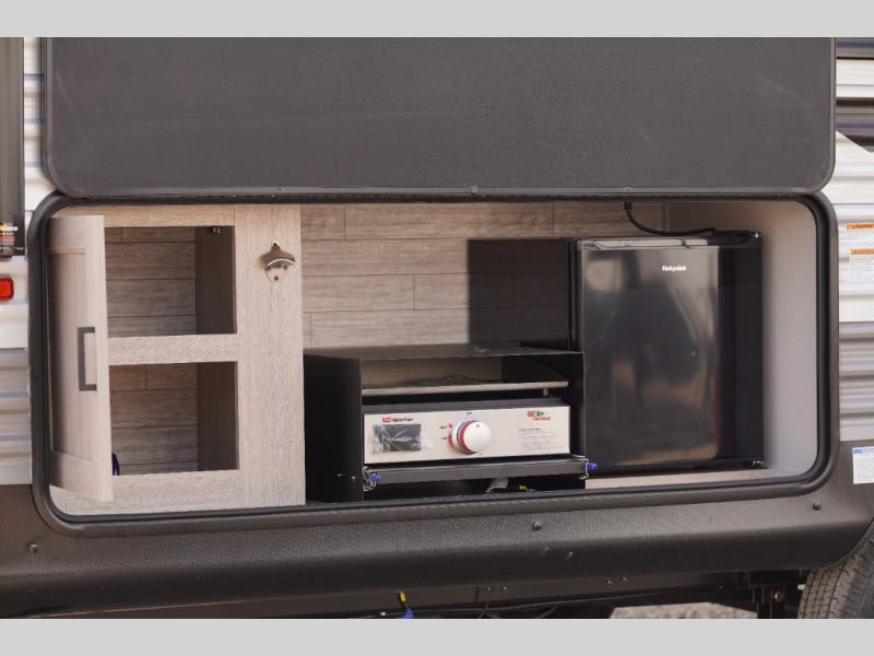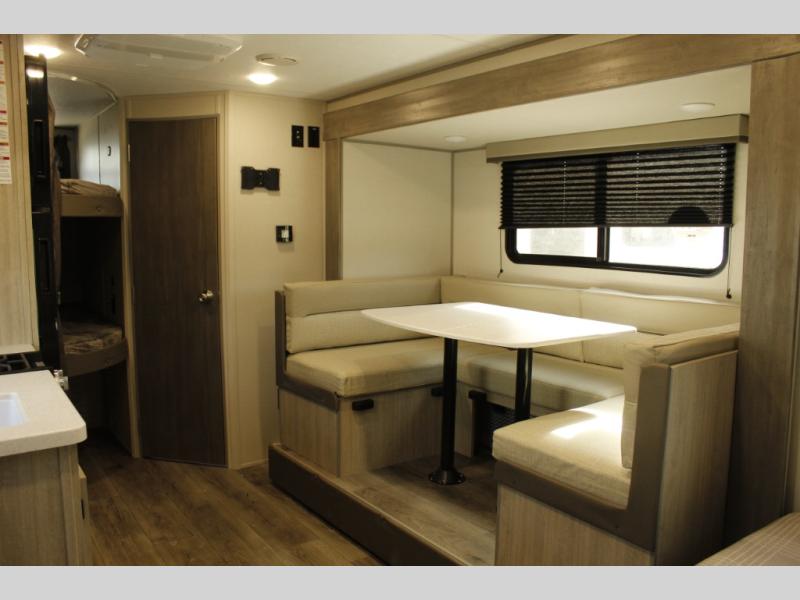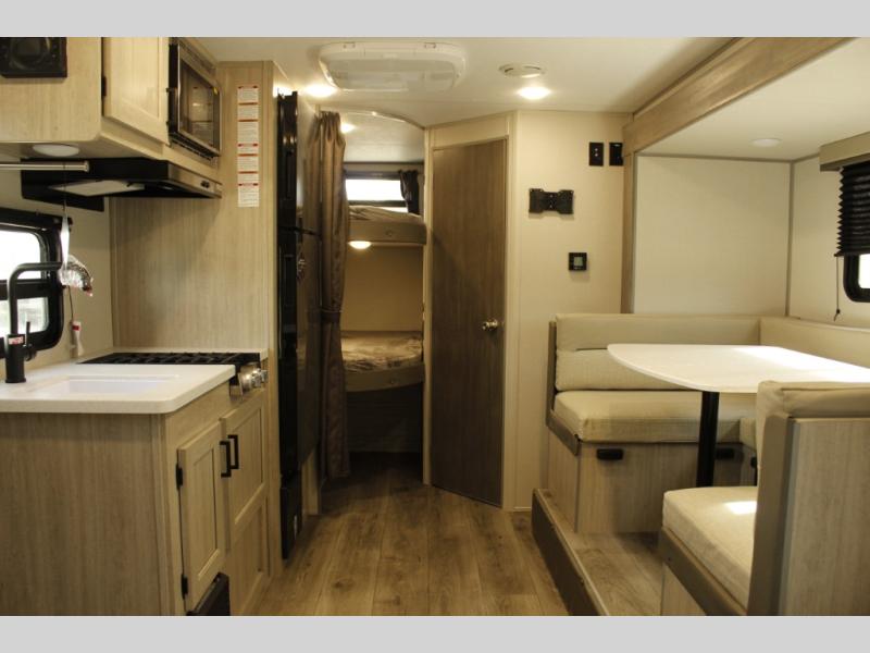 This spacious travel trailer can sleep eight campers each night thanks to the double-size bunks in the back, the U-shaped dinette within the slide out, and the queen bed up front! You can easily make meals for your crew with the two burner cooktop and microwave oven, and leftovers can go in the 10.7 cu. ft. 12V refrigerator! After you've cleaned up in the full bath, head outdoors to relax under the 15' power awning with multicolor LED lights and a remote!