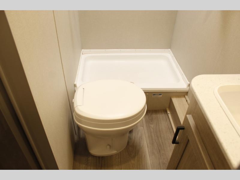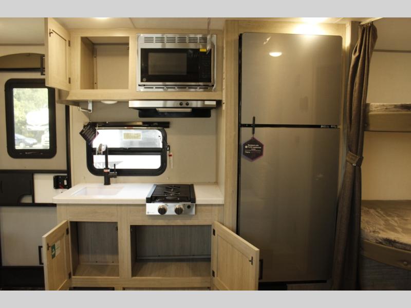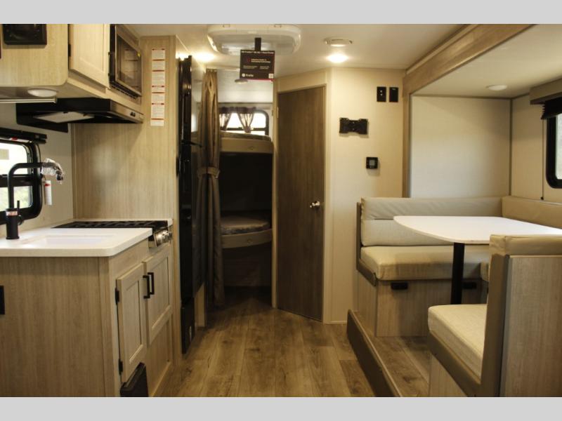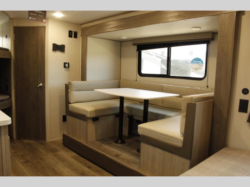 This spacious travel trailer can sleep eight campers each night thanks to the double-size bunks in the back, the U-shaped dinette within the slide out, and the queen bed up front! You can easily make meals for your crew with the two burner cooktop and microwave oven, and leftovers can go in the 10.7 cu. ft. 12V refrigerator! After you've cleaned up in the full bath, head outdoors to relax under the 15' power awning with multicolor LED lights and a remote!