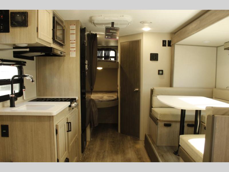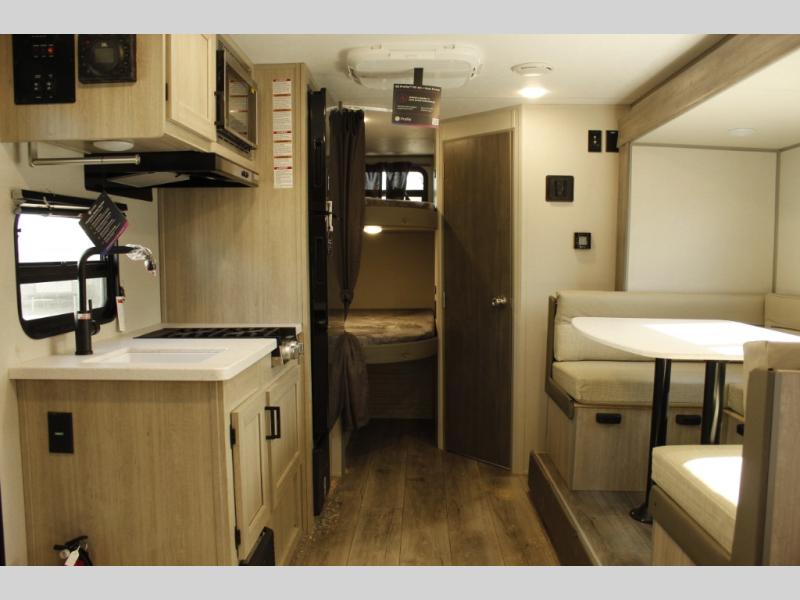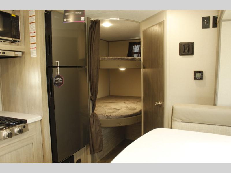 This spacious travel trailer can sleep eight campers each night thanks to the double-size bunks in the back, the U-shaped dinette within the slide out, and the queen bed up front! You can easily make meals for your crew with the two burner cooktop and microwave oven, and leftovers can go in the 10.7 cu. ft. 12V refrigerator! After you've cleaned up in the full bath, head outdoors to relax under the 15' power awning with multicolor LED lights and a remote!