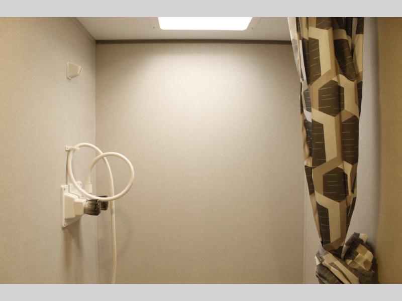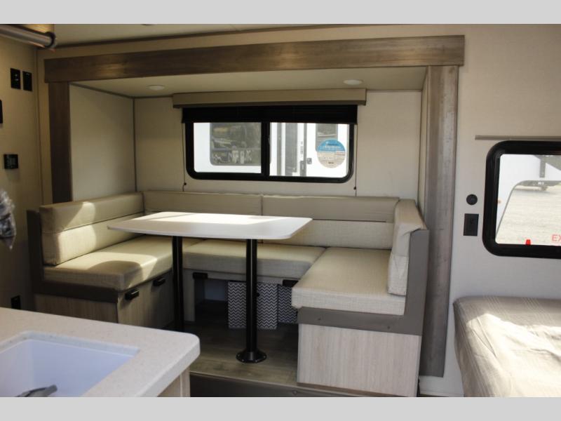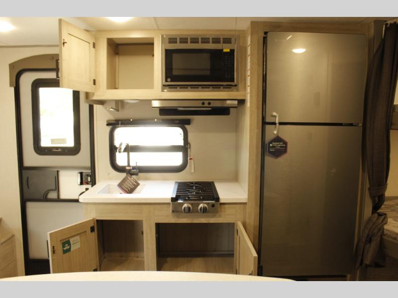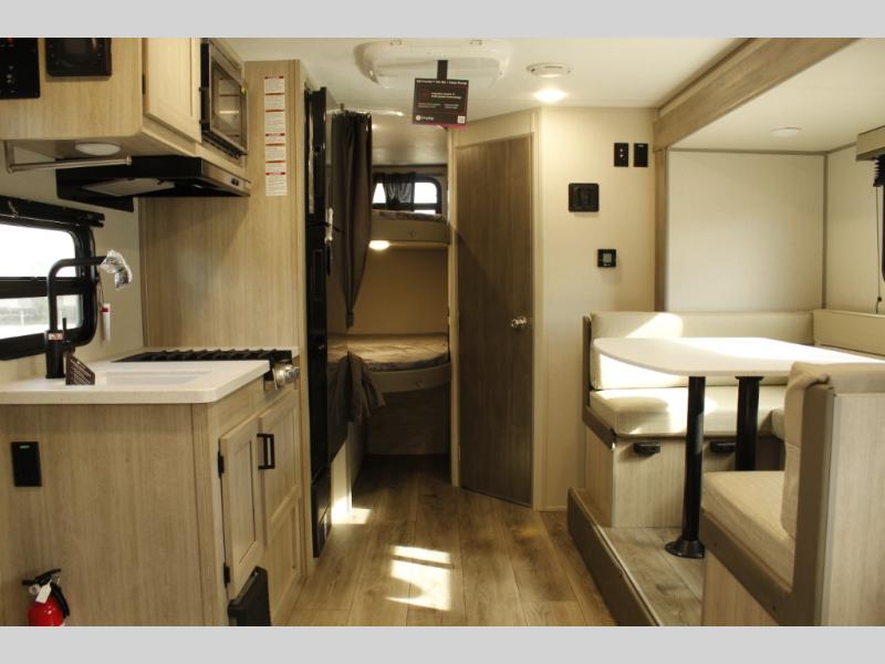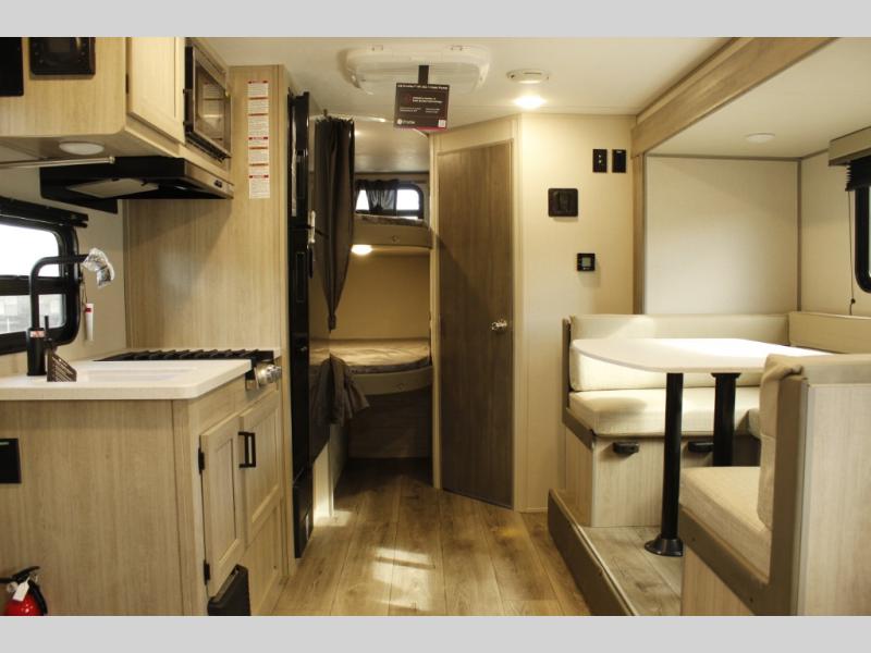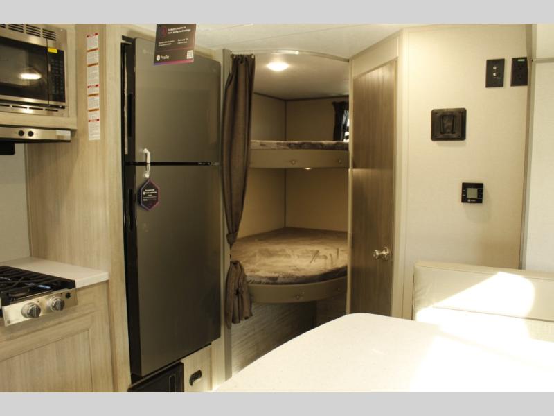 This spacious travel trailer can sleep eight campers each night thanks to the double-size bunks in the back, the U-shaped dinette within the slide out, and the queen bed up front! You can easily make meals for your crew with the two burner cooktop and microwave oven, and leftovers can go in the 10.7 cu. ft. 12V refrigerator! After you've cleaned up in the full bath, head outdoors to relax under the 15' power awning with multicolor LED lights and a remote!