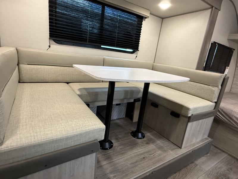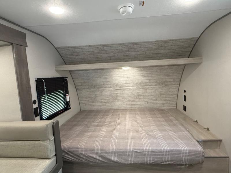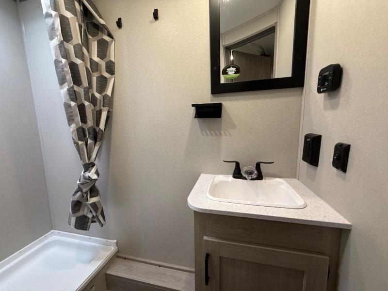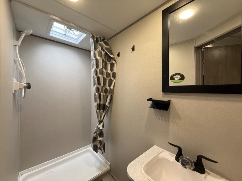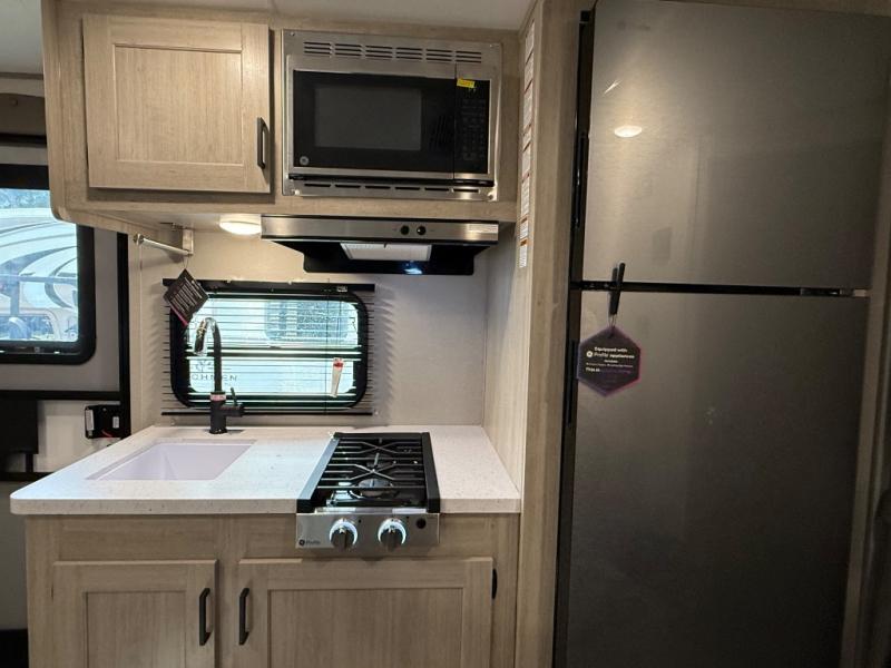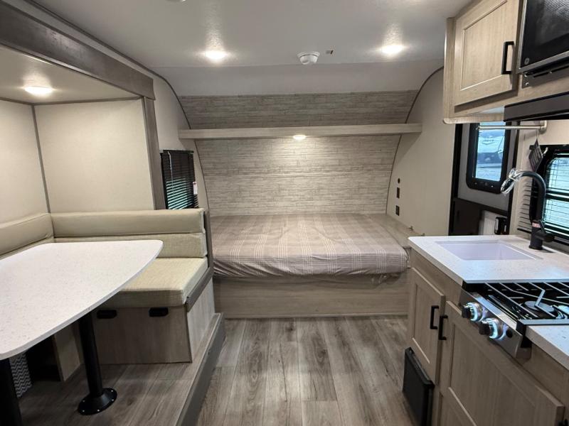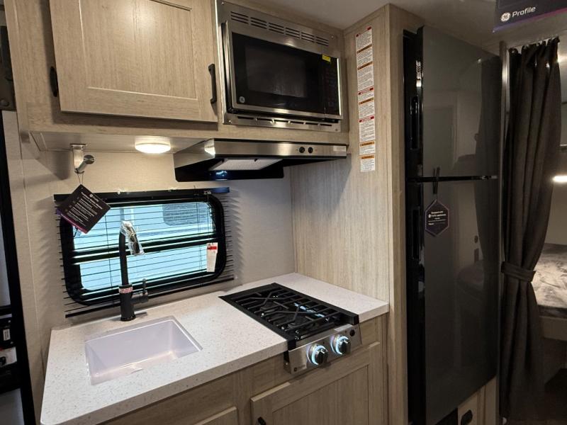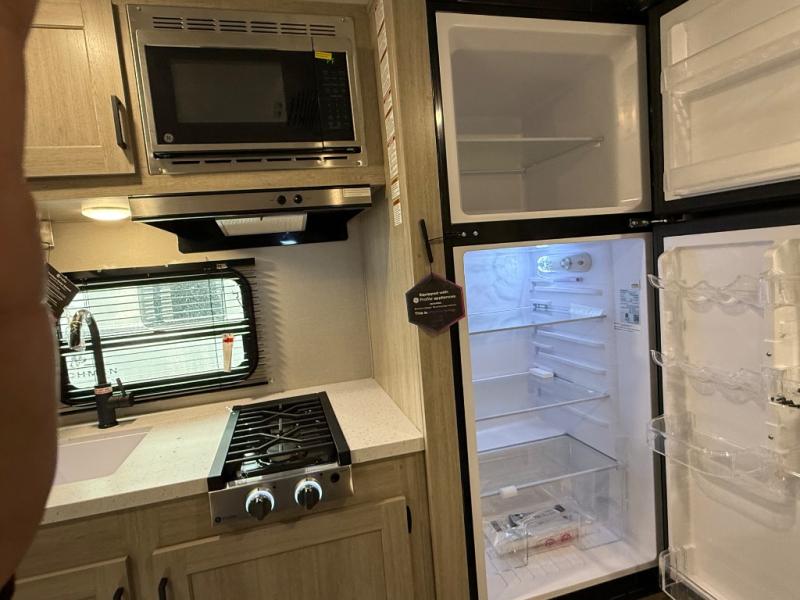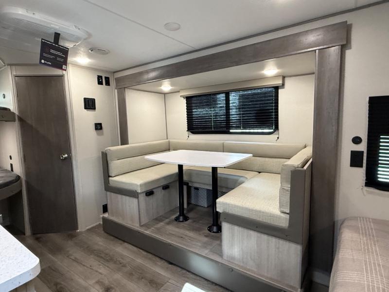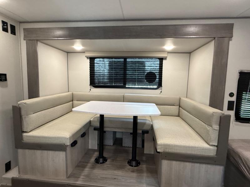 This spacious travel trailer can sleep eight campers each night thanks to the double-size bunks in the back, the U-shaped dinette within the slide out, and the queen bed up front! You can easily make meals for your crew with the two burner cooktop and microwave oven, and leftovers can go in the 10.7 cu. ft. 12V refrigerator! After you've cleaned up in the full bath, head outdoors to relax under the 15' power awning with multicolor LED lights and a remote!