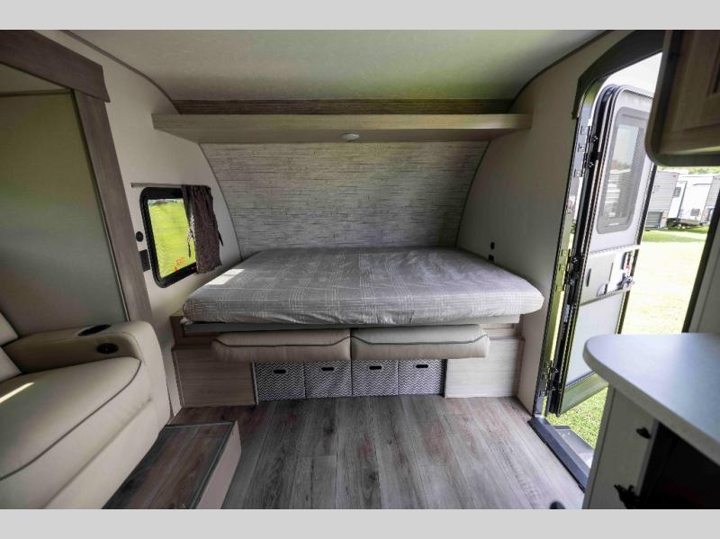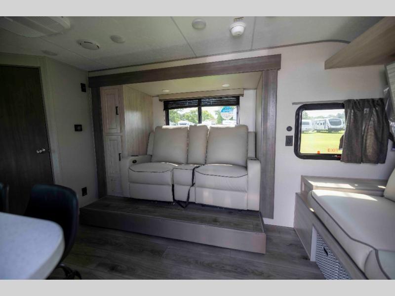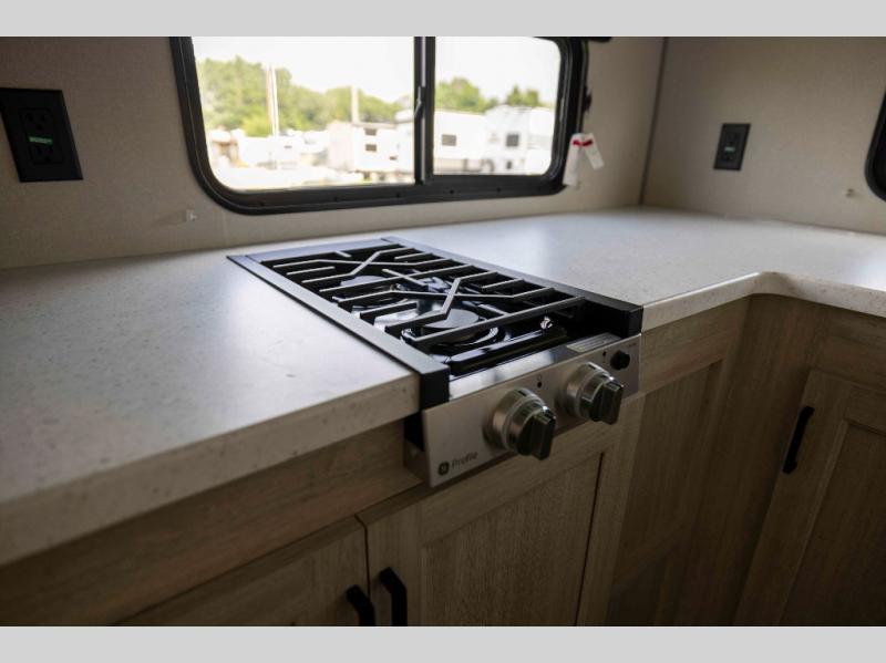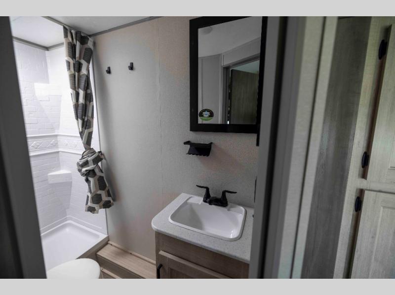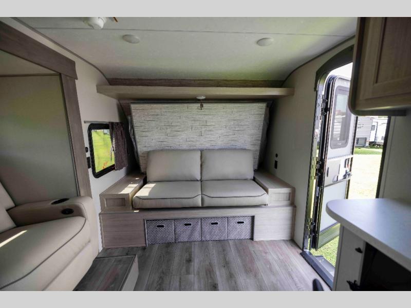 You will love the versatility of this trailer thanks to the Murphy bed and camper kitchen! During the day, with the Murphy bed folded up, you will have plenty of relaxing space with a 60" Jackknife sofa including overhead storage for your things. There is also a slide with theater seating, and a bar top to the left of the entry door with two stools. A rear corner kitchen features everything you need to cook indoors, or you can head outside to use the outdoor Camper Kitchen with mini fridge and griddle. A rear corner bath features a 24" x 32" shower, toilet and sink, plus linen storage as well. Outside, you'll find a 15' power awning with multicolor LED lights and exterior storage for camp gear.