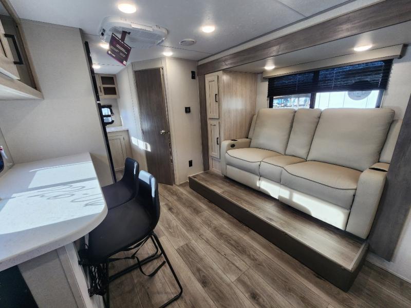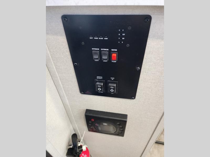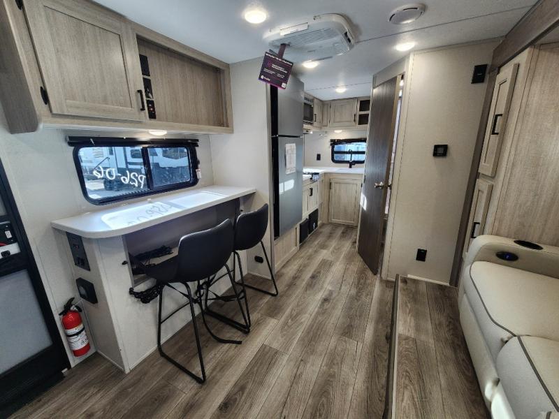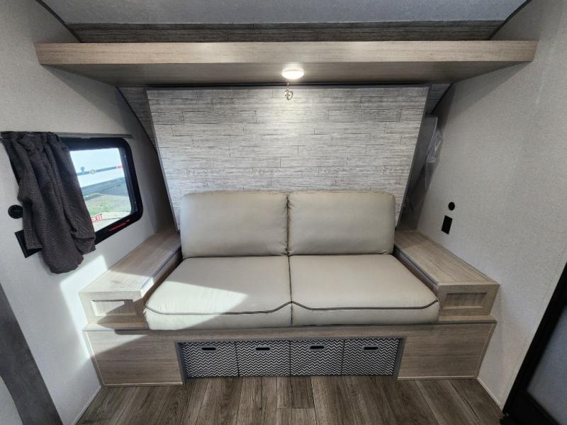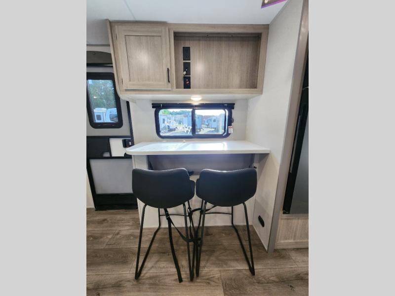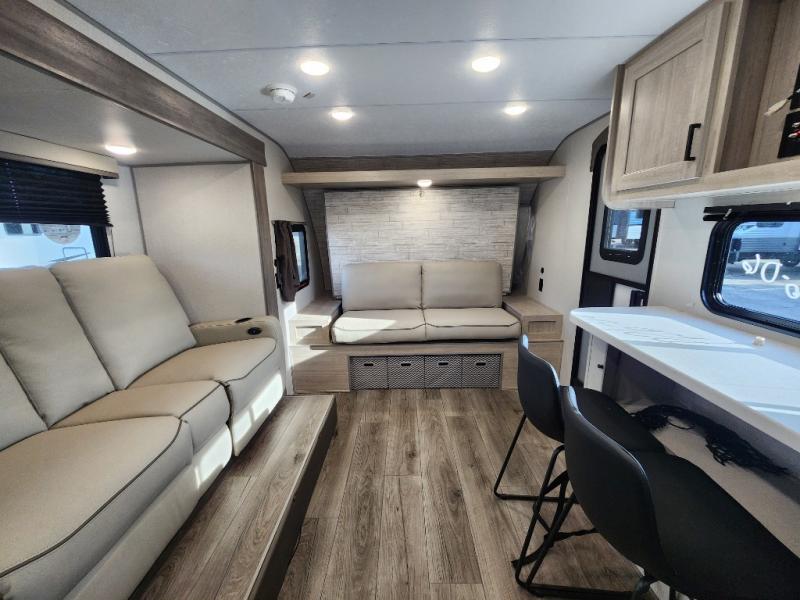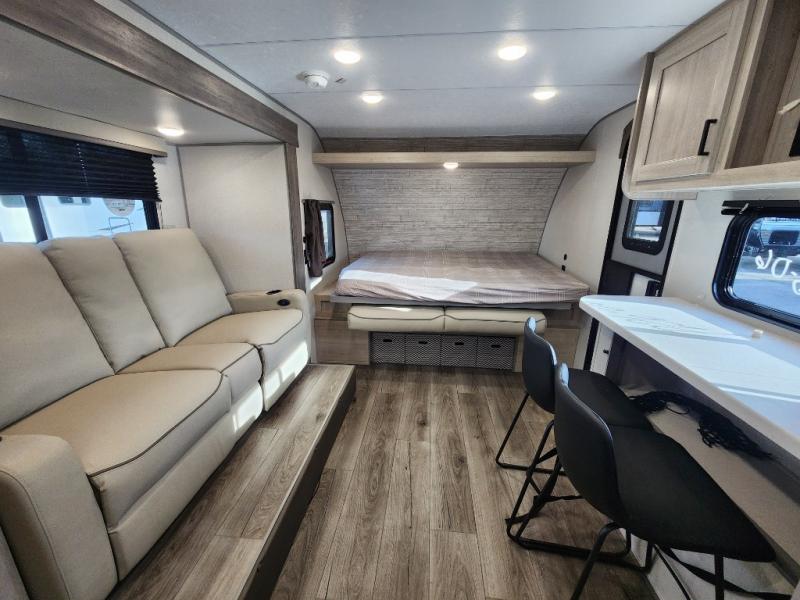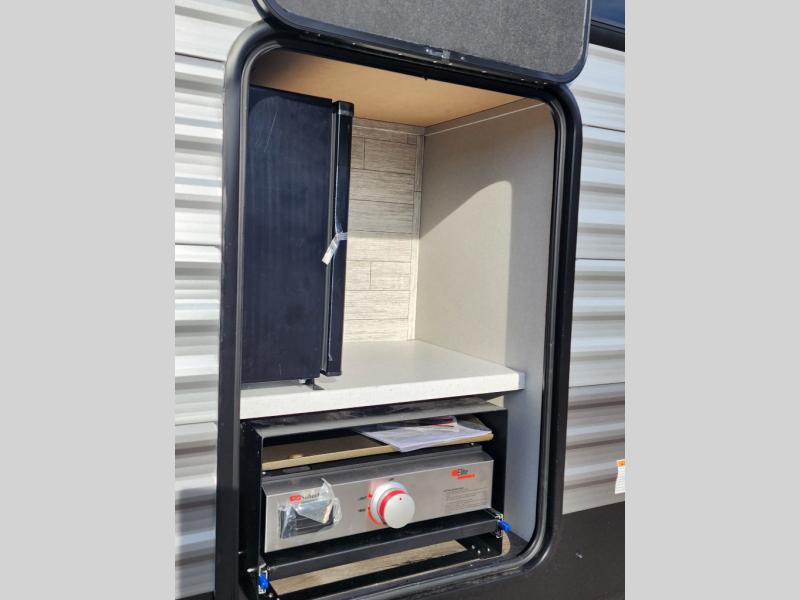 You will love the versatility of this trailer thanks to the Murphy bed and camper kitchen! During the day, with the Murphy bed folded up, you will have plenty of relaxing space with a 60" Jackknife sofa including overhead storage for your things. There is also a slide with theater seating, and a bar top to the left of the entry door with two stools. A rear corner kitchen features everything you need to cook indoors, or you can head outside to use the outdoor Camper Kitchen with mini fridge and griddle. A rear corner bath features a 24" x 32" shower, toilet and sink, plus linen storage as well. Outside, you'll find a 15' power awning with multicolor LED lights and exterior storage for camp gear.