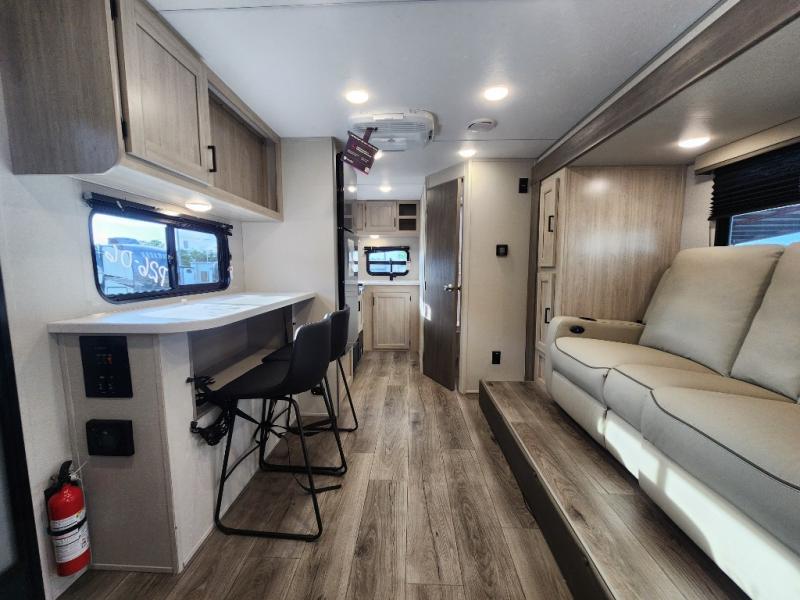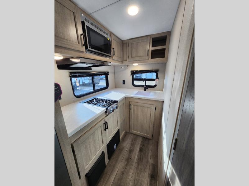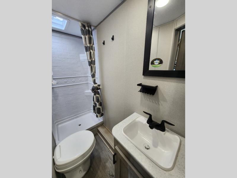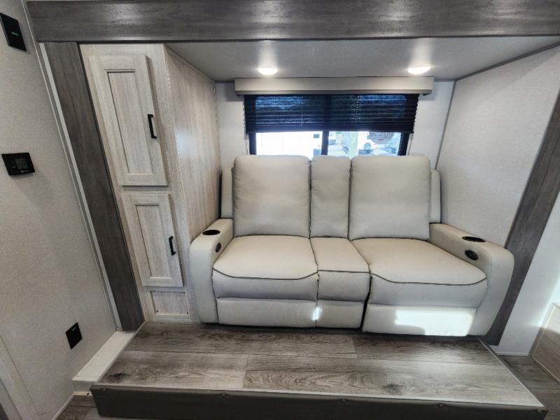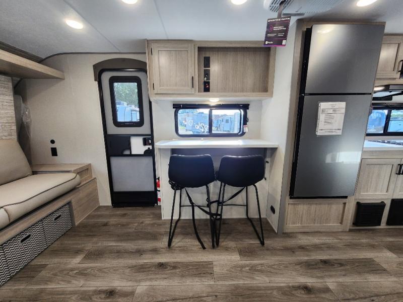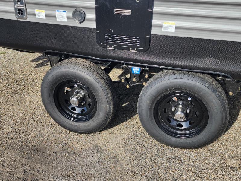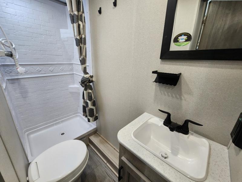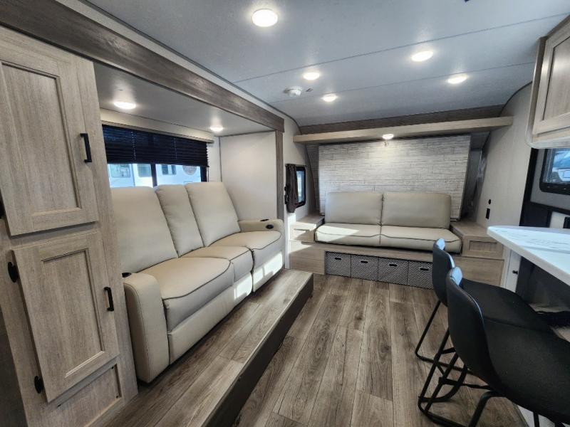 You will love the versatility of this trailer thanks to the Murphy bed and camper kitchen! During the day, with the Murphy bed folded up, you will have plenty of relaxing space with a 60" Jackknife sofa including overhead storage for your things. There is also a slide with theater seating, and a bar top to the left of the entry door with two stools. A rear corner kitchen features everything you need to cook indoors, or you can head outside to use the outdoor Camper Kitchen with mini fridge and griddle. A rear corner bath features a 24" x 32" shower, toilet and sink, plus linen storage as well. Outside, you'll find a 15' power awning with multicolor LED lights and exterior storage for camp gear.