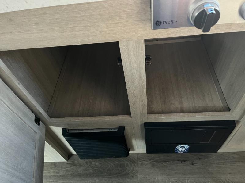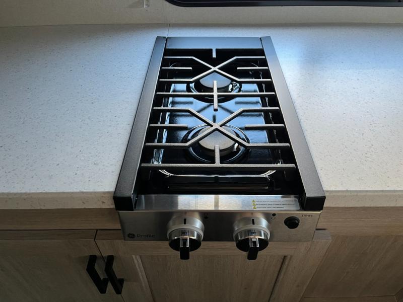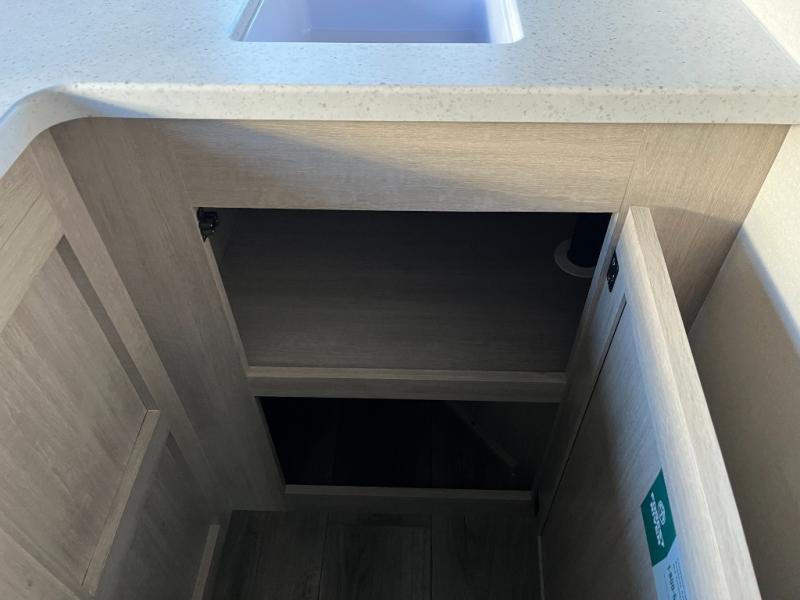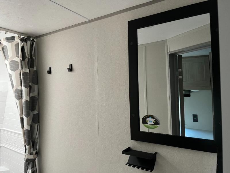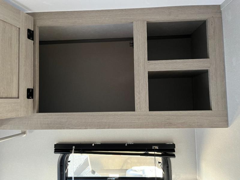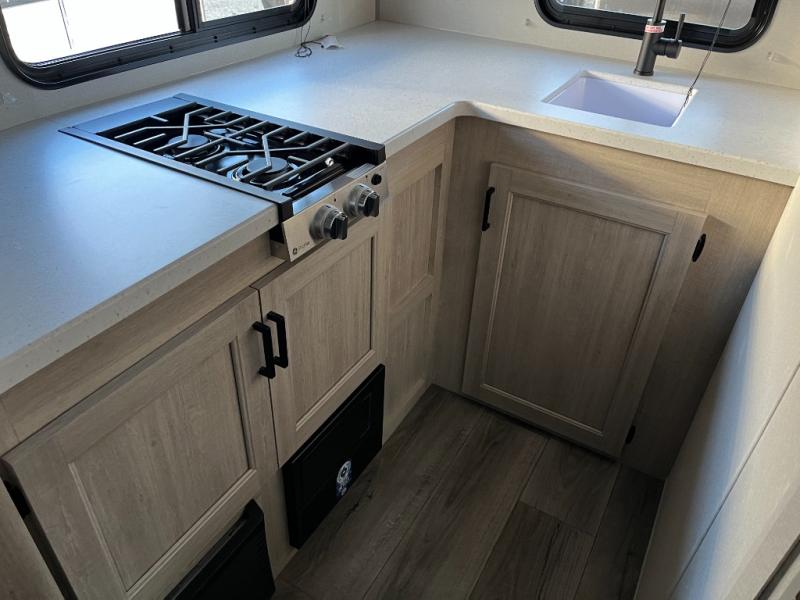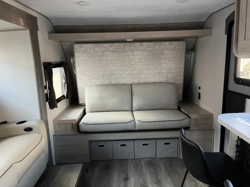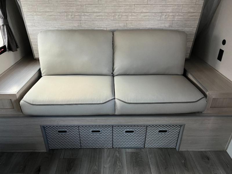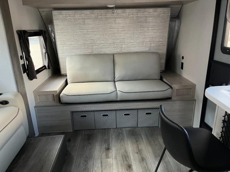 You will love the versatility of this trailer thanks to the Murphy bed and camper kitchen! During the day, with the Murphy bed folded up, you will have plenty of relaxing space with a 60" Jackknife sofa including overhead storage for your things. There is also a slide with theater seating, and a bar top to the left of the entry door with two stools. A rear corner kitchen features everything you need to cook indoors, or you can head outside to use the outdoor Camper Kitchen with mini fridge and griddle. A rear corner bath features a 24" x 32" shower, toilet and sink. Outside, you'll find a 15' power awning with multicolor LED lights and exterior storage for camp gear.
