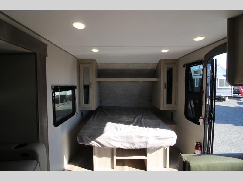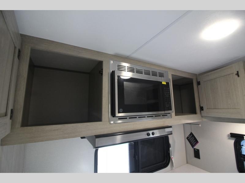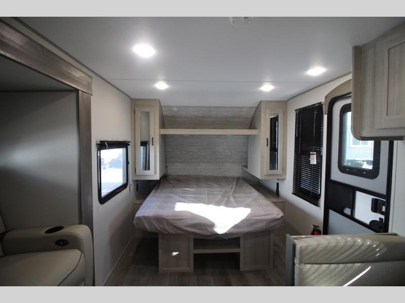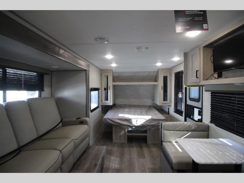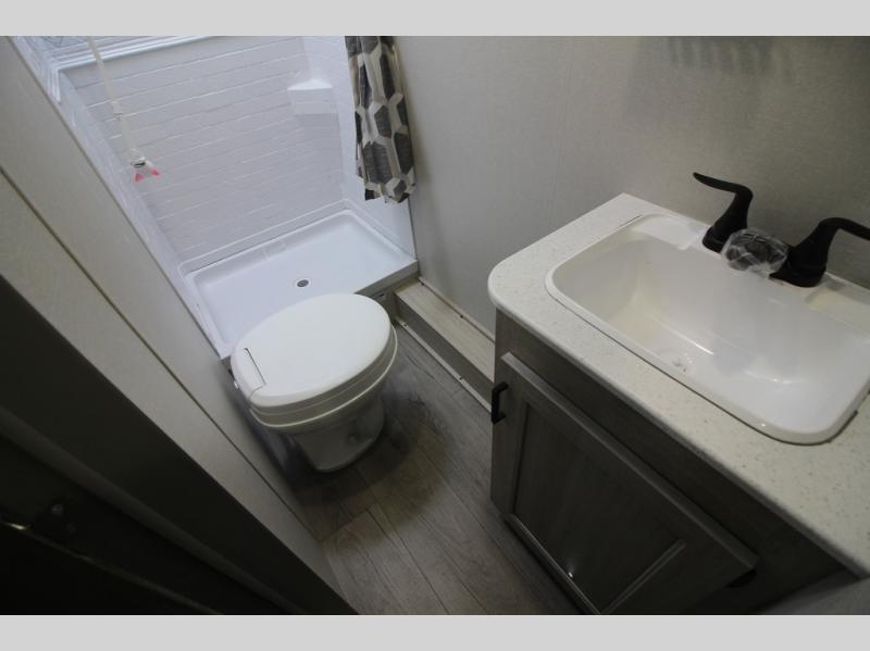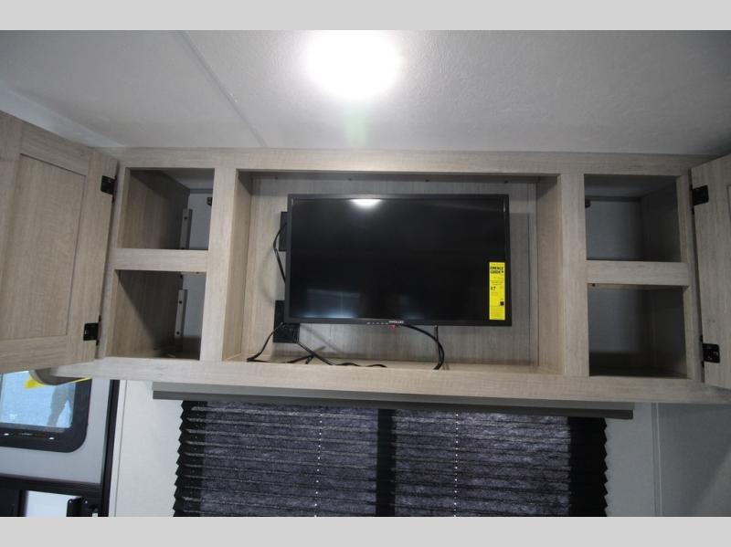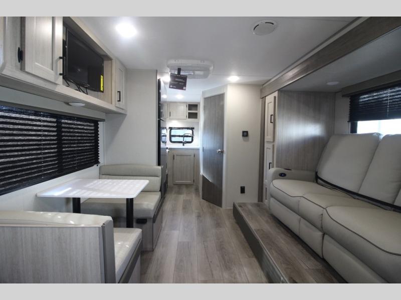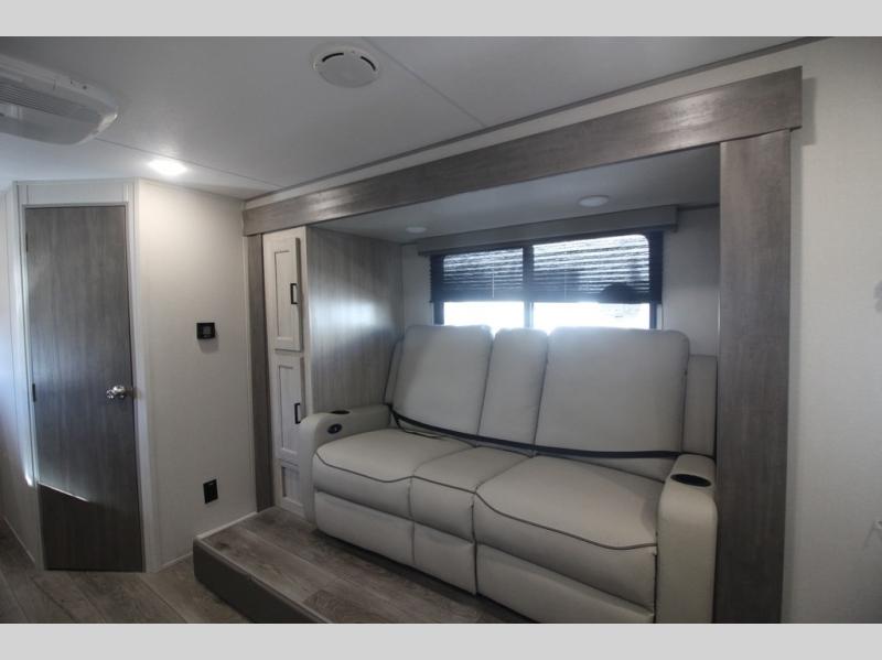 You will love how conventional this travel trailer is! If you want to travel for just a weekend or even more, you won't have to worry since you have all the amenities you need. This model has a queen bed with dual end wardrobes for some extra storage so you can neatly store your clothes. There is also a slide with theater seating, and a booth dinette to enjoy your favorite breakfast. A rear corner kitchen features everything you need to cook indoors, or you can head outside to use the outdoor Camper Kitchen with mini fridge and griddle. A rear corner bath features a 24" x 32" shower, toilet and sink. Outside, you'll find a 17' power awning with multicolor LED lights and exterior storage for camp gear.